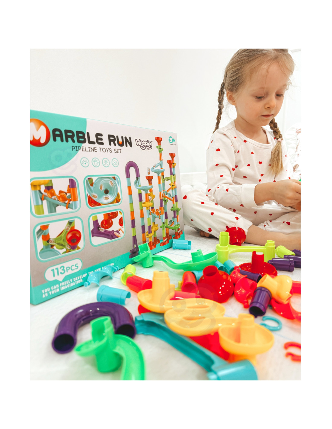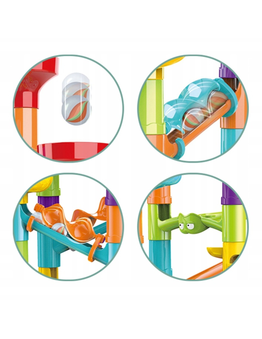 The WOOPIE Ball Track is a spiral track that provides endless fun. This colorful set consists of many different colored pieces that toddlers can easily stack and combine to create imaginative tracks. Additionally, the back of the package includes instructions showing an example track using all the pieces. Release the balls and watch them roll one after another. The set contains 113 pieces , including a launcher and track balls . The size is perfect for little hands and helps develop eye-hand coordination .