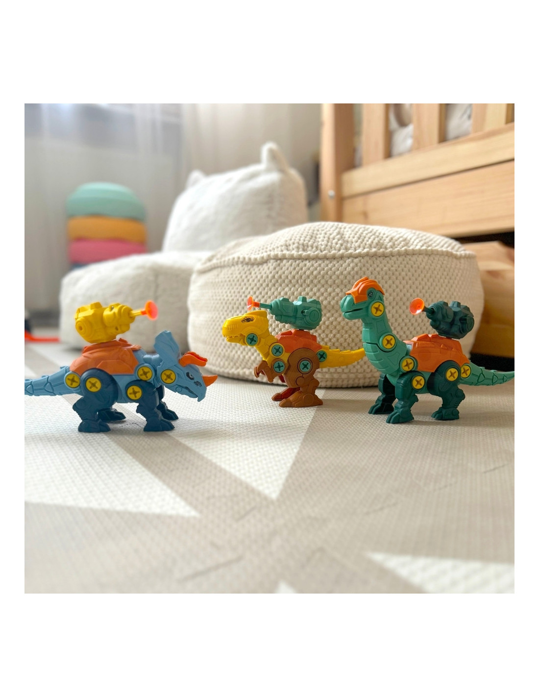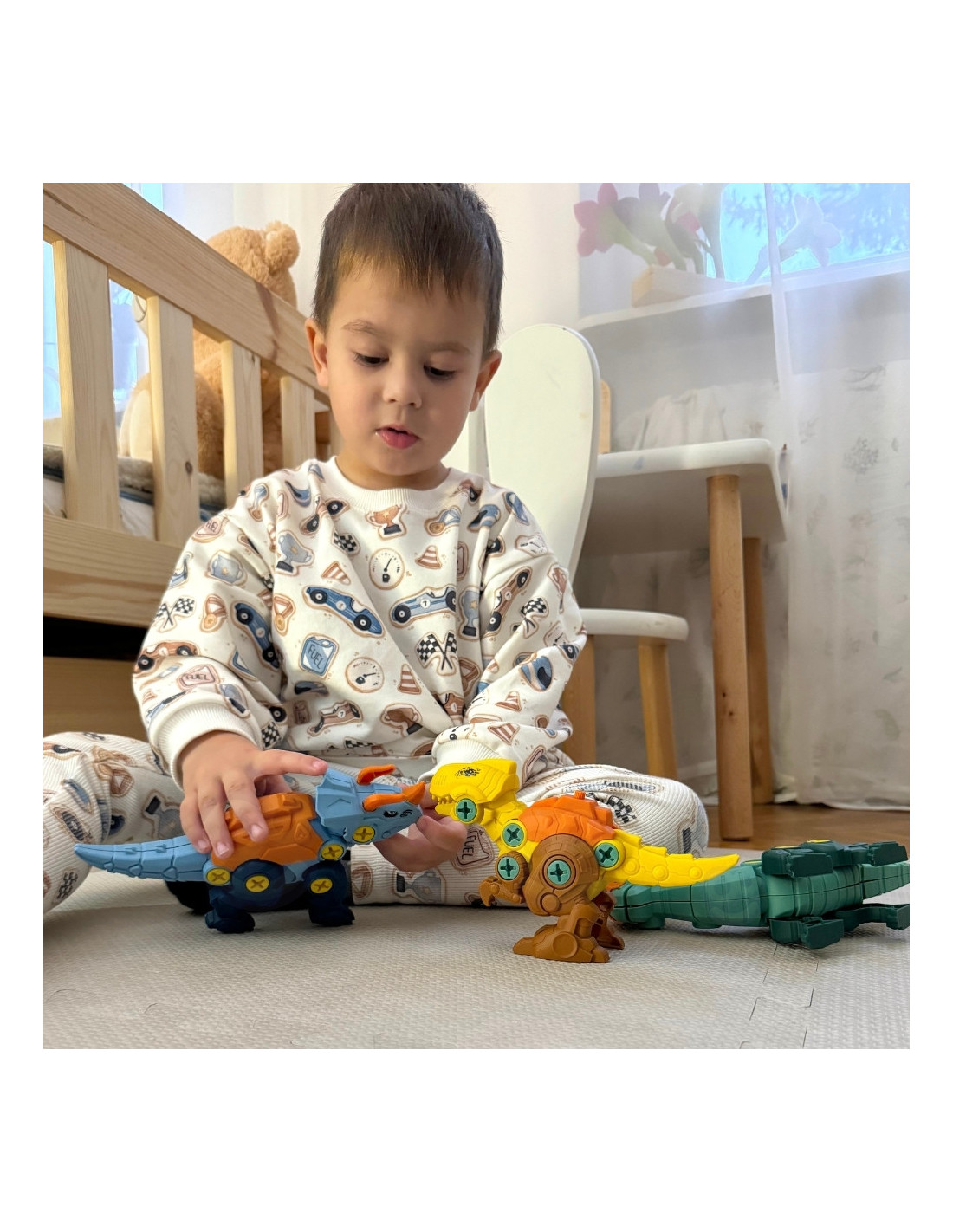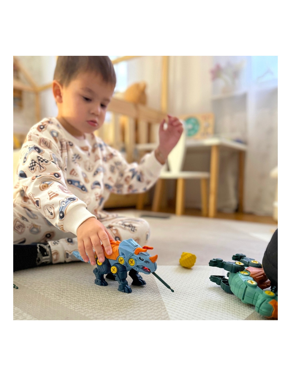 This Dinosaur Set from the renowned WOOPIE brand is a perfect choice for young builders , transporting your child to the fascinating world of prehistory. The set includes three dinosaurs for self-assembly , as well as components that allow you to assemble these prehistoric creatures using a practical screwdriver or a drill with interchangeable bits . The drill can be rotated in both directions, allowing for screwing and unscrewing the components. Once assembled, the dinosaurs have movable parts: a head, tail, and limbs, which expand the play possibilities. This set perfectly develops children's manual skills, or "fine motor skills." The twisting and folding activity transports your child to the world of a little tinkerer, and the dinosaur theme, beloved by all children, further enhances the experience. This toy will develop your child's imagination and creativity while discovering the secrets of prehistory.