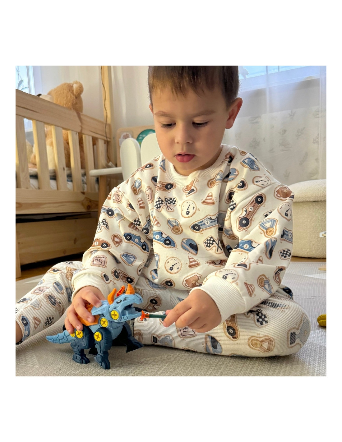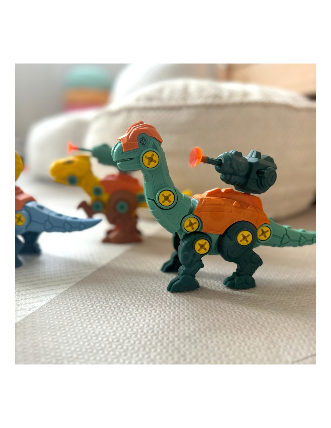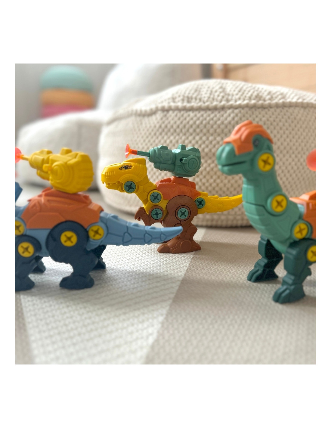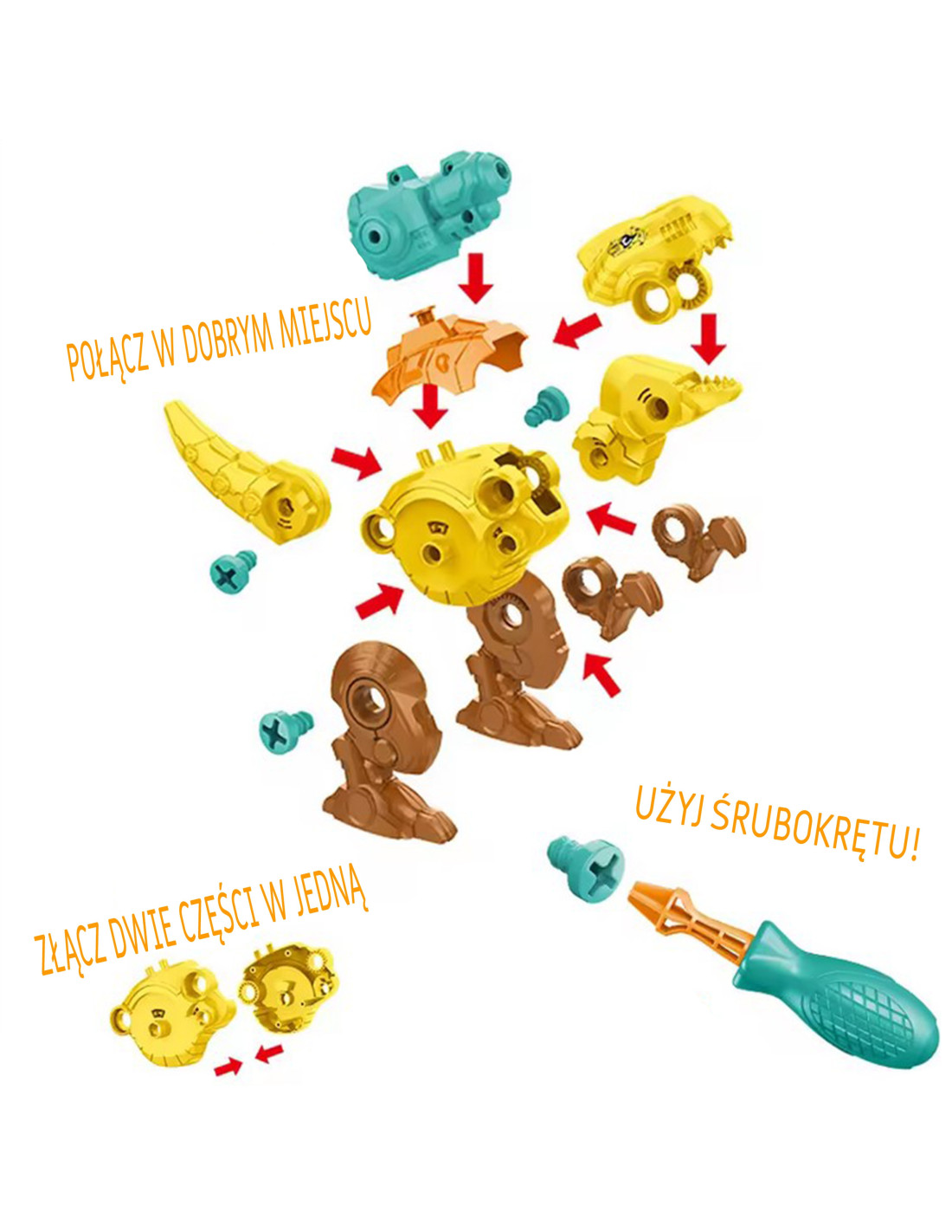 This Dinosaur Set from the renowned WOOPIE brand is a perfect choice for young builders , transporting your child to the fascinating world of prehistory. The set includes three dinosaurs for self-assembly , as well as components that allow you to assemble these prehistoric creatures using a practical screwdriver or a drill with interchangeable bits . The drill can be rotated in both directions, allowing for screwing and unscrewing the components. Once assembled, the dinosaurs have movable parts: a head, tail, and limbs, which expand the play possibilities. This set perfectly develops children's manual skills, or "fine motor skills." The twisting and folding activity transports your child to the world of a little tinkerer, and the dinosaur theme, beloved by all children, further enhances the experience. This toy will develop your child's imagination and creativity while discovering the secrets of prehistory.