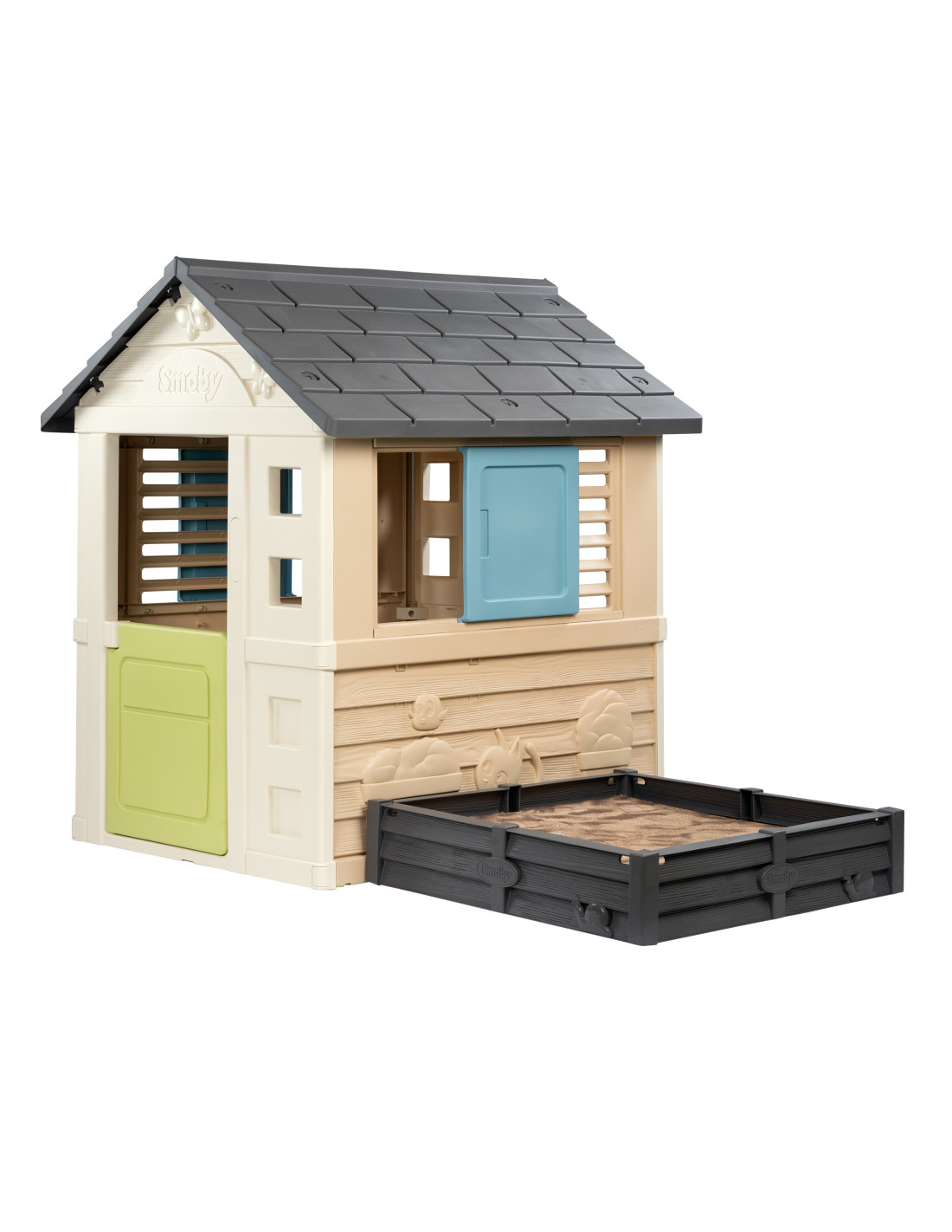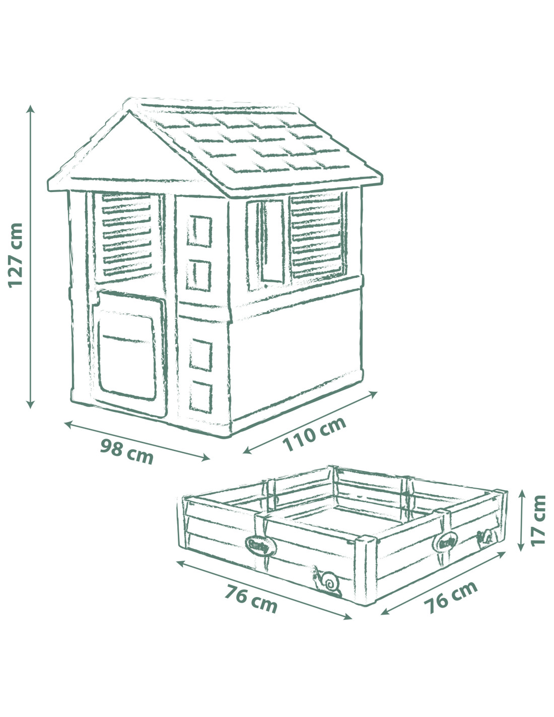 The Smoby Life Garden House with Sandbox is a wonderful place for discovery, experimentation, and shared play. By combining the house with a sandbox or mini garden, little ones can develop their imagination and enjoy outdoor activities. It's the perfect place for playing house, restaurant, or shop, as well as building sandcastles or planting. The spacious house is designed for versatile activities – from themed play to first gardening experiences.