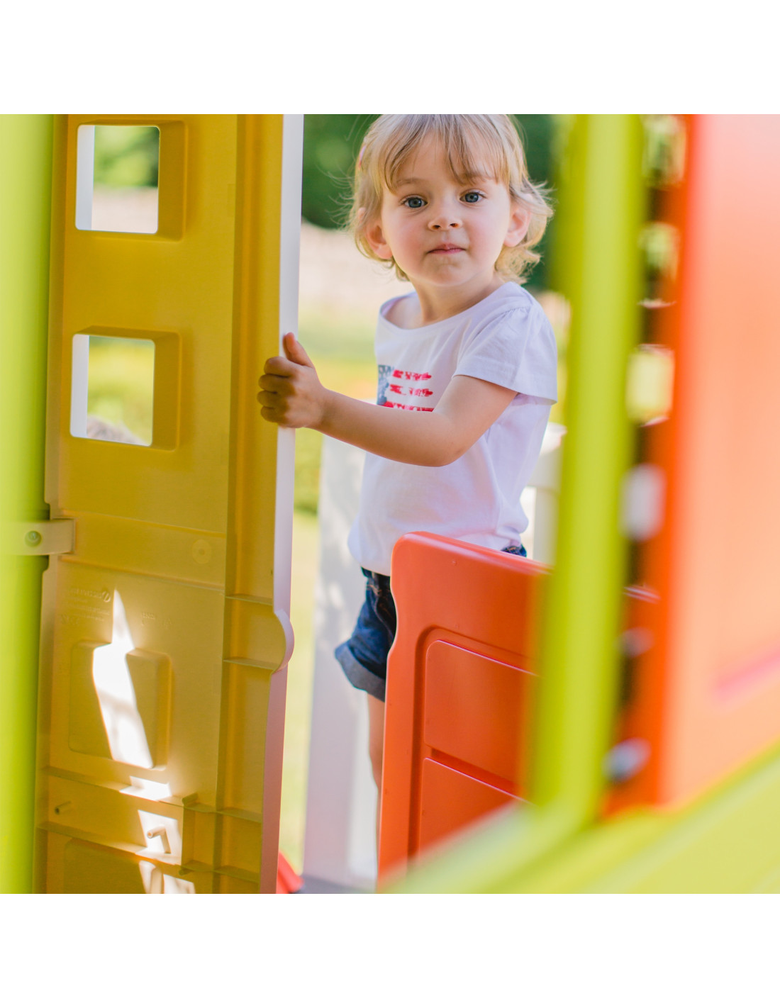 Wykonany z wysokiej jakości tworzywa plac zabaw dominuje biel połączona z czerwienią zjeżdżalni oraz okiennicy, zielenią ścian i szarym dachem.