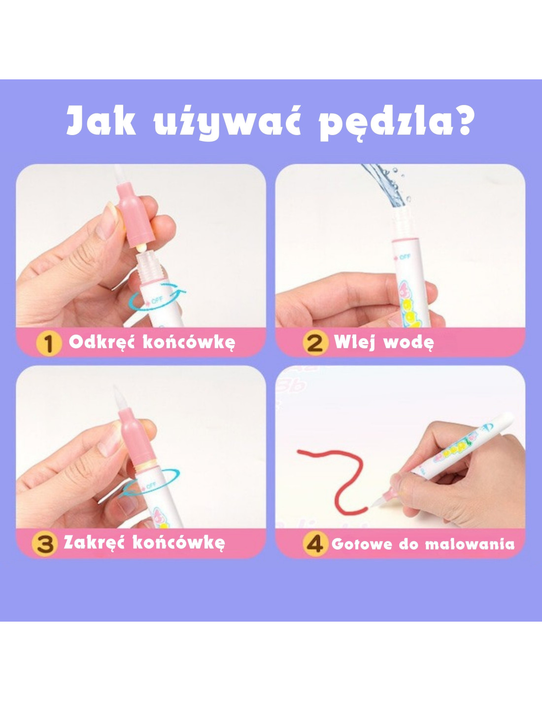 Ignite your child's imagination with the multifunctional 2-in-1 Water Mat from Woopie ! This unique drawing mat combines water painting and UV light drawing . After a few minutes, the drawings gradually disappear, giving your child the opportunity to create endless new masterpieces. The fairytale-like girly motif, full of balloons, unicorns, castles, and stars, will transport your child to a magical world of creative play. Just a little water is enough to create colorful masterpieces—no ink, no dirt, and no risk of damage. Perfect for solo play or with siblings, friends, or parents. The mat improves manual dexterity and hand-eye coordination. and is a great way to learn through play. It can be used both at home and in the garden.