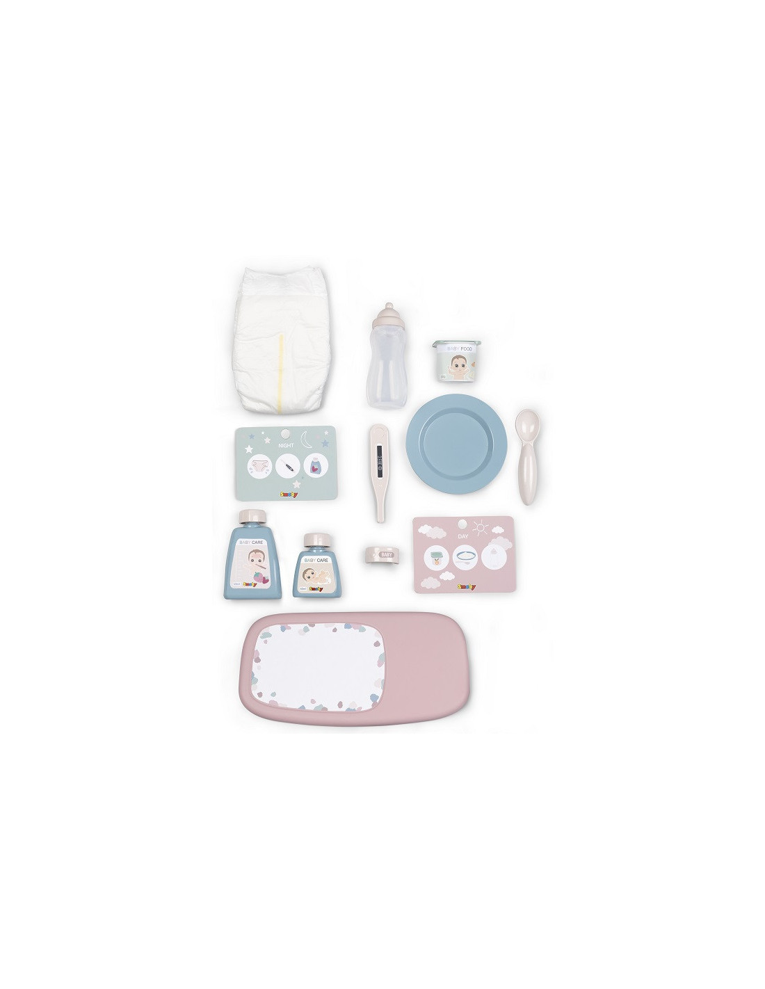 - - in the suitcase you will find - diapers/nappy, bottle, imitation yogurt, plate, spoon, thermometer, armband, 2 bottles (imitation cosmetics), pad, card with a day and night plan,