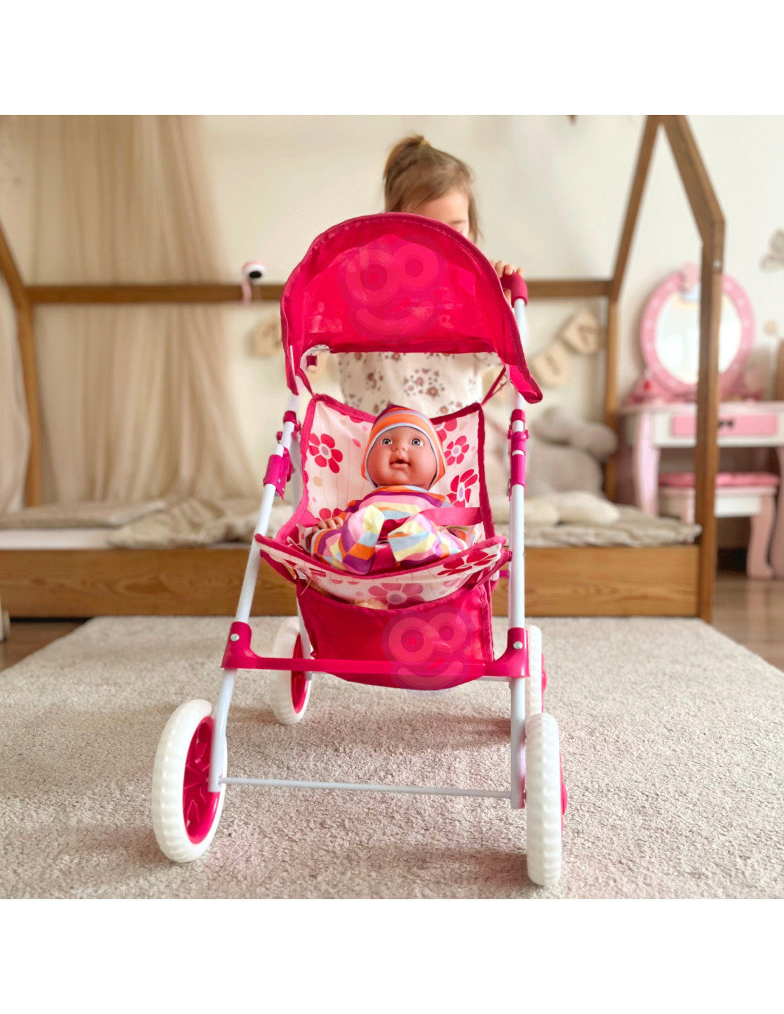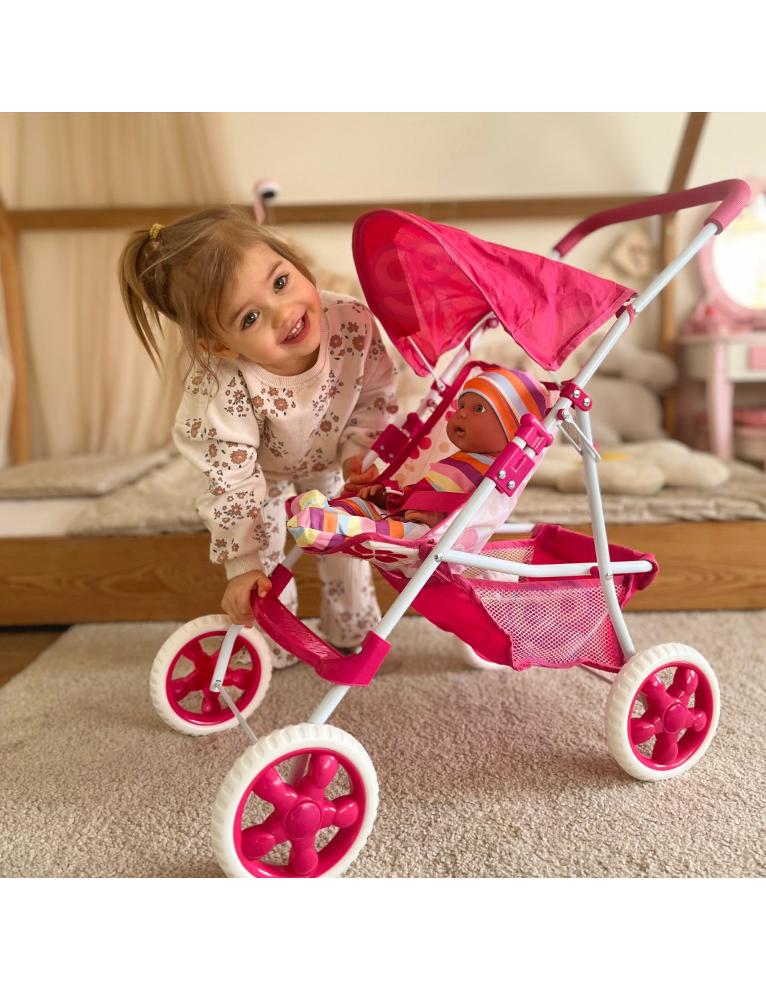 The Woopie doll stroller is the perfect choice for any little girl who loves playing house. It boasts a lightweight yet very stable frame, ensuring comfort and safety during use. Equipped with a footrest, a sun canopy, safety harnesses, and a practical basket for small items, it guarantees full functionality and comfort. It also features a soft handle for easy maneuvering and quiet, grippy foam wheels, perfect for both home and walks. When playtime is over, the stroller folds easily, saving space during storage. The stylish design makes it a unique addition to any doll's collection.