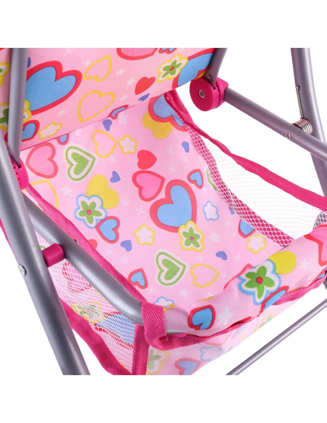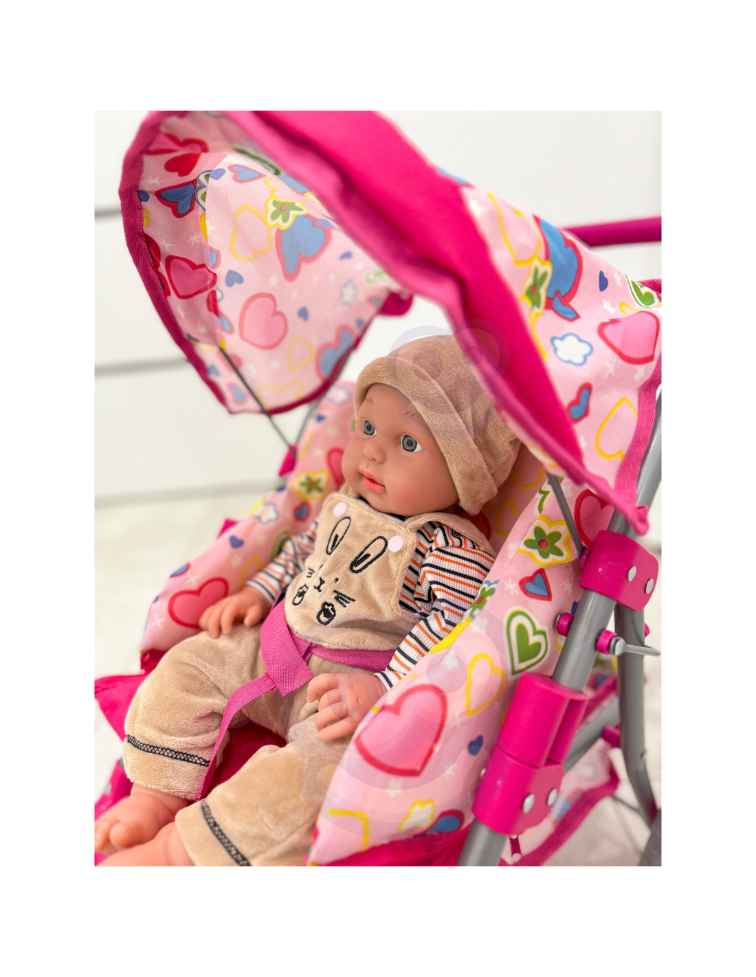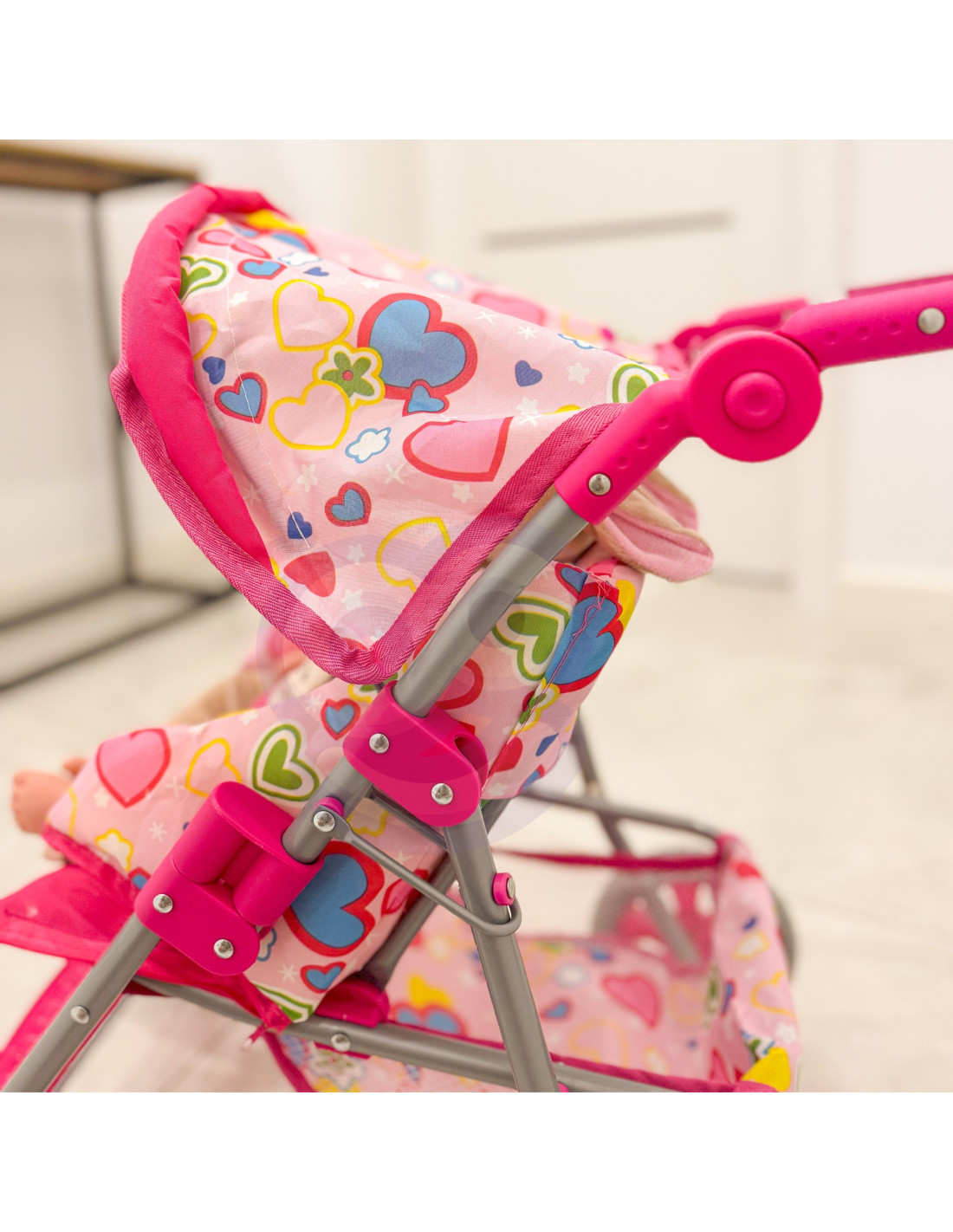 The Woopie doll stroller is the perfect choice for any little girl who loves playing house. Its lightweight yet very stable frame ensures comfort and safety during use. Equipped with a footrest, a sun canopy, safety harnesses, and a practical basket for small items, it guarantees full functionality and comfort. Additionally, it has a soft handle for easy maneuvering and quiet, grippy foam wheels, perfect for both home and walks. When playtime is over, the stroller easily folds up, saving space during storage. Its stylish design makes it a unique addition to any doll .