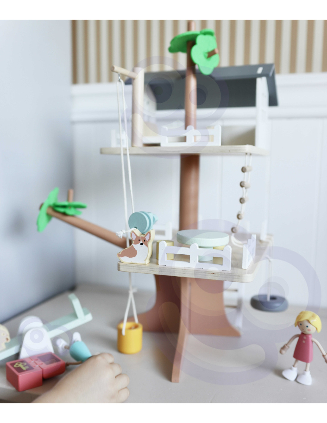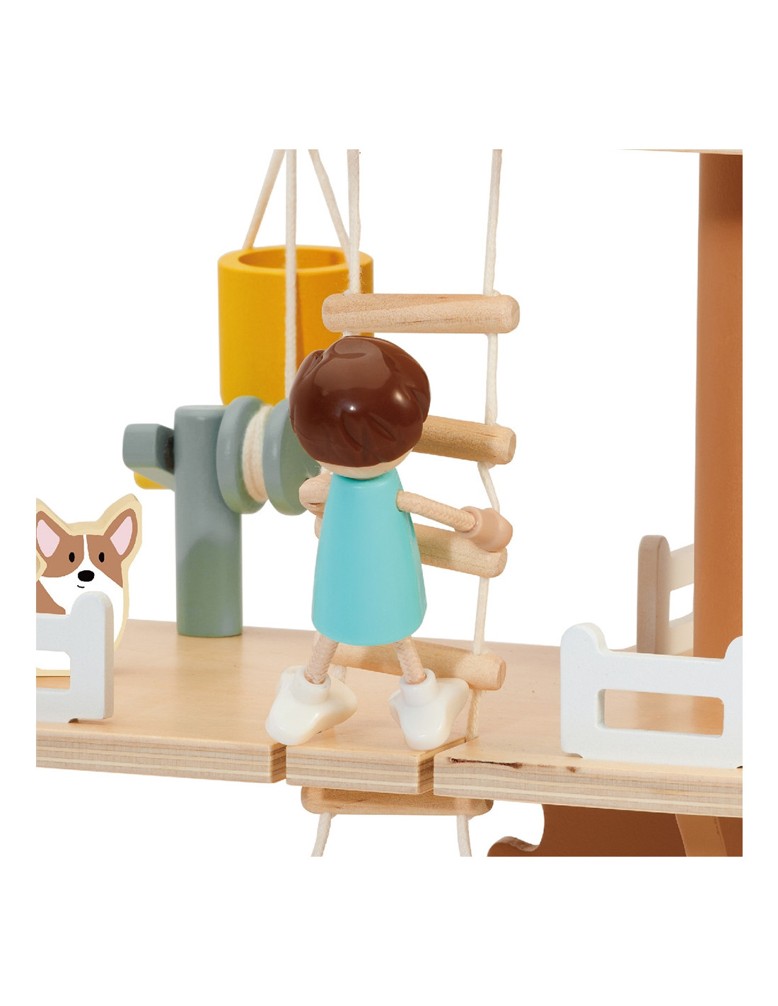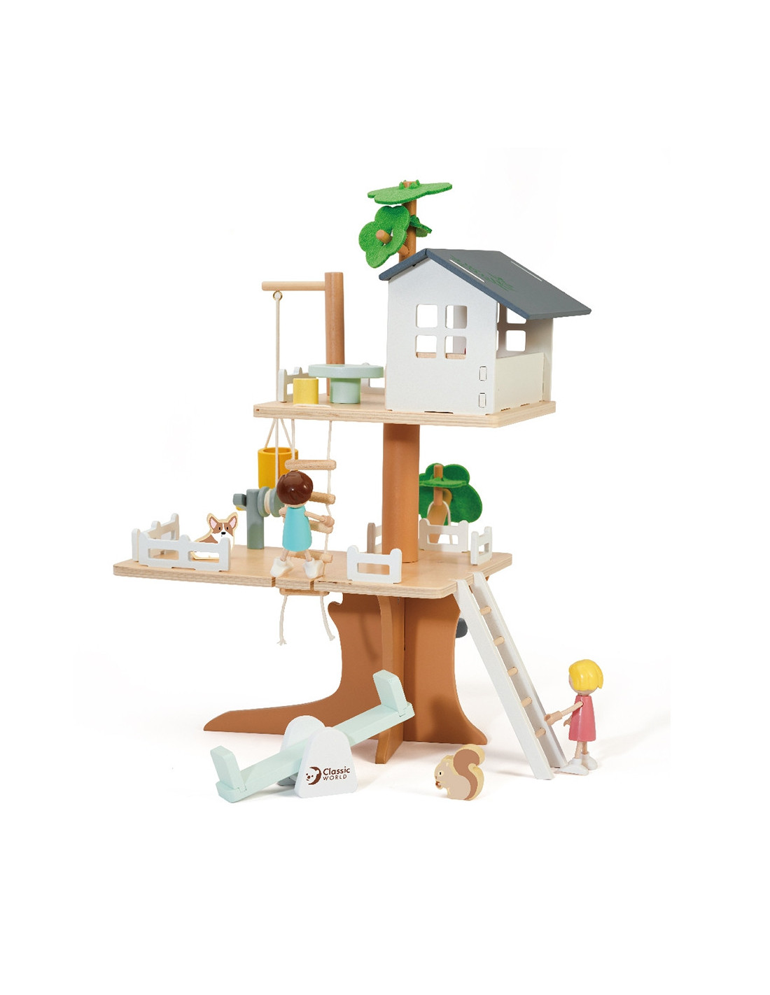 The Tree House from CLASSIC WORLD will provide your child with endless fun! This unique dollhouse will spark your child's imagination . The house is fully functional . The boy doll can pull the bucket with a pulley, the girl can play with the puppy, and the squirrel can eat the pine cone. The dolls can swing on the swings and climb the ladder to the treehouse. The set includes 2 child figures, 2 animals, and wonderful accessories, including a seesaw, tire seesaw, bucket, treasure chest, bed, table, and chairs. The set is made of natural wood . This unique house will encourage your child to create stories and adventures for their little dolls.