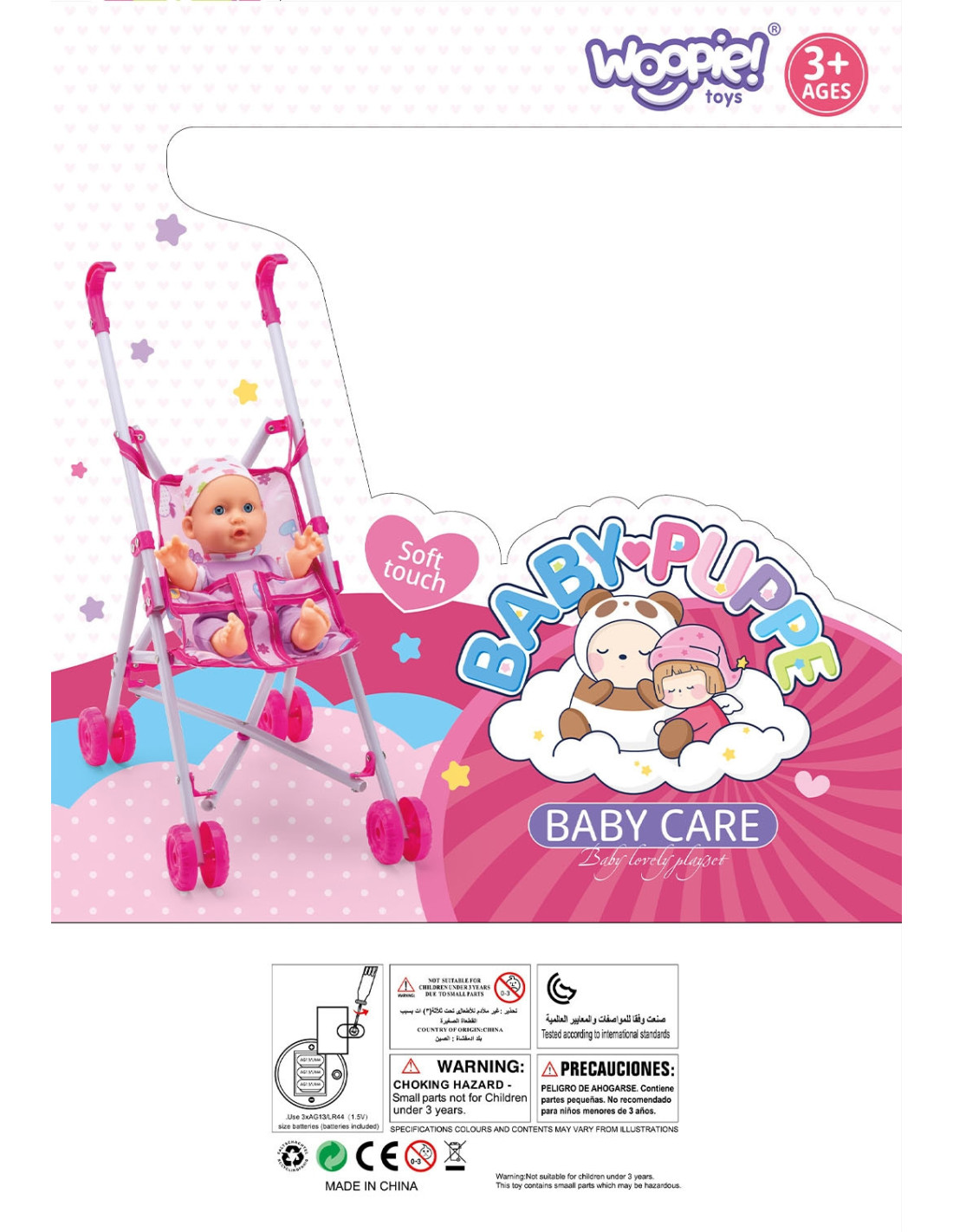 The Baby Doll with Stroller and Feeding Set from WOOPIE is the perfect first doll for children who want to imitate adult behaviors when caring for children. The doll makes sounds like mom, dad, crying, and laughing, adding even more realism to the play experience. The child can feed her or take her for walks thanks to the included stroller.