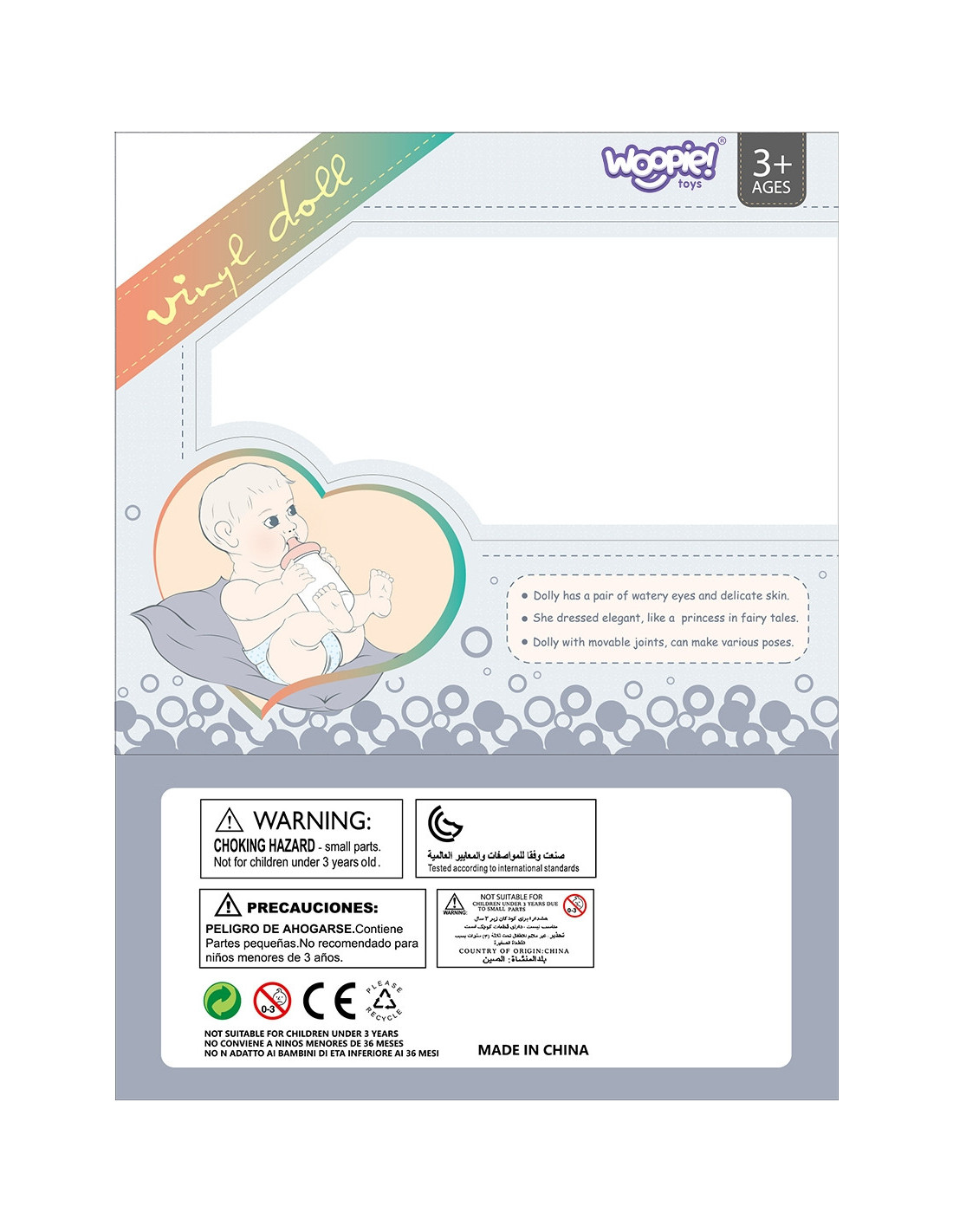 My adorable baby from Woopie Royal is a product your child will love. It has movable limbs and beautiful , eye-catching eyes . The doll is dressed in a charming pink bodysuit and comes with a matching hat and socks. The set also includes a pink bottle that the doll can hold.