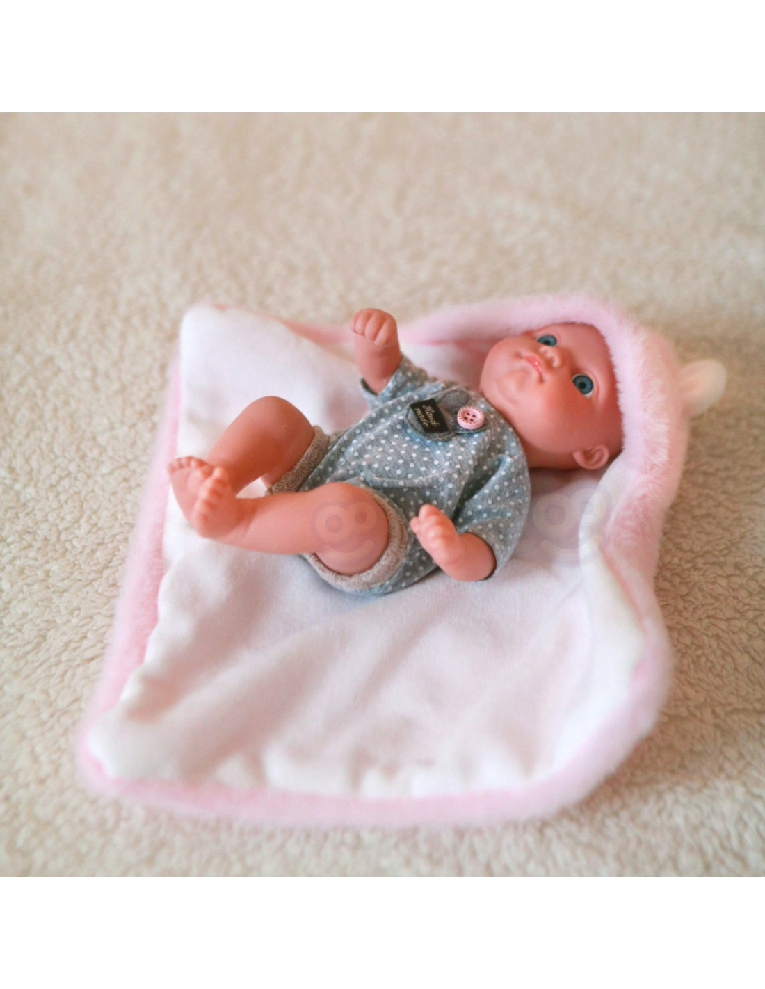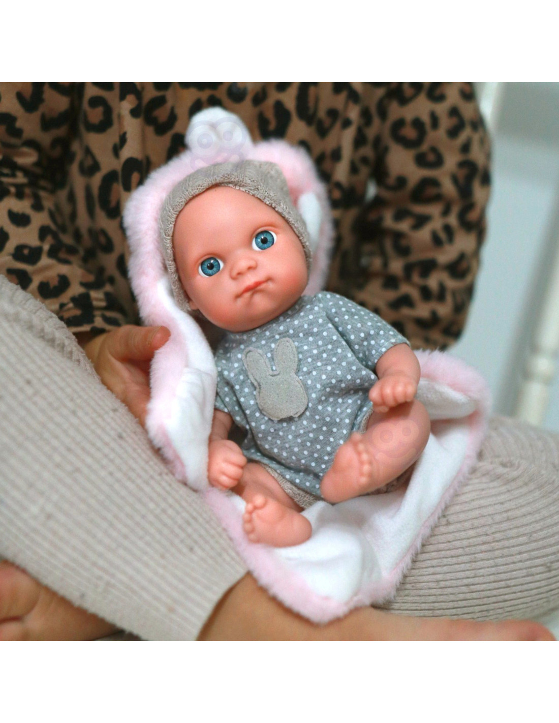 This adorable doll has a face that's always ready for a smile and a warm look . Her realistic hands, feet, face, and body are made of soft rubber. She's dressed in adorable handmade rompers, perfect for cuddling . The baby comes with a pink blanket that transforms into a tent, a carrier, or simply the perfect cover for cold days. Additionally, the blanket with ears makes the doll even more adorable and unique .