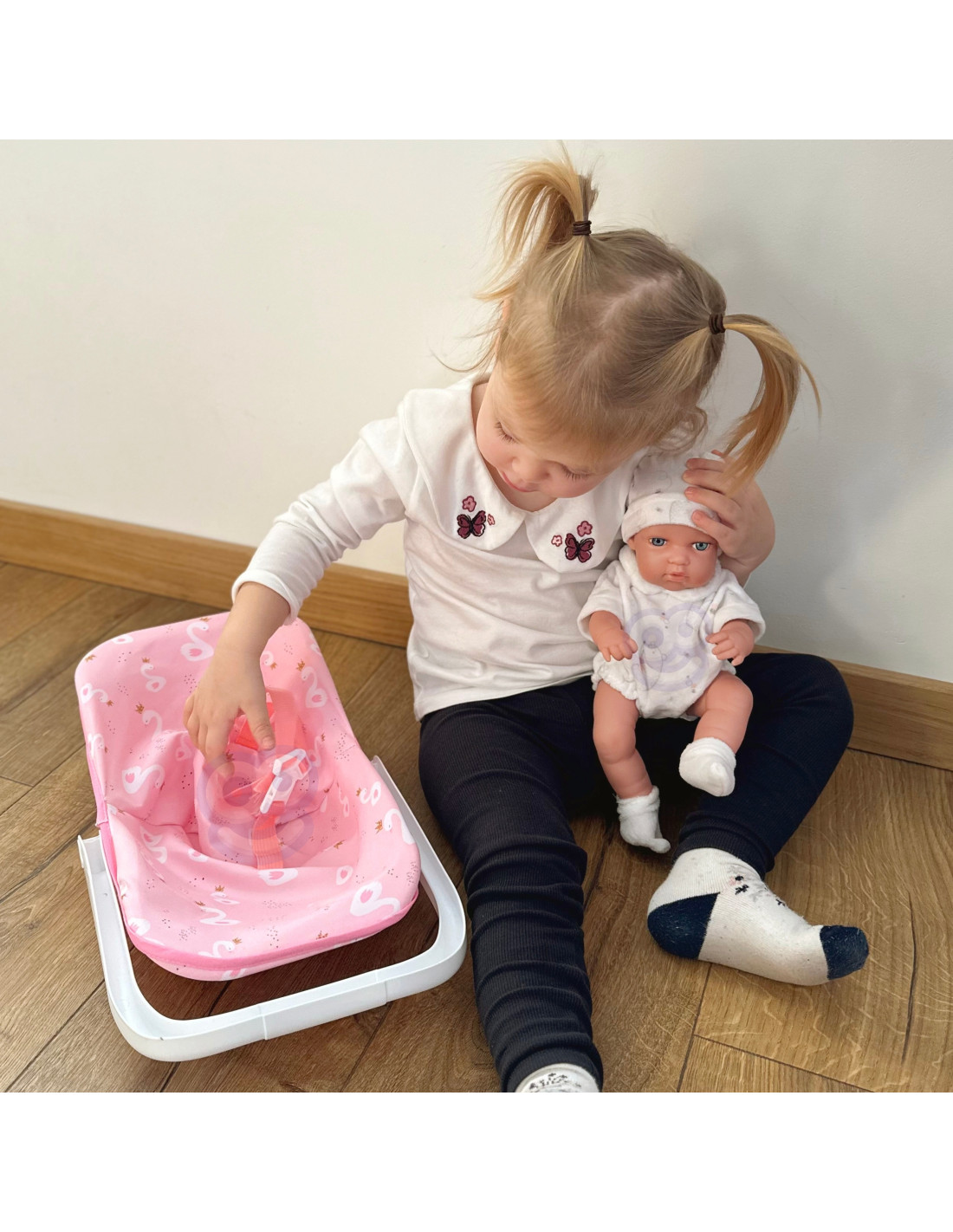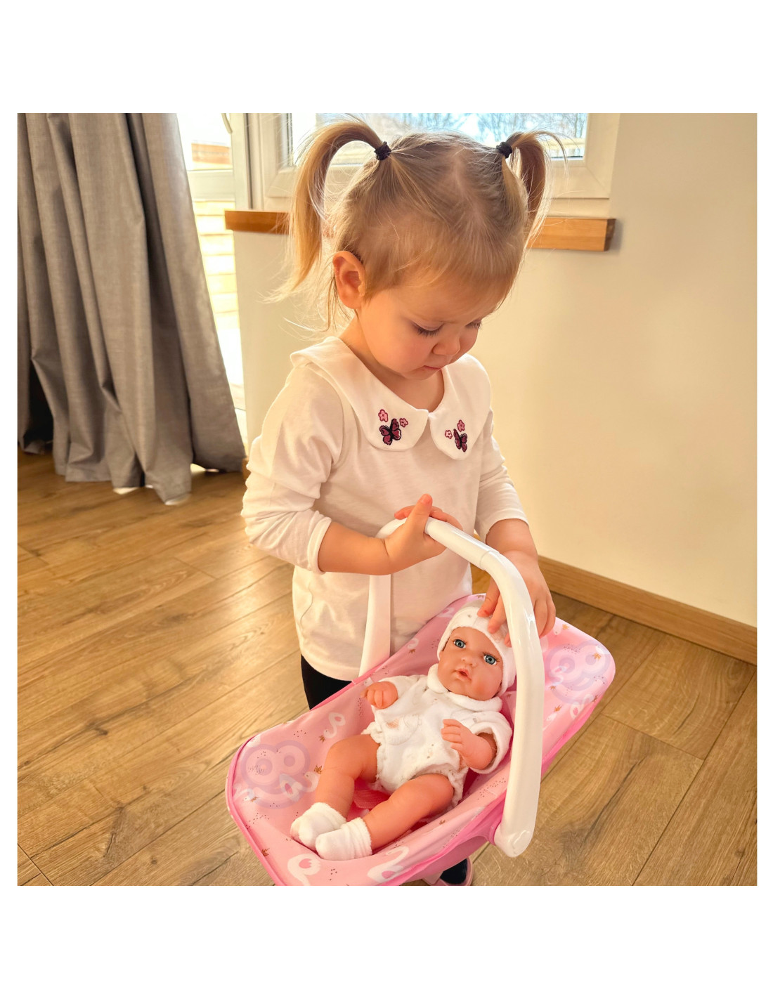 Baby on the Go Doll from WOOPIE ROYAL – Your New Playmate! This little doll comes dressed in a lovely outfit, matching socks, and a hat. The set also includes a charming , pink carrier . Your child develops creativity through role-playing. They learn empathy, sensitivity, and even responsibility.