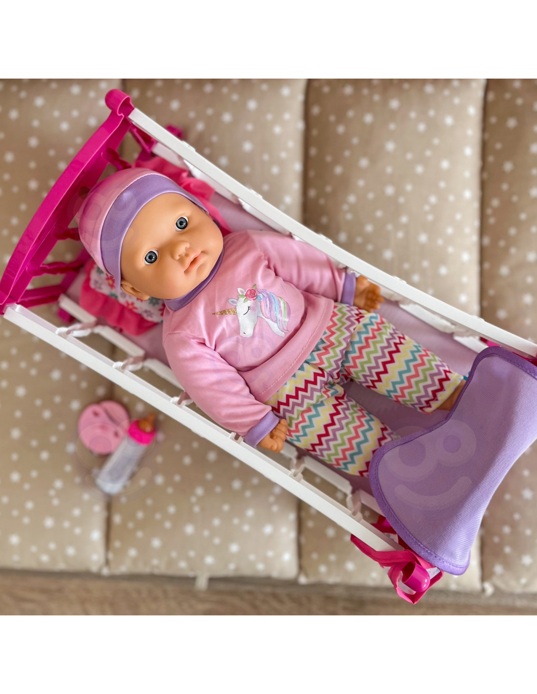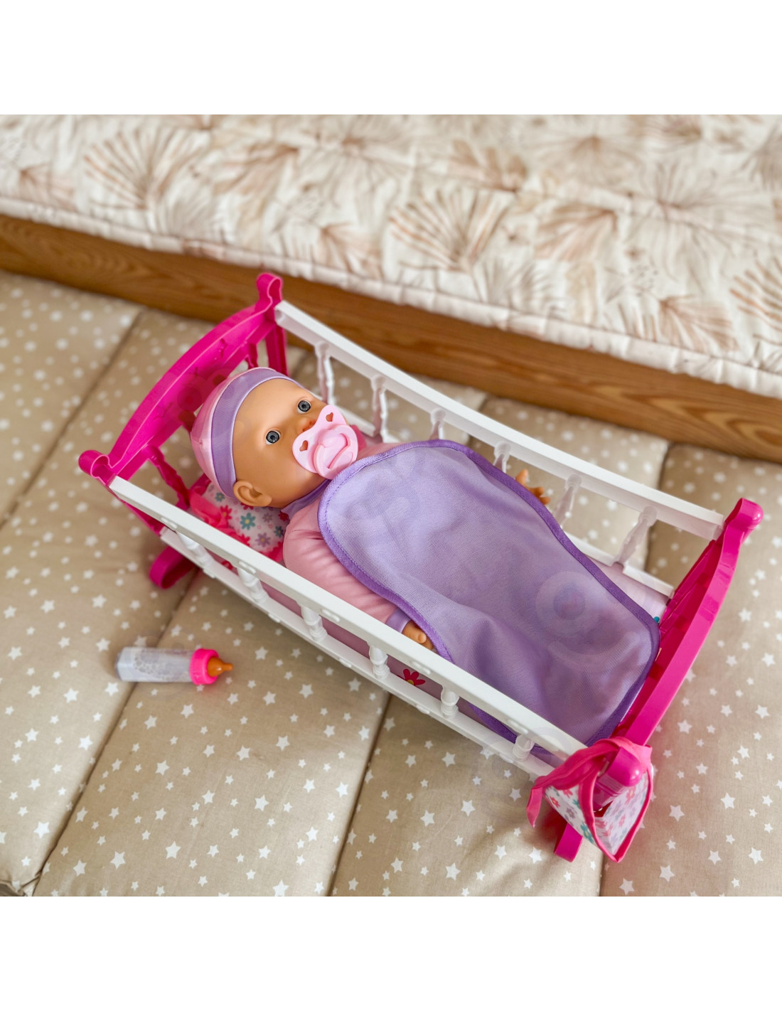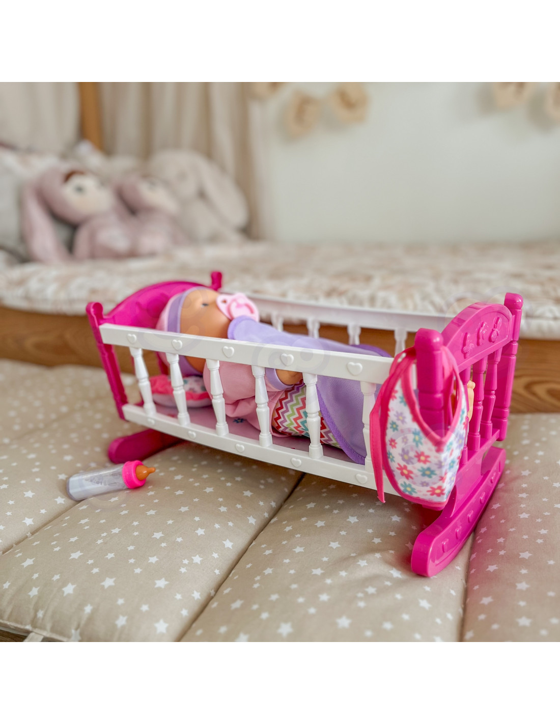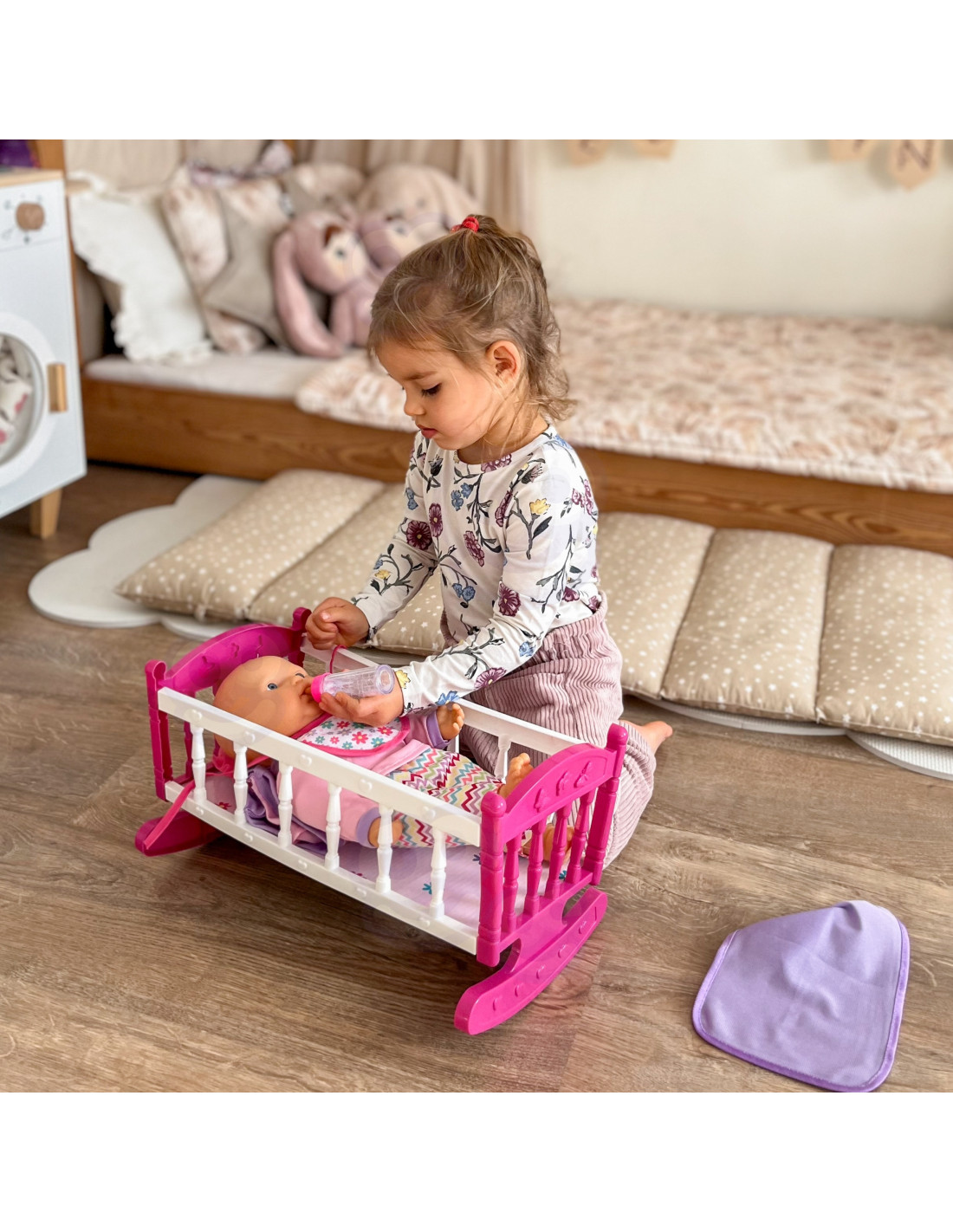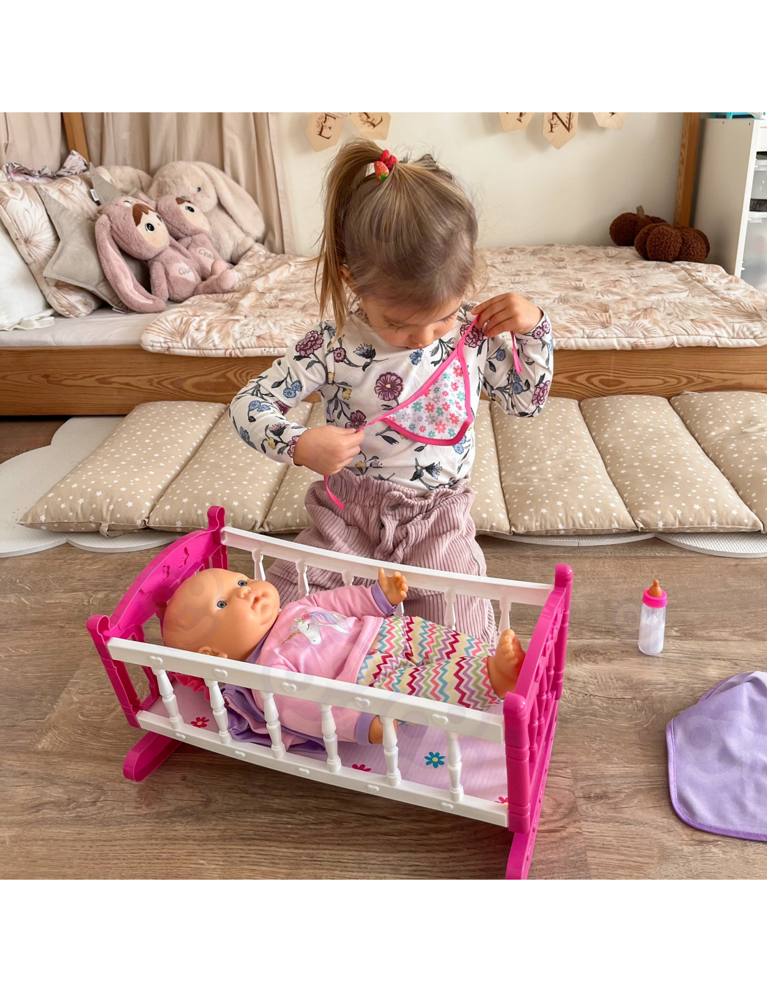 Discover the magical world of baby care with this adorable doll and pink crib from Woopie! This wonderful set is perfect for little ones who love playing house. The soft fabric doll with realistic facial features is dressed in a purple outfit and hat, and the set includes everything you need for everyday baby care. The colorful, safe design makes playtime even more engaging and enriching.