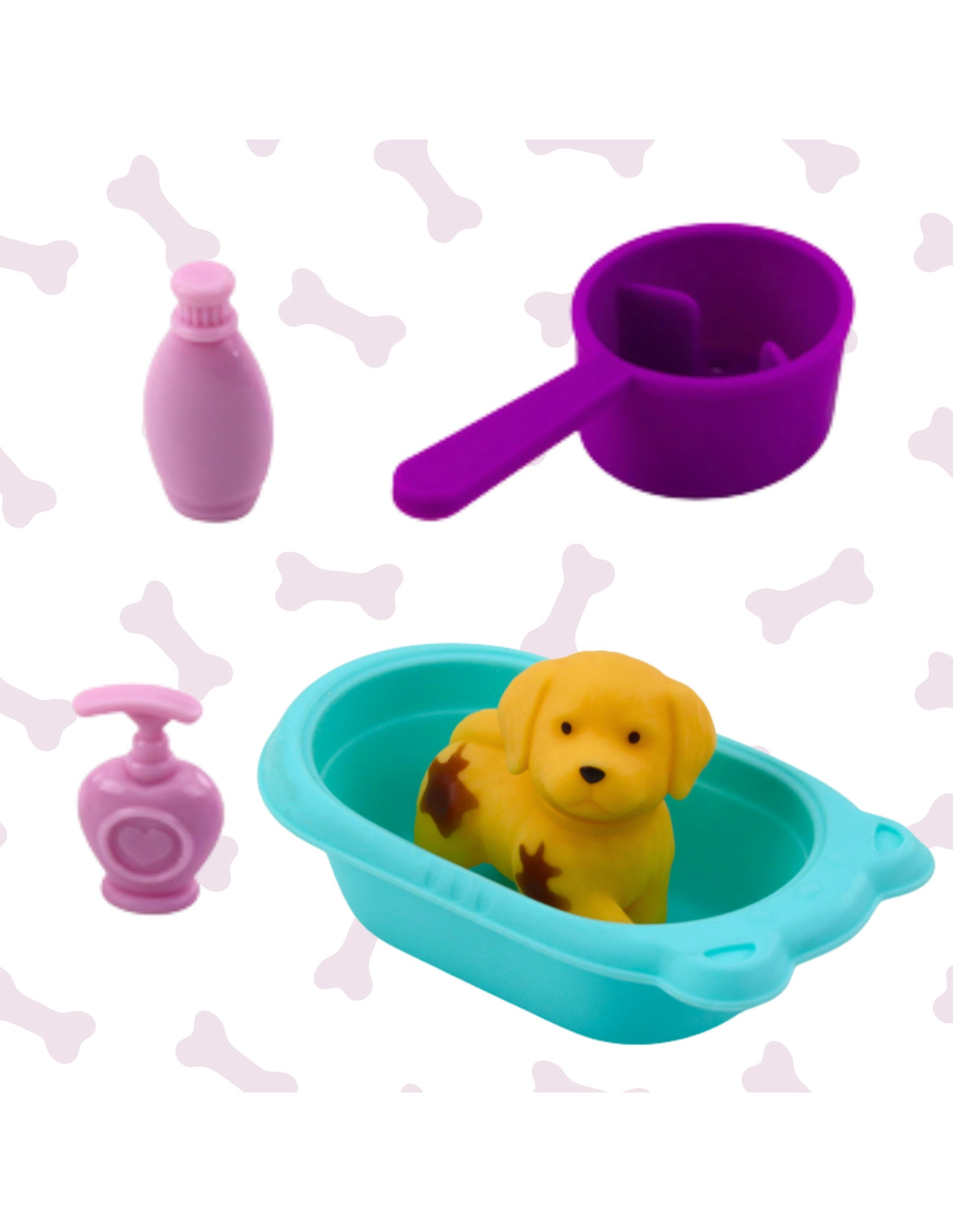 This unique Puppy Bathtime Dolls set from WOOPIE! guarantees fantastic, engaging play as a caring pet owner! The biggest attraction is the dog's magical transformation function – brown spots disappear when exposed to water, making bath time more realistic and delighting little ones. The set includes an adorable dog doll and full care accessories , including a bathtub with a shower. The set develops responsibility, imagination, and manual skills in children. The sturdy and safe construction guarantees hours of fun!