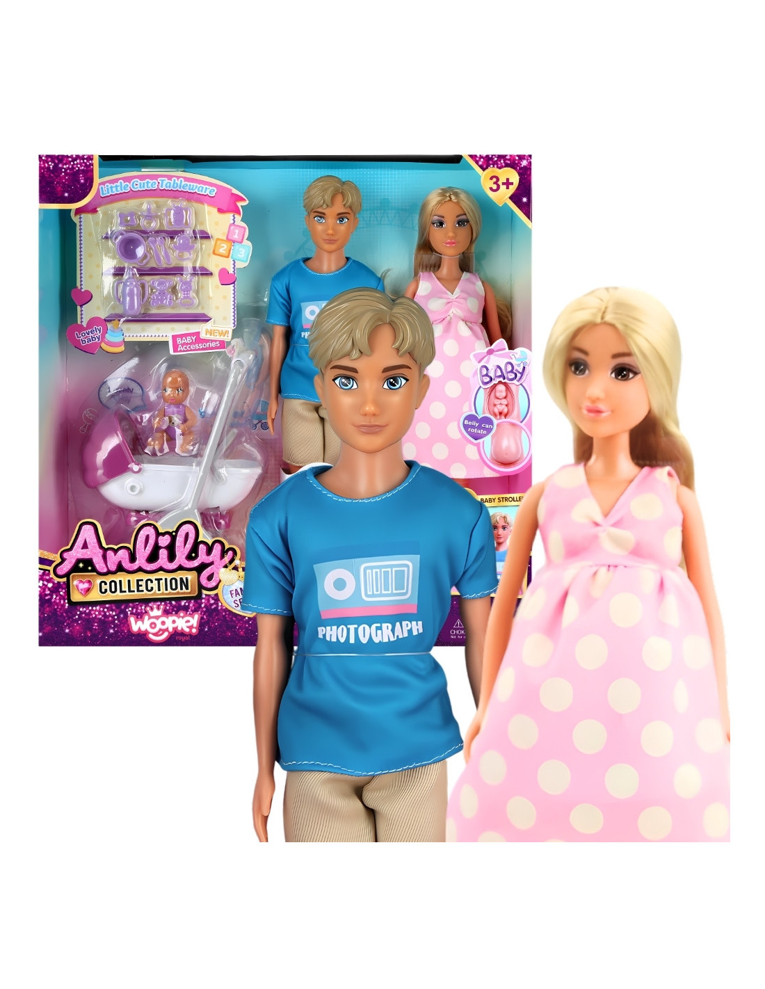 The Woopie family doll set is a great option for children who love themed play and role-playing. The set includes a pregnant mother doll, a stylish father doll, a baby doll, a rich set of accessories, and a functional stroller for transporting the baby. The set is inspired by family scenes , allowing children to create their own stories that teach empathy, responsibility, and caring for others. The mother doll wears a charming pink polka-dot dress , and her belly contains a removable baby figure. The father figure is a modern dad in a stylish T-shirt. The baby in a stroller and small accessories such as a bottle, bowl, pacifier, and diapers complete the set, enhancing realism and engaging the child in creativity.
