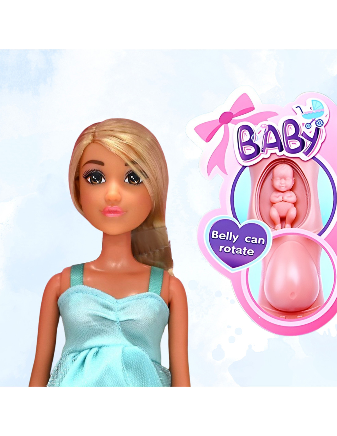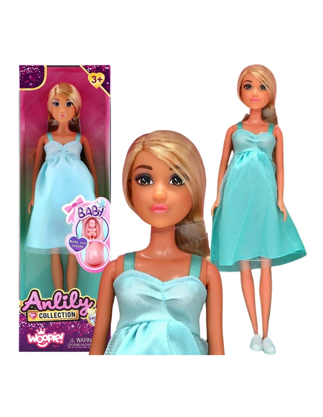 This doll representing a mother-to-be from the Woopie brand is a unique option for children interested in family, motherhood, and caring for little ones. This unique doll was designed to realistically recreate pregnancy and birth . Its greatest feature is a rotating belly from which the baby can be removed – a feature that allows children to simulate labor scenes, caring for the baby, and family moments right after birth. The doll is dressed in a delicate blue dress , giving her an elegant look. Her blond hair and delicate facial features make her easily endearing to children and make her a favorite playmate. Thanks to the simple mechanism for removing the baby, the toy is easy to use, even for younger children . This doll is not only a source of great fun but also a tool for supporting a child's emotional development . It teaches empathy and understanding the role of a mother, and also facilitates conversations about birth, family bonds, and love. It is perfect for both independent play and playing with peers or parents.