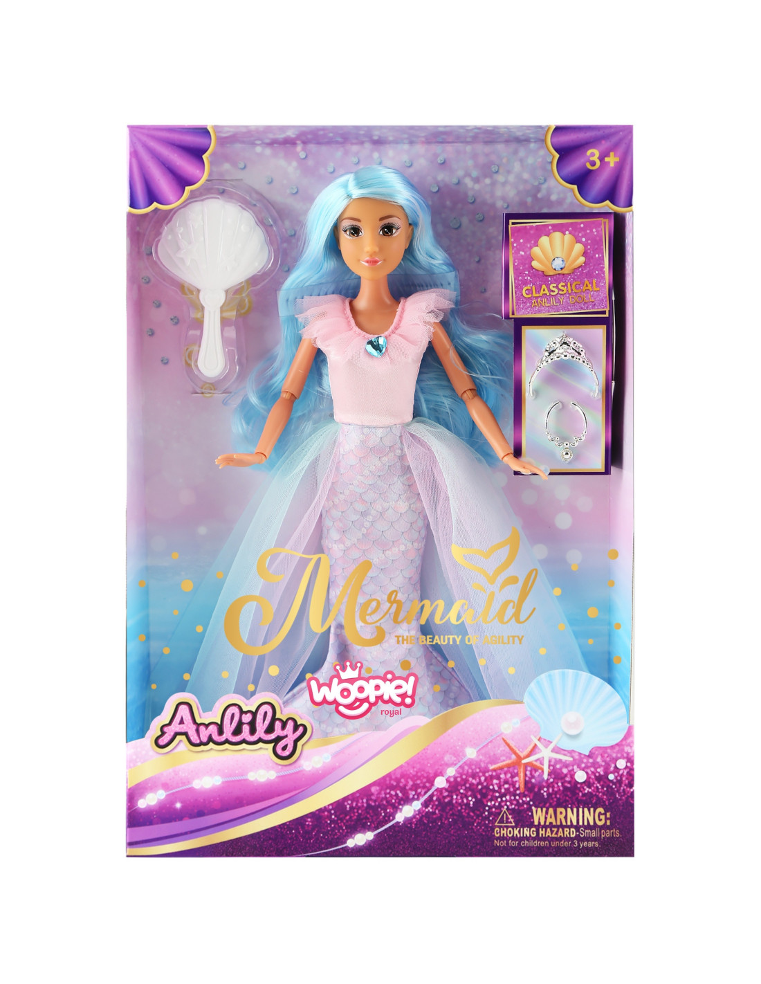 Transport your child to a magical underwater world with the Lili Mermaid doll from Woopie. The doll captivates with long blue hair and a pastel two-piece outfit with a mermaid tail and tulle cape. Elegant accessories— a mirror, tiara, and ring —included to enhance play and allow for creative styling . Lili provides hours of fantastic play , sparking imaginations and inspiring storytelling . It's the perfect gift for any little lover of magic and underwater adventures!