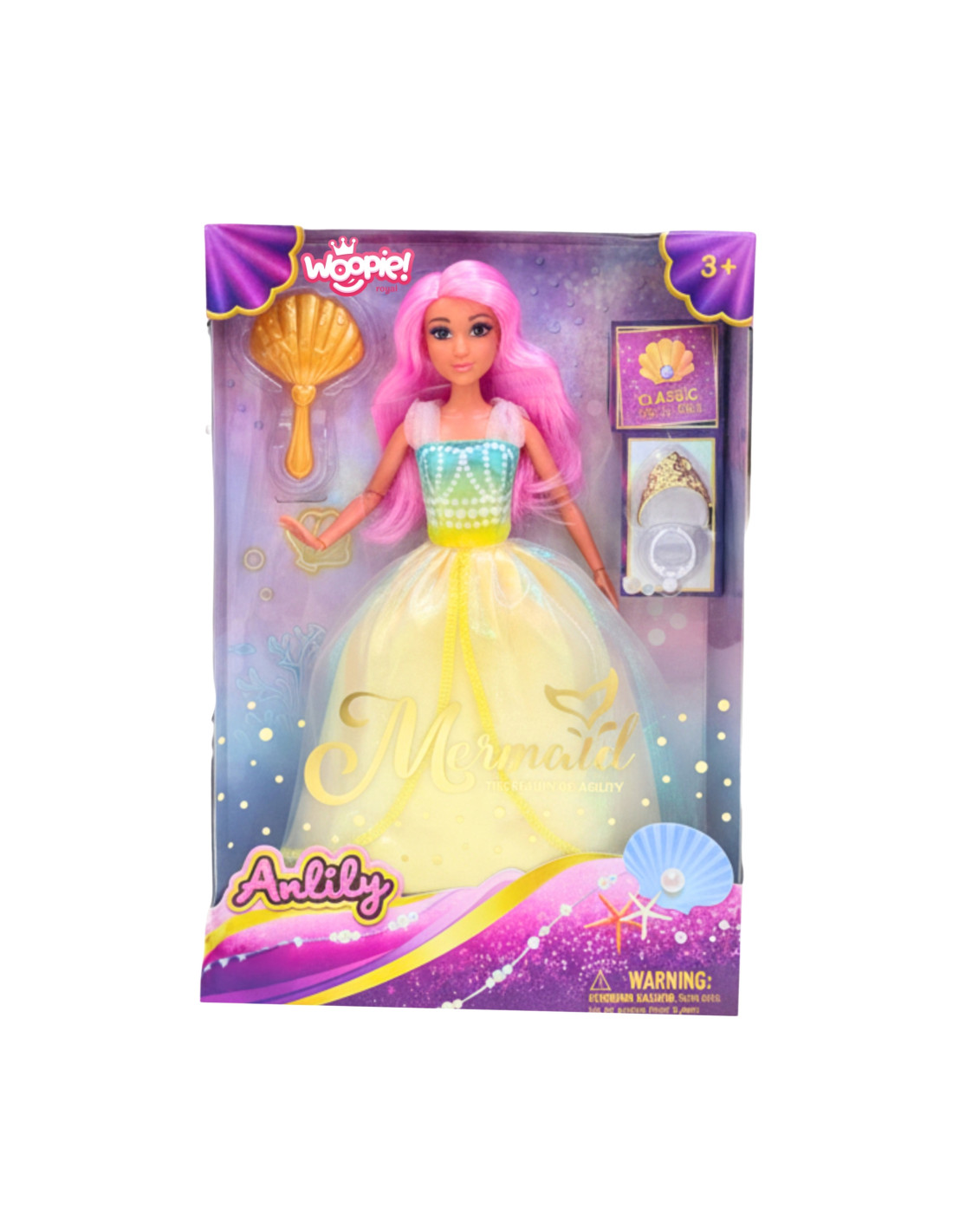Meet the charming Princess Lily from Woopie – a doll inspired by the underwater world of mermaids . Her long pink hair invites you to brush it and create imaginative hairstyles. Her shimmering, pastel-colored dress in shades of sea foam makes her look like a true ocean princess. A gold seashell comb and elegant ring complete the look. This is a perfect gift for children aged 3 and up, inspiring imaginations and inspiring countless fairytale stories.