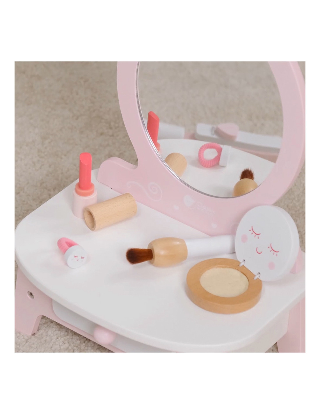 This beautiful, functional dressing table from Classic World is a perfect gift for children aged 3 and up . This extensive makeup and hair styling kit will delight every owner. The set includes a mirror where your little one can do their makeup. A large selection of accessories, such as a comb , lipstick , straightener , makeup brush , and powder compact , will allow for fun and relaxation while getting ready with their parents. The vanity top is very functional and can accommodate all of our model's essential accessories. This toy can be used as a complement to a beauty salon in little girls' rooms.