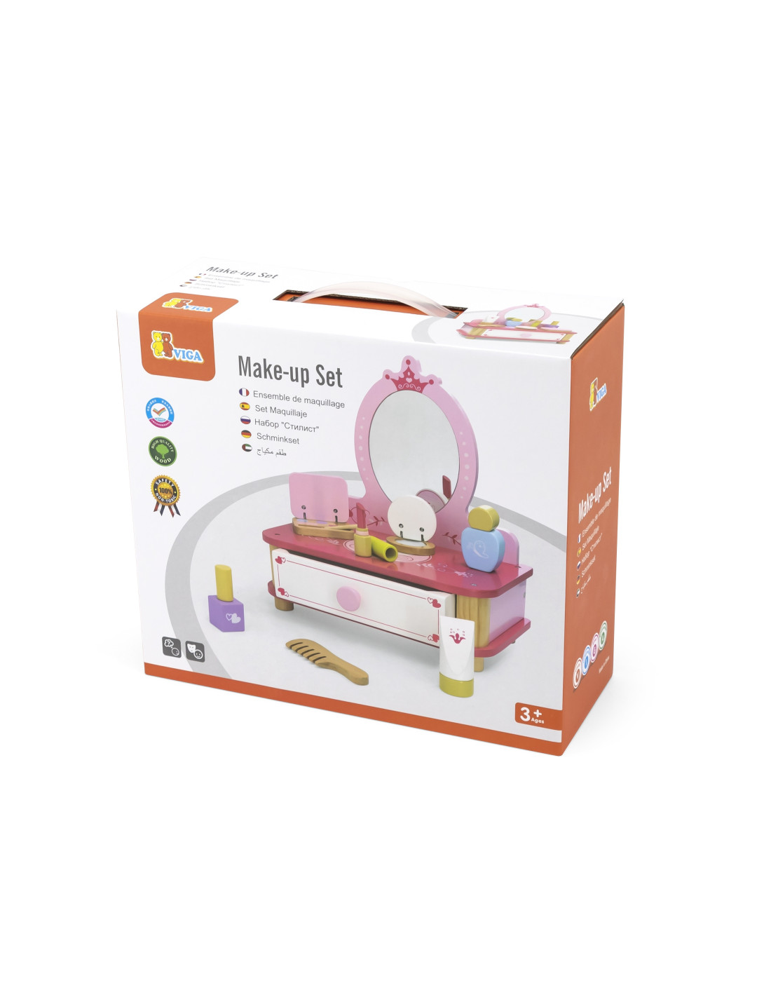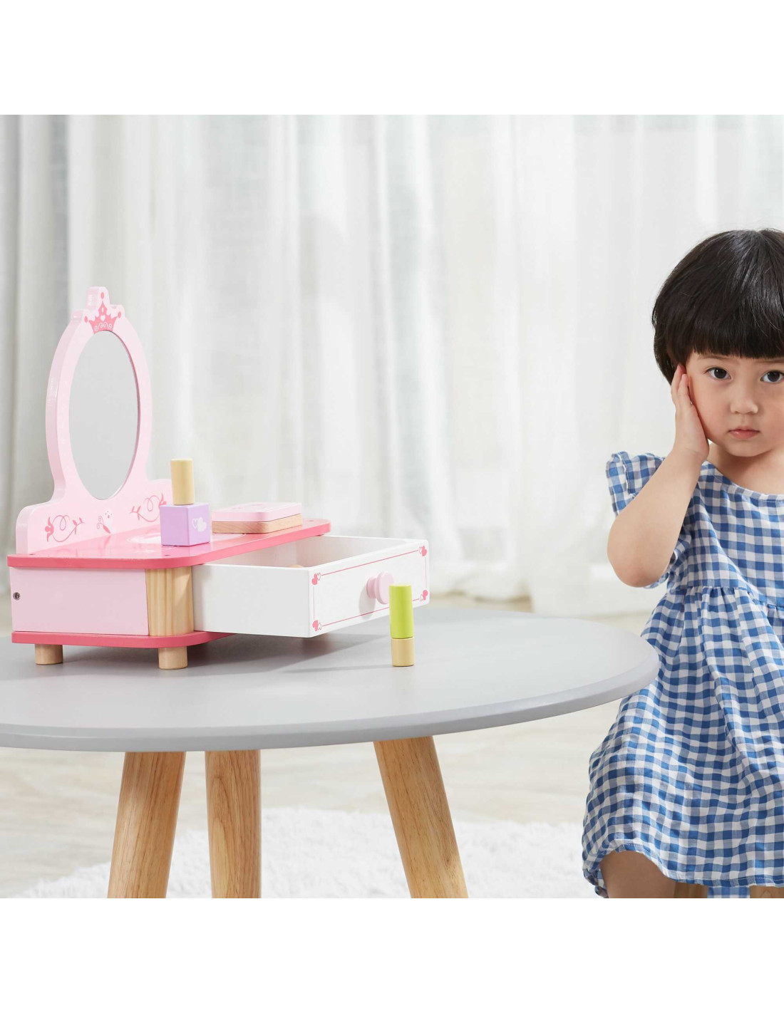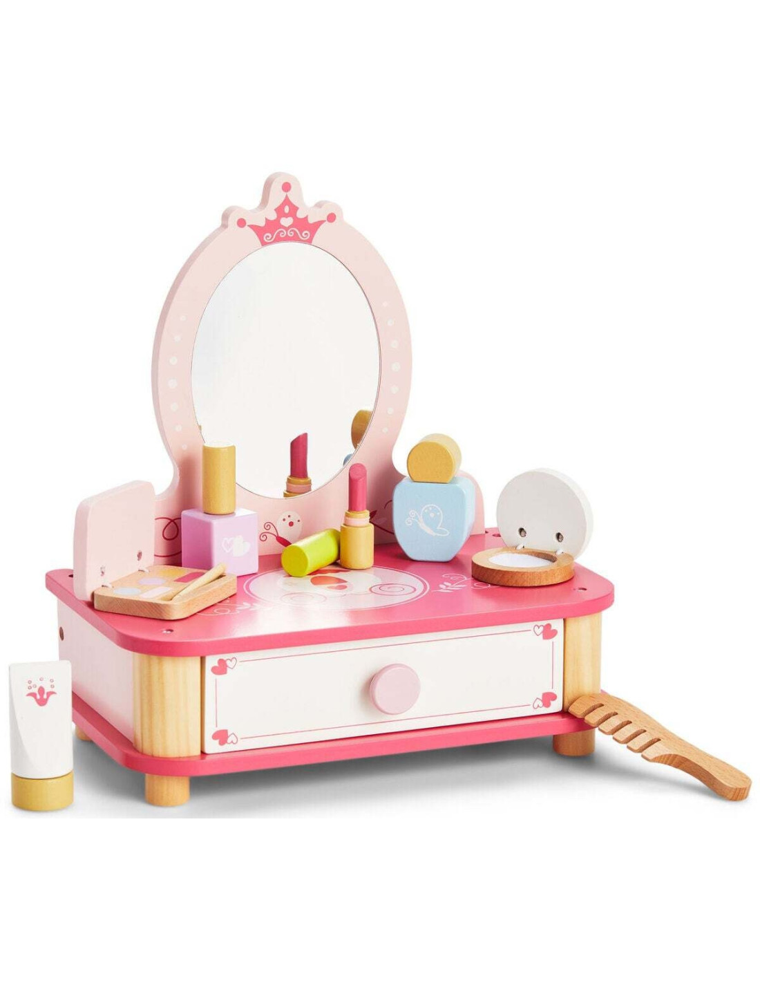 Piękna różowa toaletka od Viga to wymarzony mebel w pokoju każdej dziewczynki. Toaletka posiada wysuwaną szufladę, w której mała księżniczka może schować swoje skarby. Do zestawu dołączone są jeszcze liczne akcesoria. Całość wykonana z drewna i pomalowana nietoksycznymi farbami bezpiecznymi dla dzieci i środowiska.