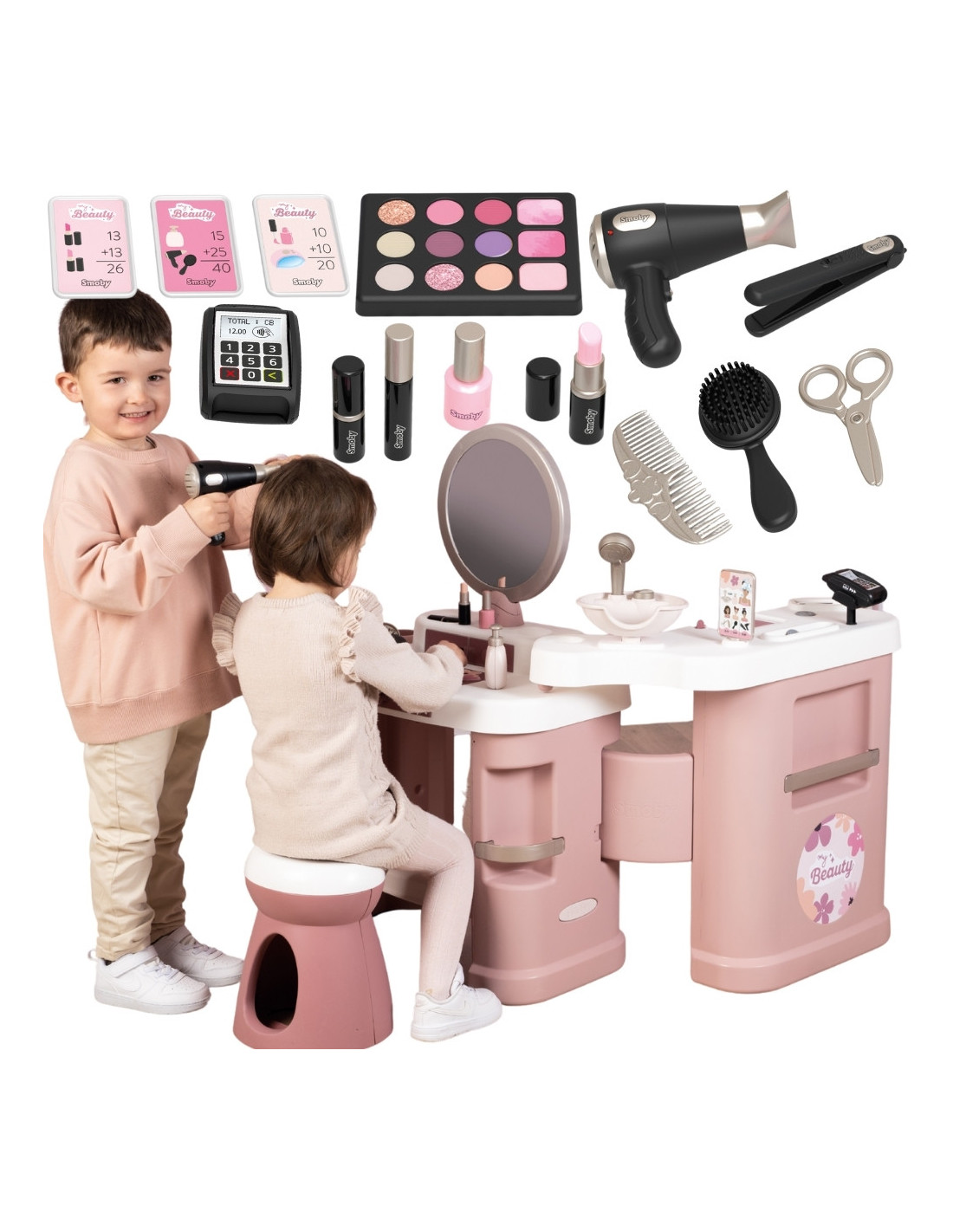 Your child can feel like a true professional in their own beauty salon! My Beauty Center combines three worlds – hairdressing, manicures, and makeup – offering a full range of accessories for creative play. The vanity area has a stool, mirror, and storage compartments; the hairdressing area has a sink with a shower ; and the sales area has a payment terminal and shelves. The set includes 32 accessories imitating real cosmetics and equipment, providing a realistic play experience. After playtime, the set can be easily folded away, saving space in the room.