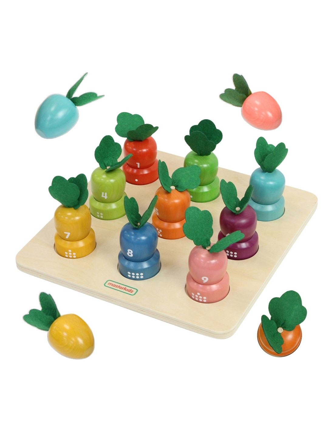 Drewniana tablica do nauki liczb i kolorów od marki MASTERKIDZ. Tablica została zaprojektowana, aby pomóc dzieciom rozwinąć ich zmysły. Dzieci muszą dopasować odpowiednie warzywko do liczby kropek oraz koloru. Układana rozwinie, również doskonale zdolności manualne u dziecka tzw. "małą motorykę".