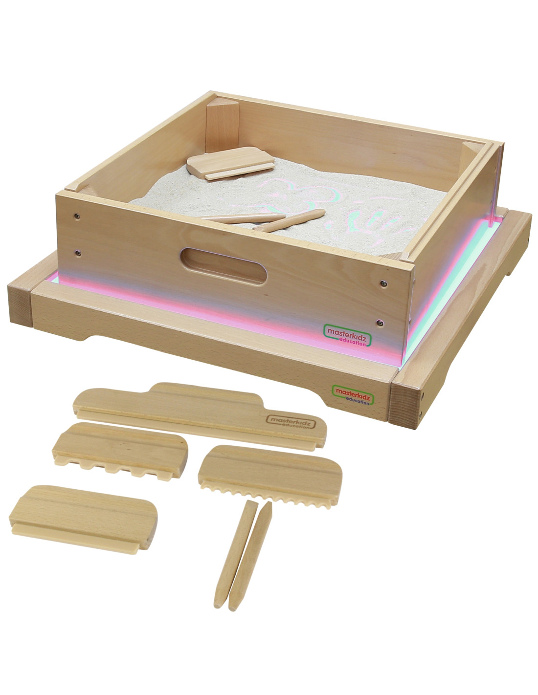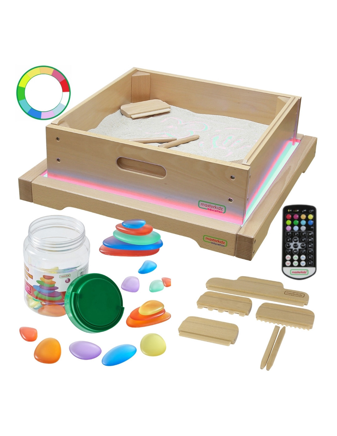 The Masterkidz LED Sensory Box Panel is a sturdy, wooden box with LED illumination that emits colorful light. The included remote control allows users to set the panel to one of 11 pre-programmed colors or manually change the emitted color based on the basic colors of red, green, and blue. The device also allows for smooth color transitions and the ability to save selected colors for reuse. The LED light panel enables a variety of creative activities, such as color mixing and STEM learning. Impressive results are achieved when the light penetrates various materials—leaves, paper, a sand tray, or clear water. The panel works perfectly with the included square sand tray and colorful pebbles, further enhancing the sensory experience.