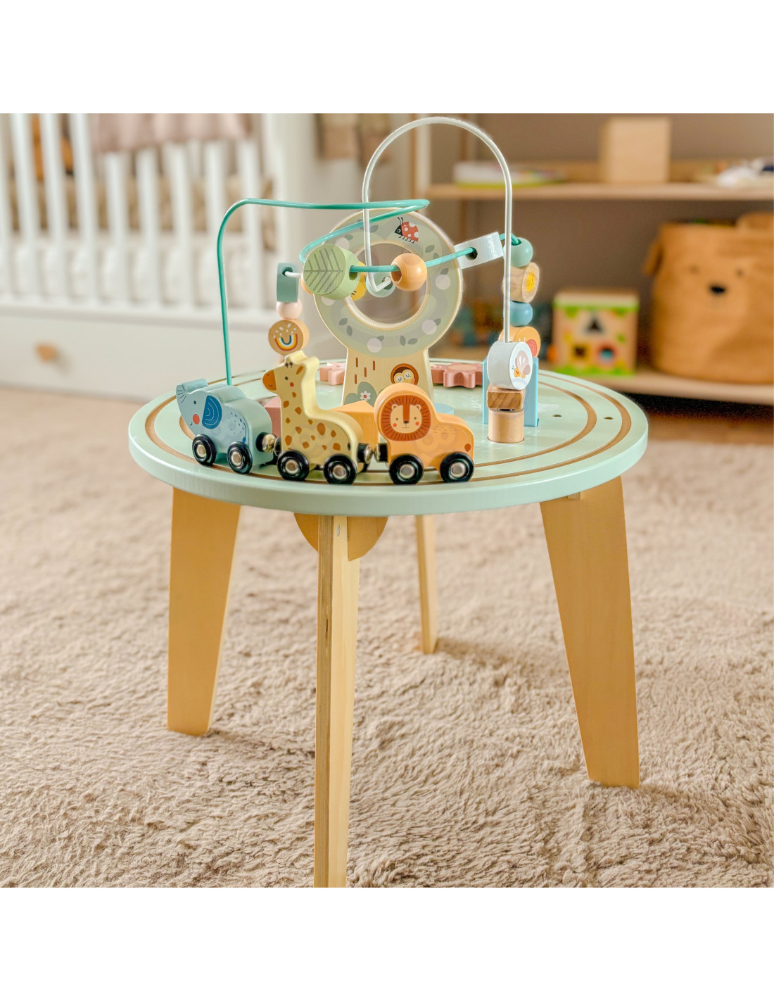 The Wooden Activity Table from TOOKY TOY can capture a child's attention for longer thanks to the variety of activities offered. This toy promotes standing and supports the development of fine motor skills, coordination, logical thinking, and creativity. Among the various attractions on this table are a motor loop, a sorter, gears, and a train . Various activities will introduce young children to the world of shapes, colors, and play. The cheerful and diverse colors attract attention. The toy is made of wood, in a child-safe manner, using non-toxic paints.