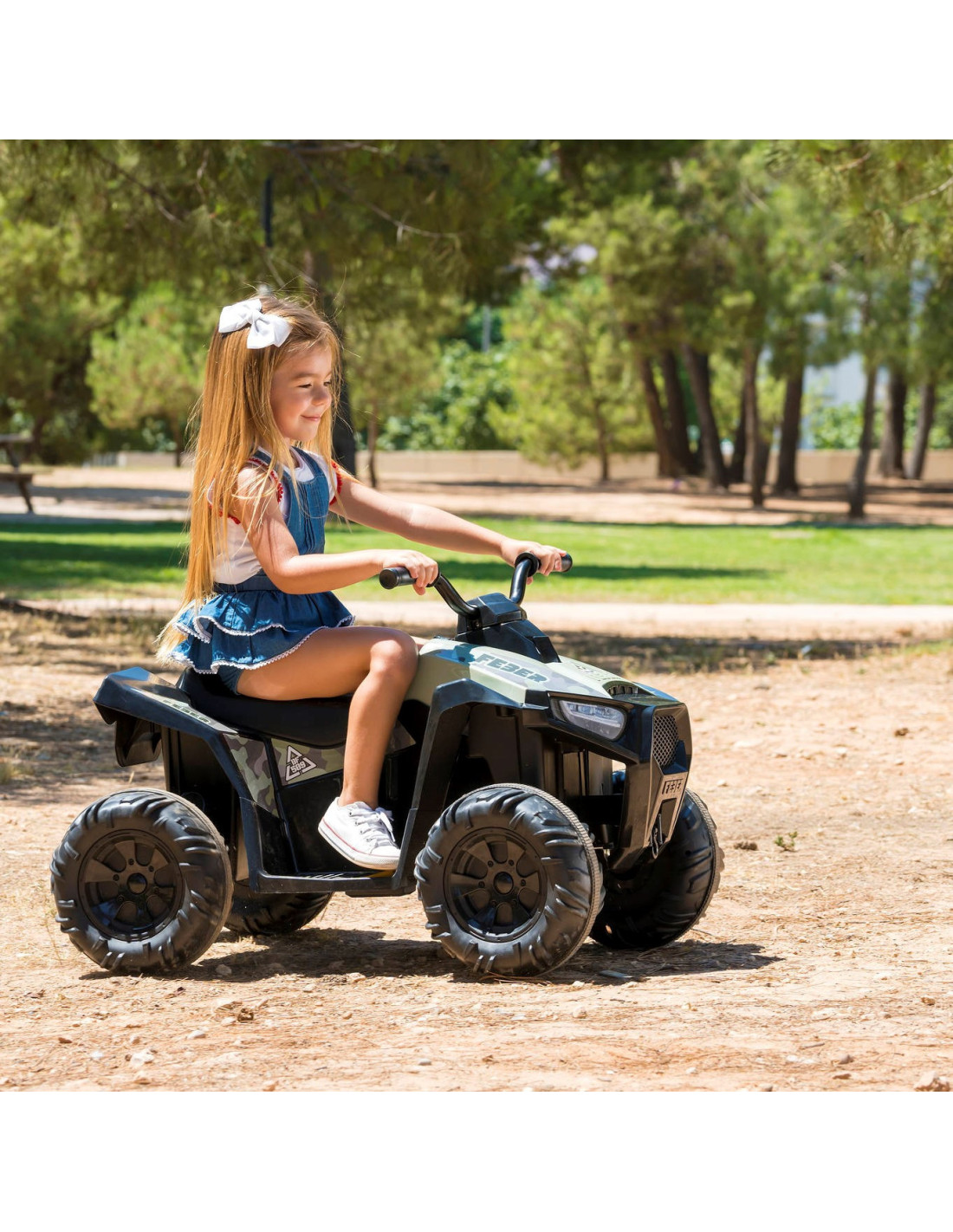 Niesamowity pojazd elektryczny od renomowanej, hiszpańskiej marki Feber. Barwa moro nadaje terenowego wyglądu. Quad został wyposażony w duże i wytrzymałe koła, które zapewnią lepszą przyczepność, oraz przy użytkowaniu w domu są ciche i nie niszczą podłóg. Wyposażony został w akumulator o mocy 12V, bieg do przodu i do tyłu, oraz hamulec nożny.