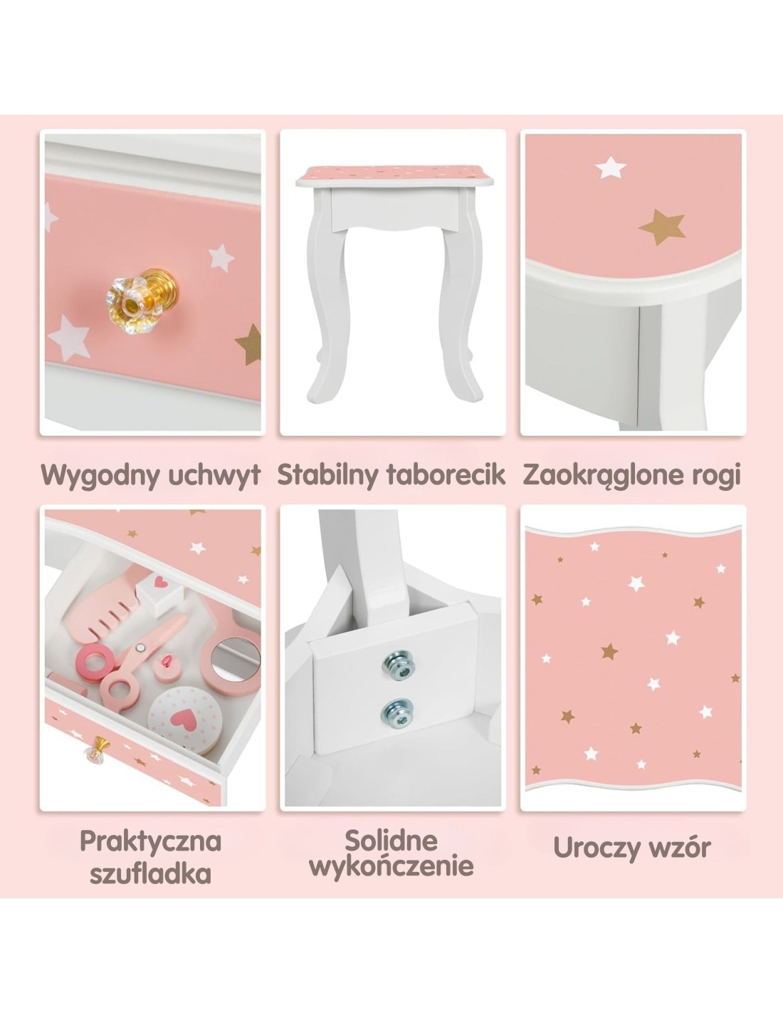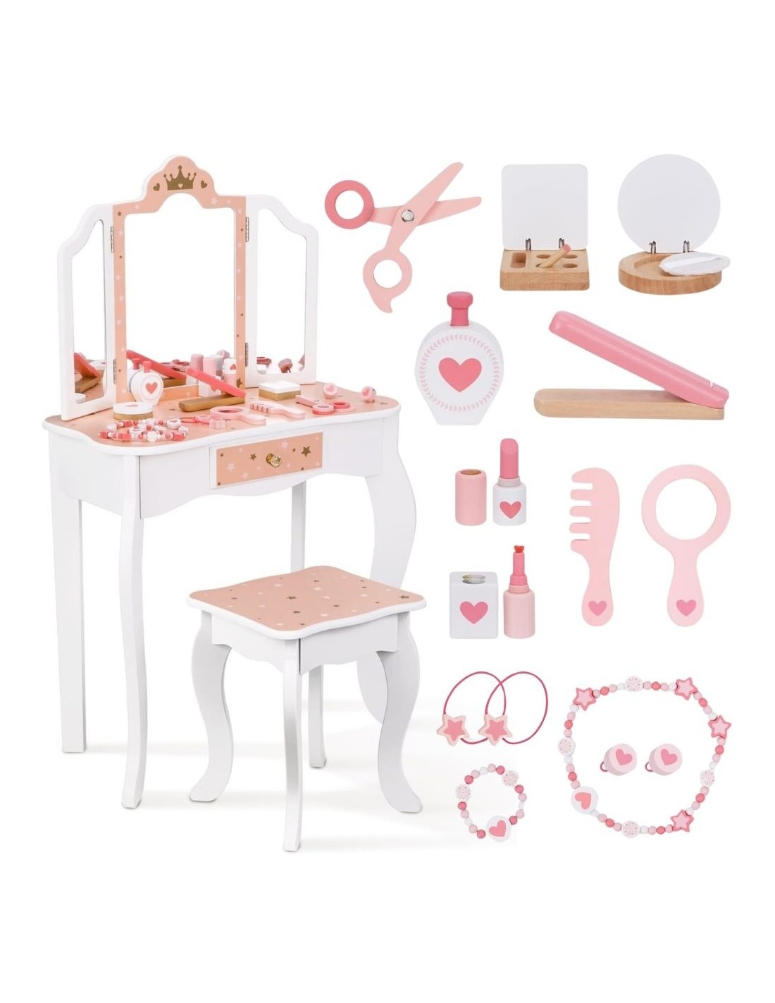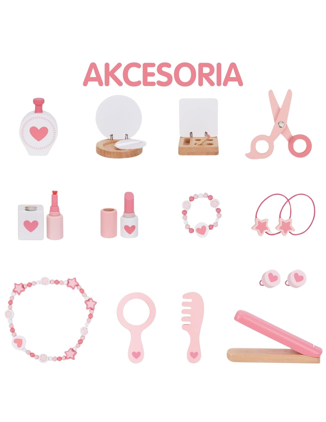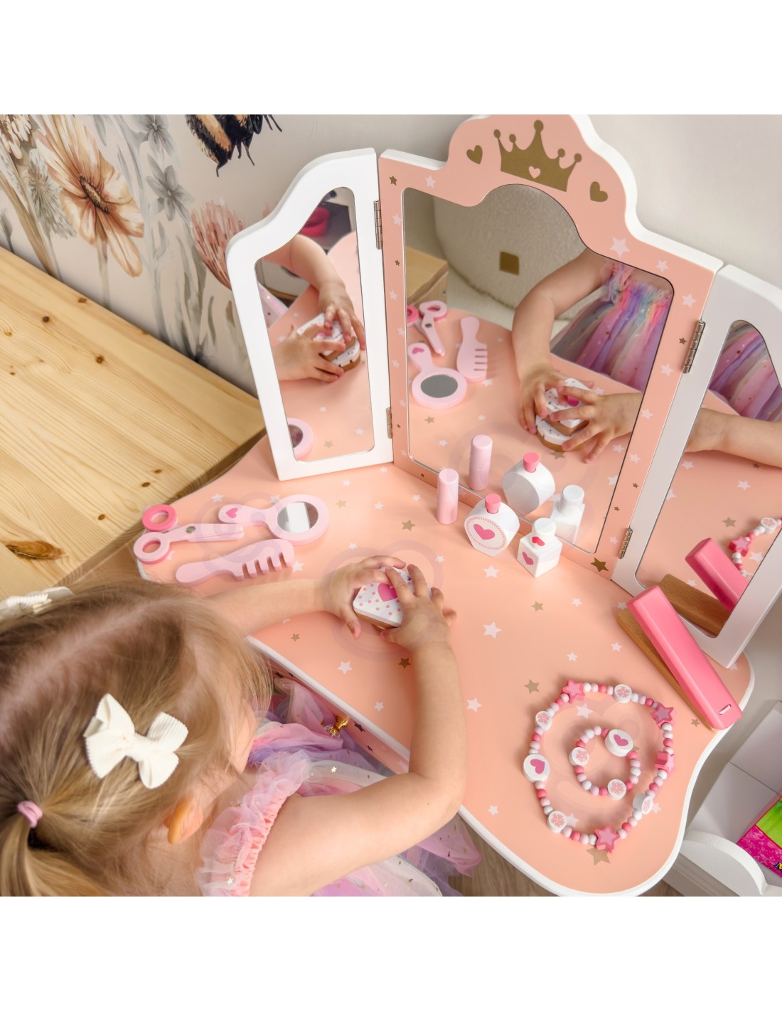 The wooden dressing table with accessories for children from Woopie Green is an incredibly charming and meticulously crafted toy that transports children to a world of imagination, beauty, and creative play. Designed with the youngest style and aesthetic enthusiasts in mind, it's not only a beautiful piece of furniture for the room but also a tool that supports a child's emotional, social, and manual development. The dressing table impresses with its elegant design inspired by classic adult furniture – it's shaped like a delicate desk with a triple mirror, a drawer for small items, and a comfortable stool adapted to the child's height. Crafted from high-quality wood , painted with safe, non-toxic paints in pastel shades of pink, white, and gold, each piece has been carefully sanded to ensure safety during play . A crown, hearts, and stars embellish the dressing table with a fairytale character, making your child feel like a real princess or artist preparing for a performance. Its stylish design blends perfectly with a child's room décor – it serves as both a toy and an elegant decorative element. The dressing table features a practical drawer where children can store their treasures, jewelry, hair accessories, and play cosmetics . A three-part mirror with movable wings allows for viewing from multiple angles, while the wide tabletop provides ample space for all necessary accessories. The set also includes a rich set of accessories that make play even more realistic – including a mirror, comb, hairdryer, eyeshadow, hairspray, lipstick, powder, and even wooden perfume. Children can create their own styles, learning precision, patience, and independence along the way.