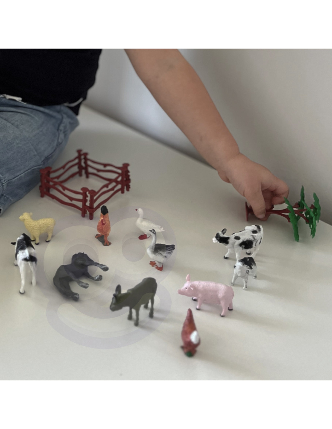 The WOOPIE Animal Figure Set is the perfect addition to any farm. The set includes 14 pieces : 2 chickens, a horse, a donkey, a sheep, a pig, a dog, a duck, 2 cows, a goose, a goat, a tree, and a farmyard. The figures are meticulously detailed and durable . Playing on a farm will expand your little one's imagination and creativity.