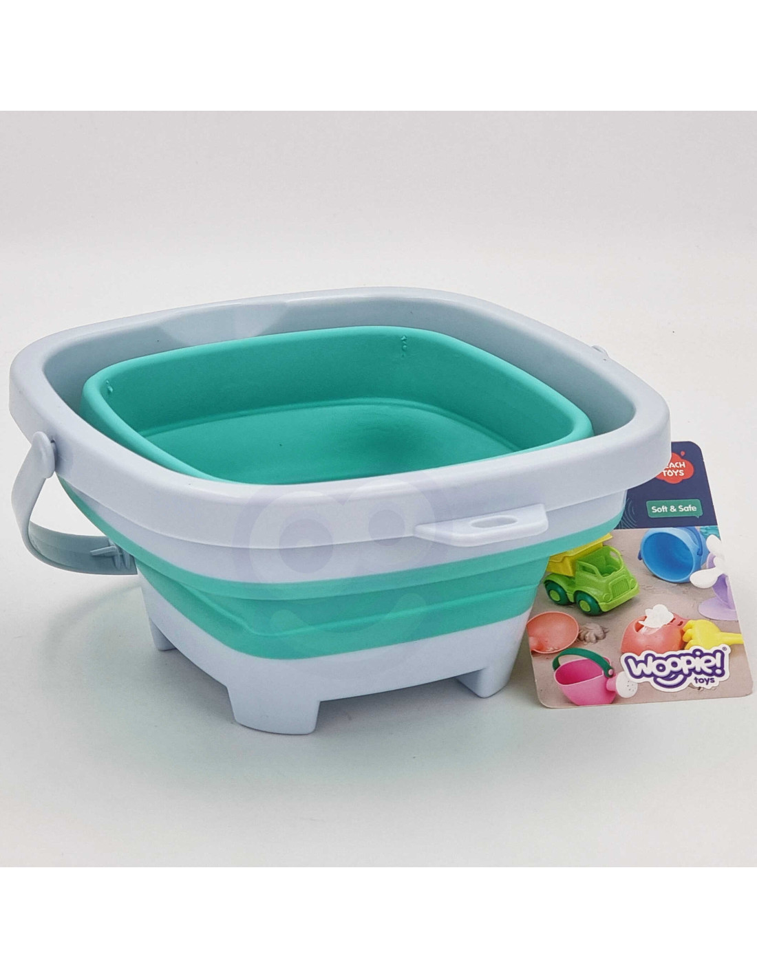 Silicone bucket from WOOPIE . A fantastic bucket for the sandbox, beach , or garden , it's perfect for kids to enjoy the outdoors . Thanks to its foldable design, the bucket takes up minimal space , making it easy to transport and store . It fits easily into a child's backpack, stroller, or beach bag .