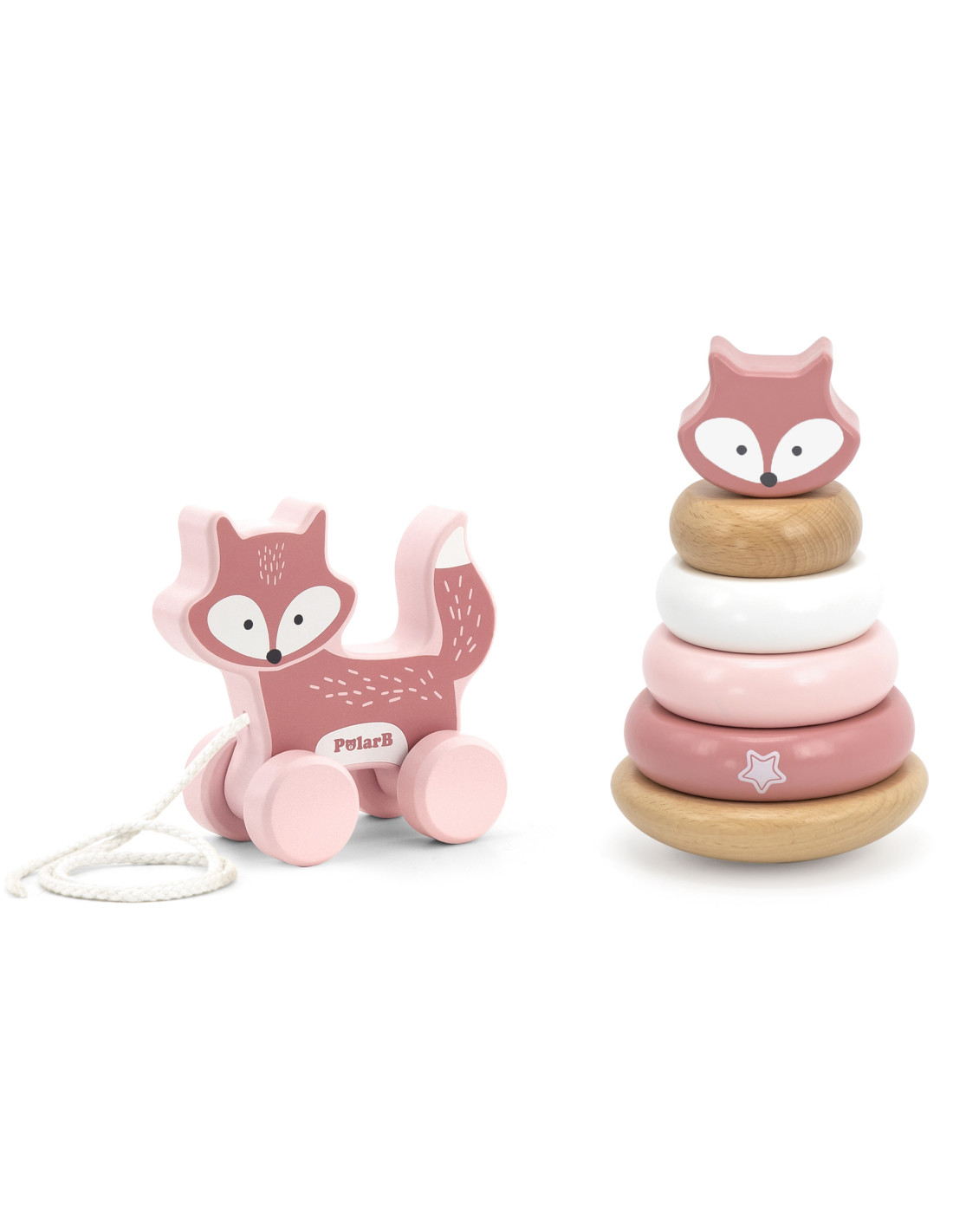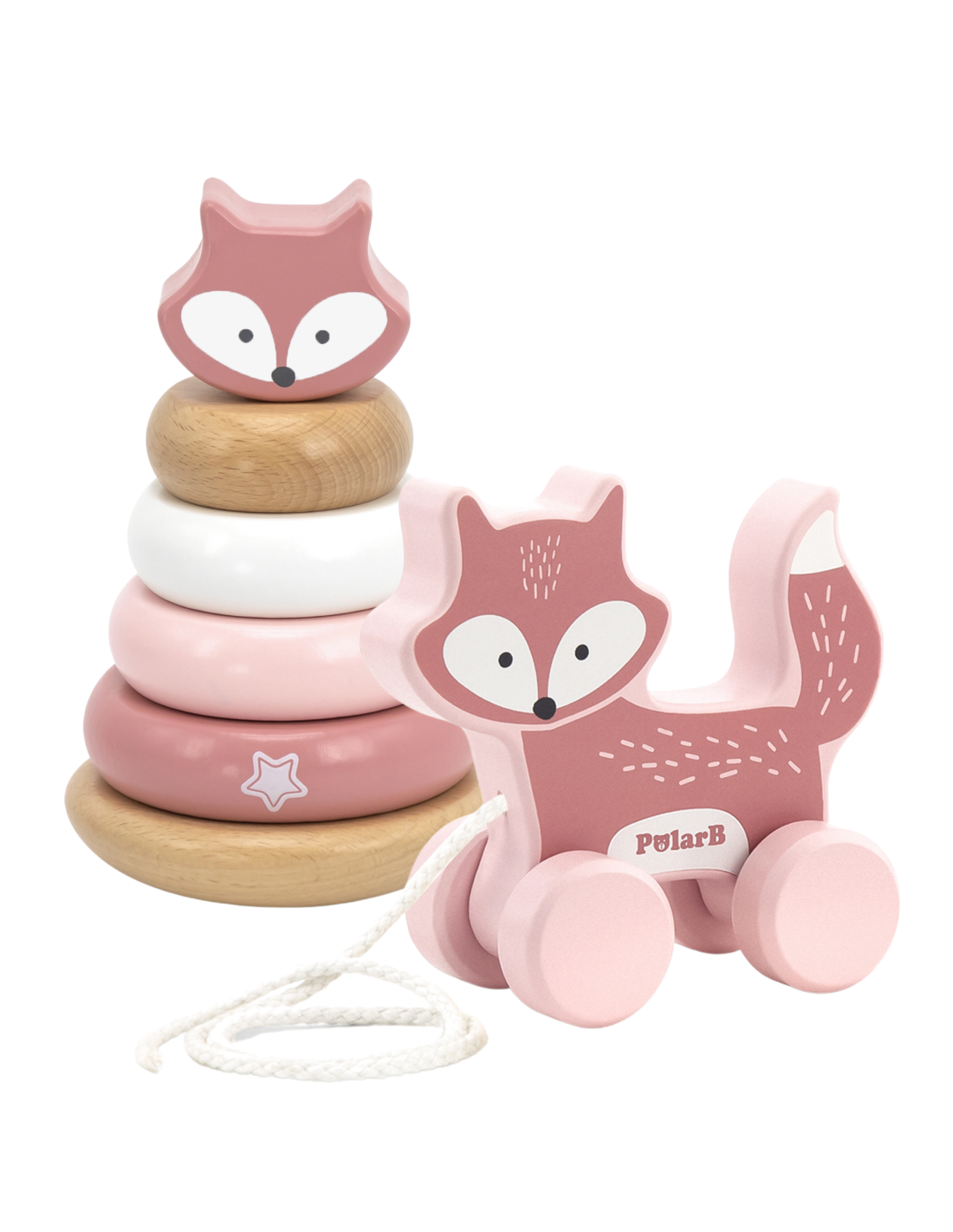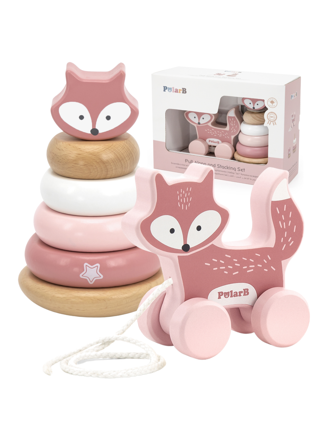 This set from the Viga brand, part of the PolarB collection, includes two pastel wooden toys: a Fox Educational Pyramid and a Fox Pull-Along . Both toys will not only keep your child entertained but will also help develop fine motor skills , logical thinking , and colors.