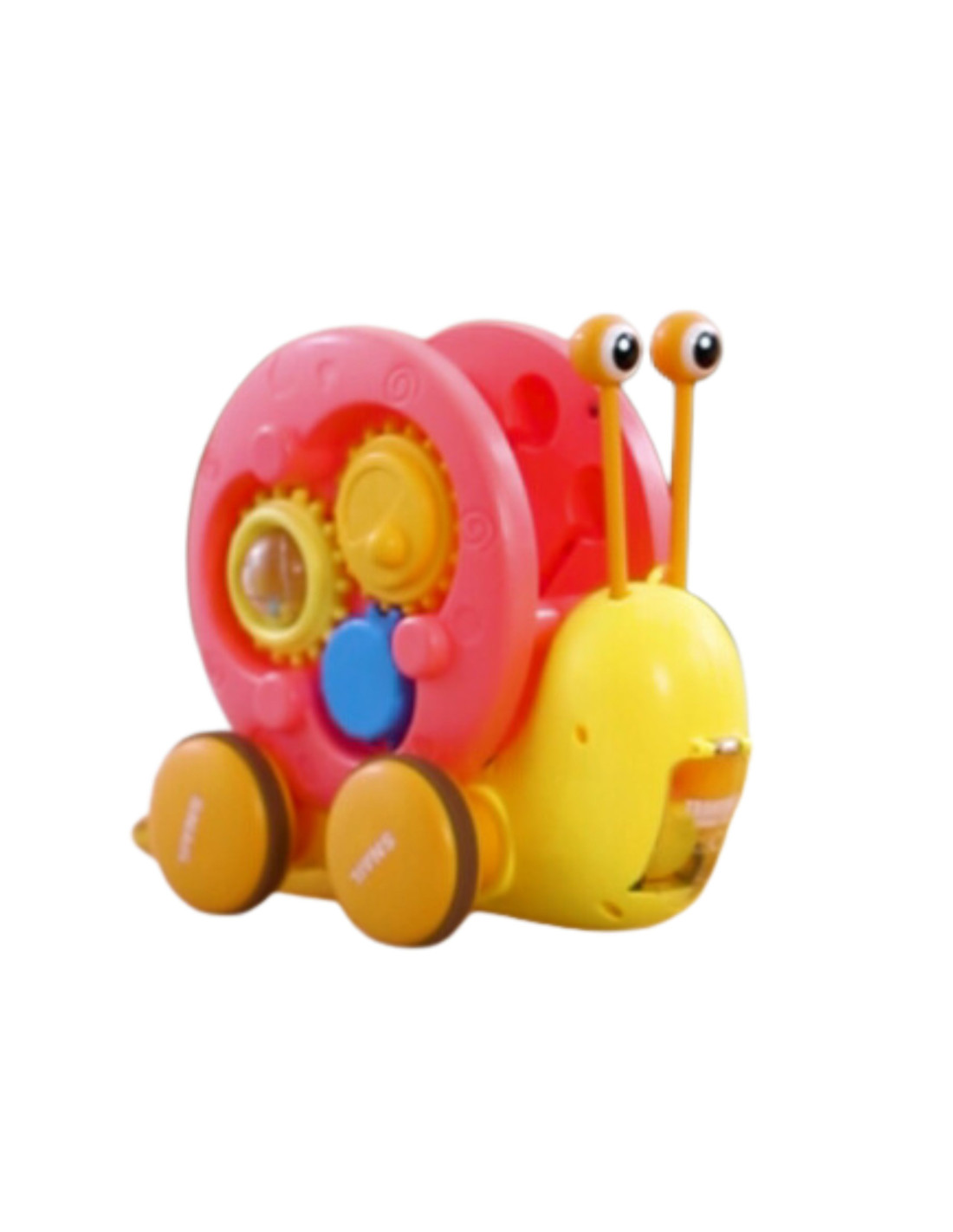 A multi-functional snail push toy from WOOPIE that captures children's attention and stimulates their imagination. Bright colors also enhance their visual perception and aesthetic sense. The snail pull toy offers a variety of ways to play and learn. You can hit the keys to practice children's hearing and hand - eye coordination. You can also pull the snail on a leash or push it and let it slide across the floor, which increases the fun and challenge. While playing, children learn about animals, music, and cause-and-effect relationships. It encourages observation, logical thinking , and physical coordination , while your child can enjoy hours of creative play. The snail pull toy is a great way to share happy time with children. Moms can play with their little ones and watch them giggle as the snail moves. This toy is suitable for family interaction and can strengthen mutual feelings . The toy consists of two parts: a snail shell, which contains cymbals, and eye-shaped sticks (located inside the shell). The second part is a launcher for a small car made of the snail's body. There's a button on the toy's back that opens the launcher for the car.