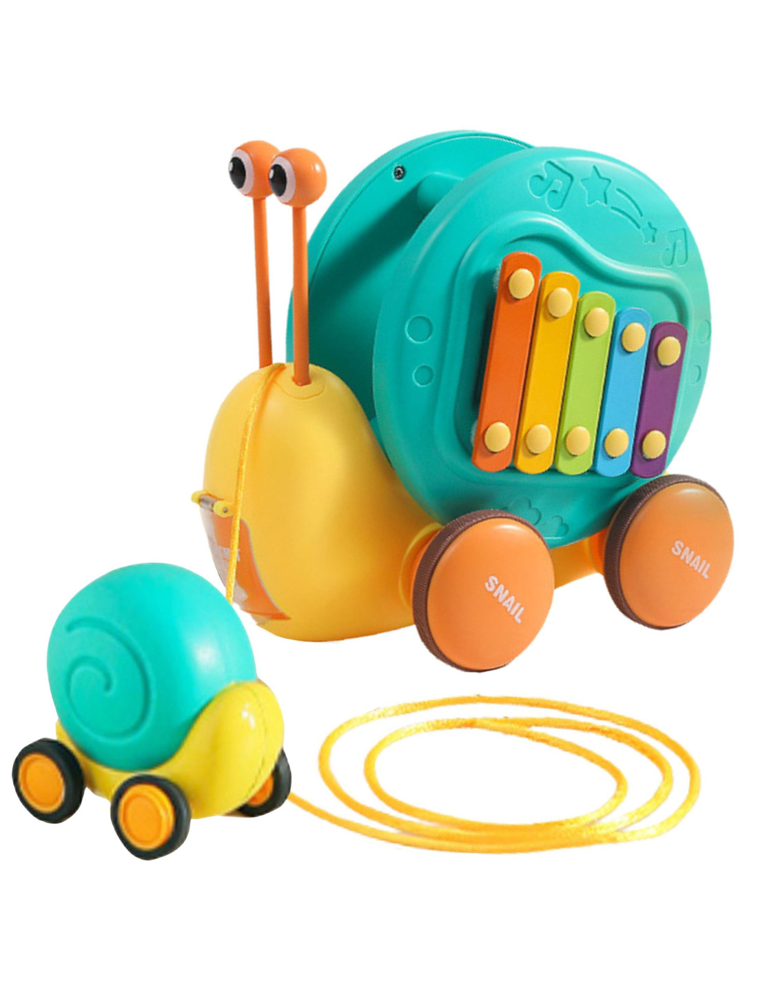 A multi-functional snail push toy from WOOPIE that captures children's attention and stimulates their imagination. Bright colors also enhance their visual perception and aesthetic sense. The snail pull toy offers a variety of ways to play and learn. You can hit the keys to practice children's hearing and hand - eye coordination. You can also pull the snail on a leash or push it and let it slide across the floor, which increases the fun and challenge. While playing, children learn about animals, music, and cause-and-effect relationships. It encourages observation, logical thinking , and physical coordination , while your child can enjoy hours of creative play. The snail pull toy is a great way to share happy time with children. Moms can play with their little ones and watch them giggle as the snail moves. This toy is suitable for family interaction and can strengthen mutual feelings . The toy consists of two parts: a snail shell, which contains cymbals, and eye-shaped sticks (located inside the shell). The second part is a launcher for a small snail car . There's a button on the toy's back that opens the launcher for the car.
