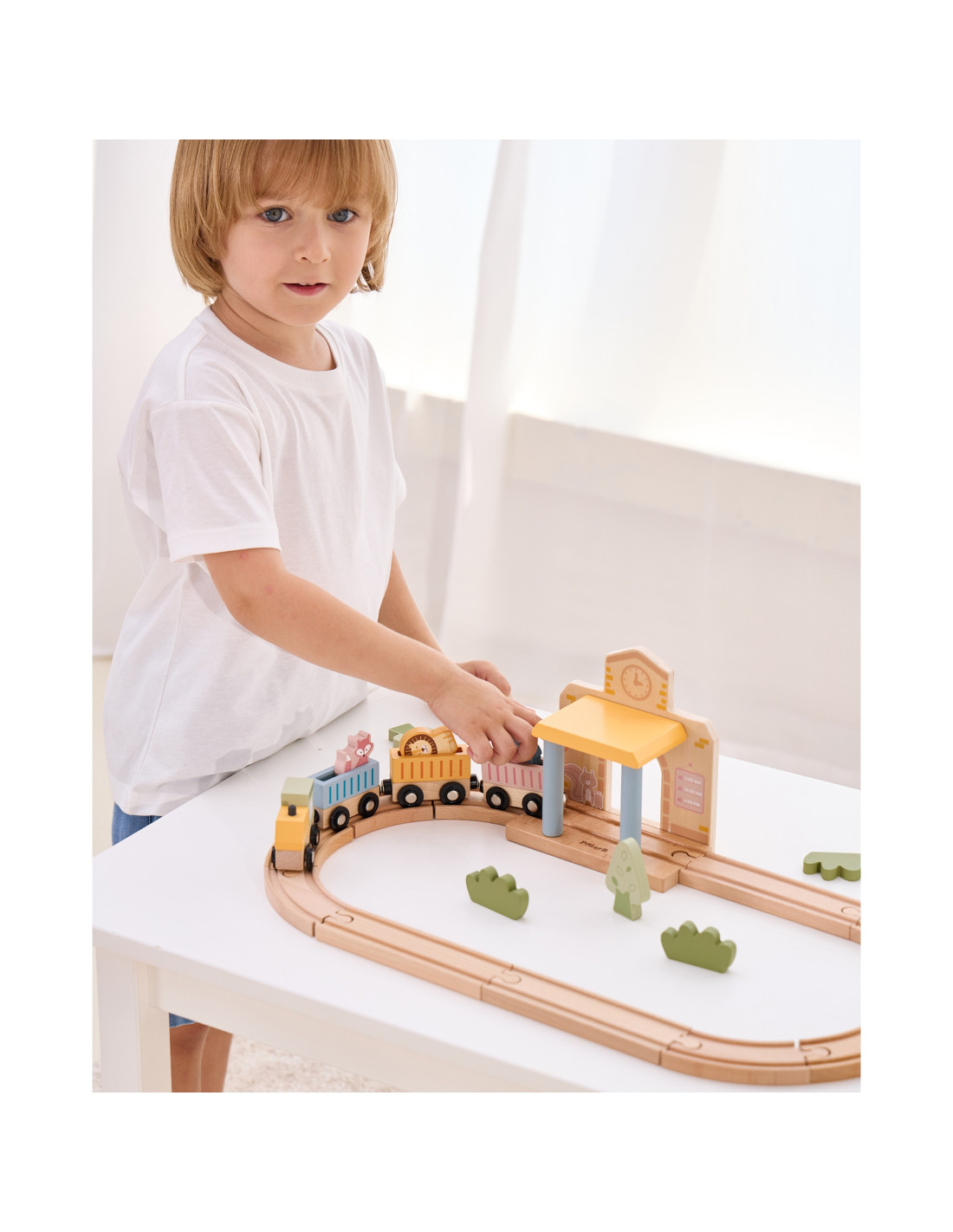 The PolarB Wooden Train Set (30 pieces) is a perfect choice for young train enthusiasts! It includes 30 pieces, including a variety of tracks, an interactive station, and accessories that allow children to create their own play scenarios. The included guidebook makes it easy to build a realistic train station setting. A magnetically activated sound feature, activated when the train passes through the station, makes play even more engaging. The wooden pieces are sturdy and durable, and their versatility encourages children to engage in open-ended and creative play.