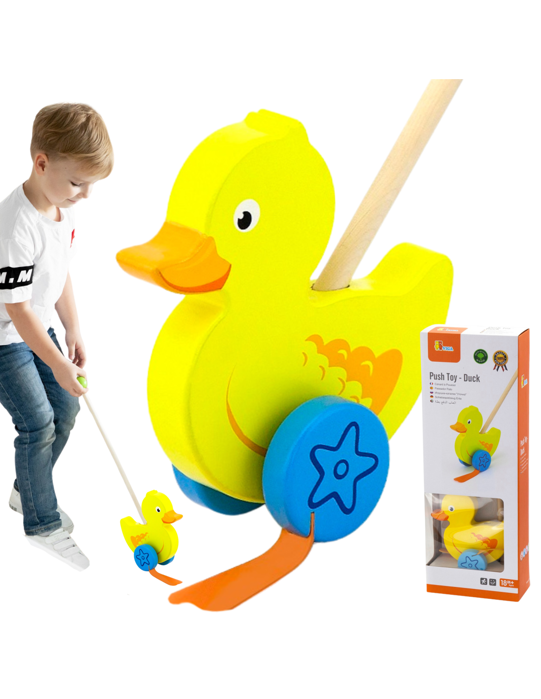 Pchacz z Kaczuszką na kijku od firmy Viga jest przeznaczony dla dzieci, które właśnie uczą się stawiać pierwsze kroki. Kolorowy pchacz zachęci maluszka do stawiania pierwszych kroków, będzie wdzięcznym towarzyszem spacerów w domu, ogrodzie oraz parku.