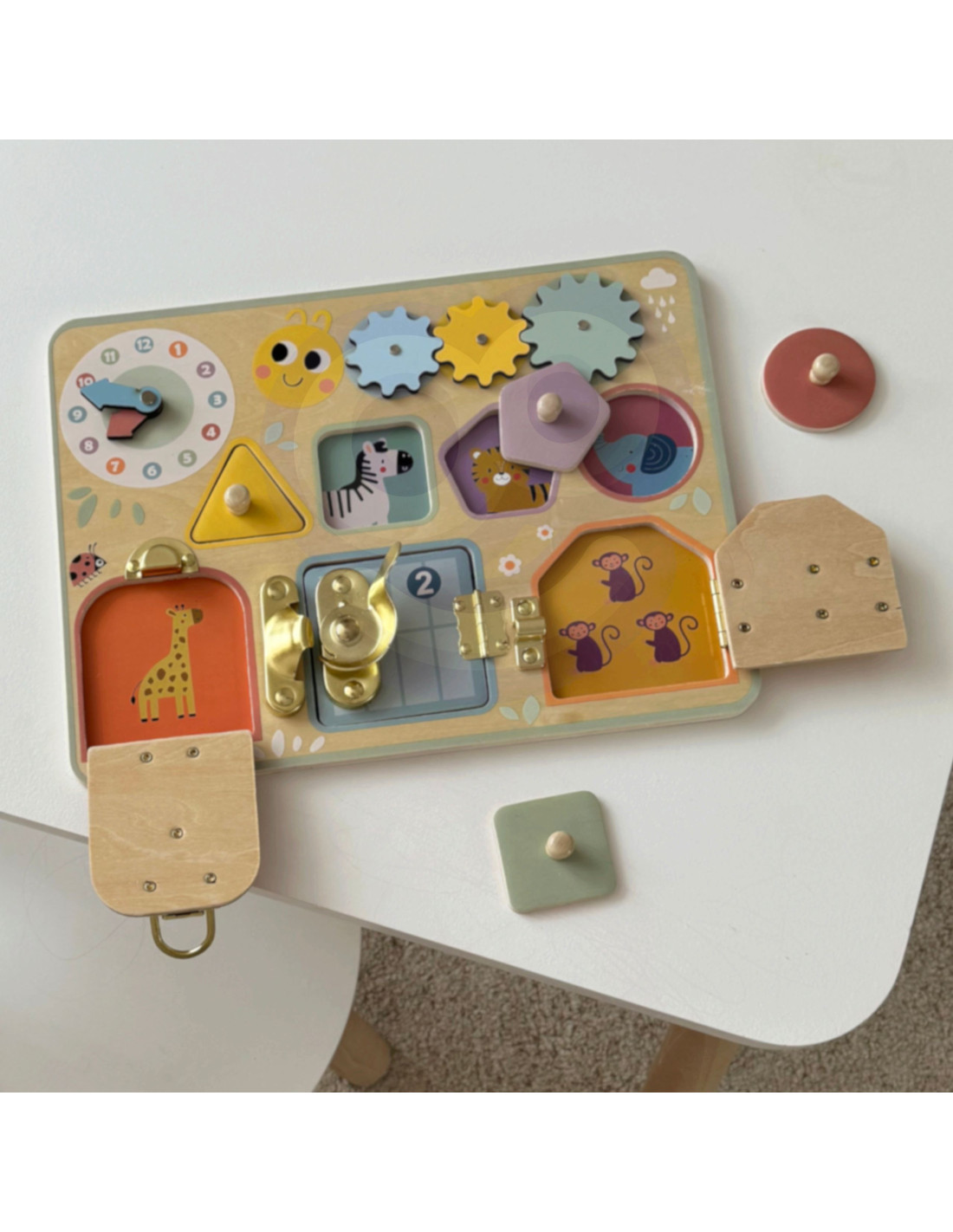 The board consists of a sturdy wooden board with three different locks. Behind them are charming animal pictures that further inspire your little one's imagination. The board also features interactive gears for added fun. Children can freely spin them, developing fine motor skills and developing their perception of light and shadow.