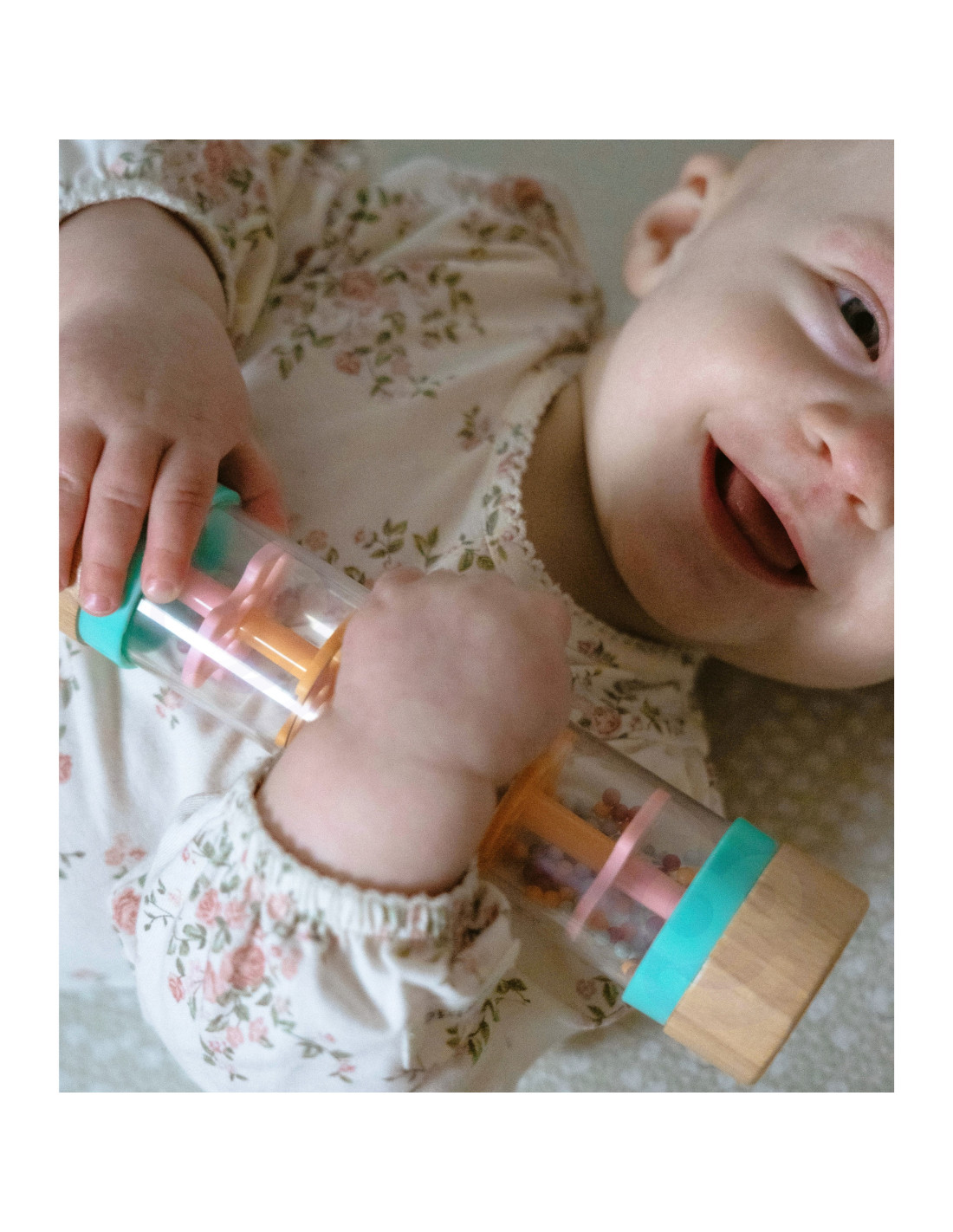 This rain shower with beads that create the soothing sound of falling rain is a toy that brings a lot of joy to the youngest. Shake, turn, and spin, and watch the beads fall from top to bottom. With one quick touch, you can transform this toy into a rattle that rotates 360 degrees. It's great for sensory development and an ideal prop for rhythmic gymnastics classes!