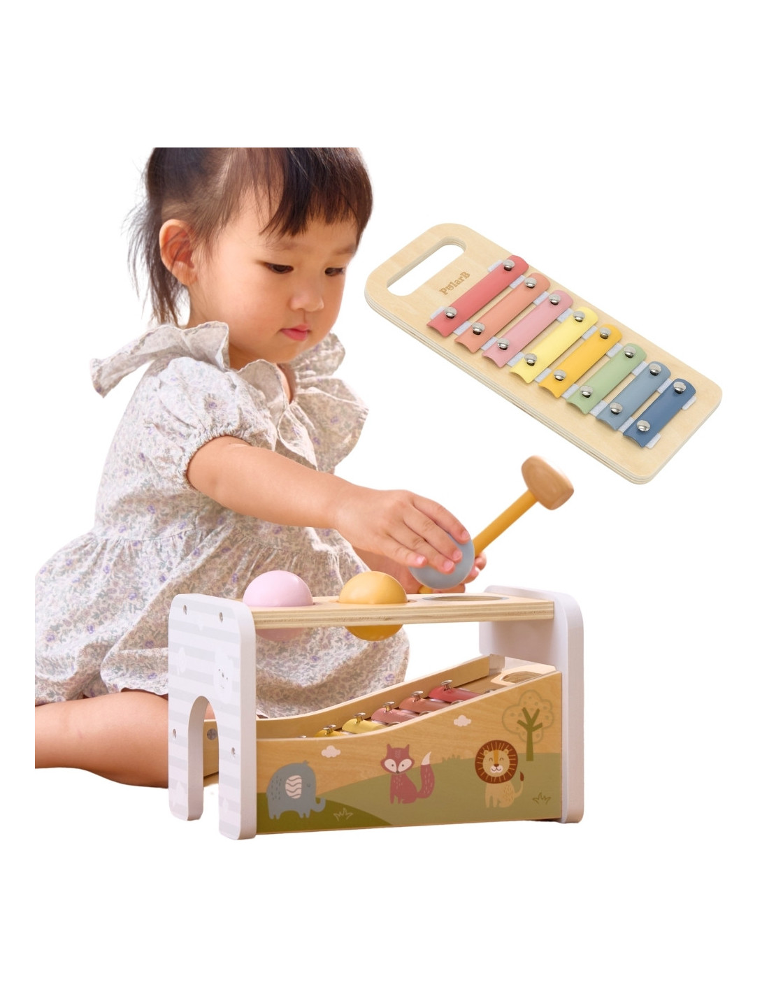 - Two functions in one toy – Hit the balls with the hammer and watch them fall onto the cymbals, making a gentle sound. Or use the stick to create your own melodies with the colorful keys!