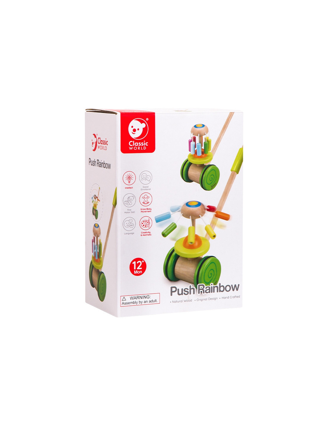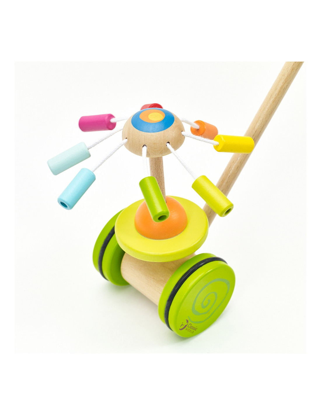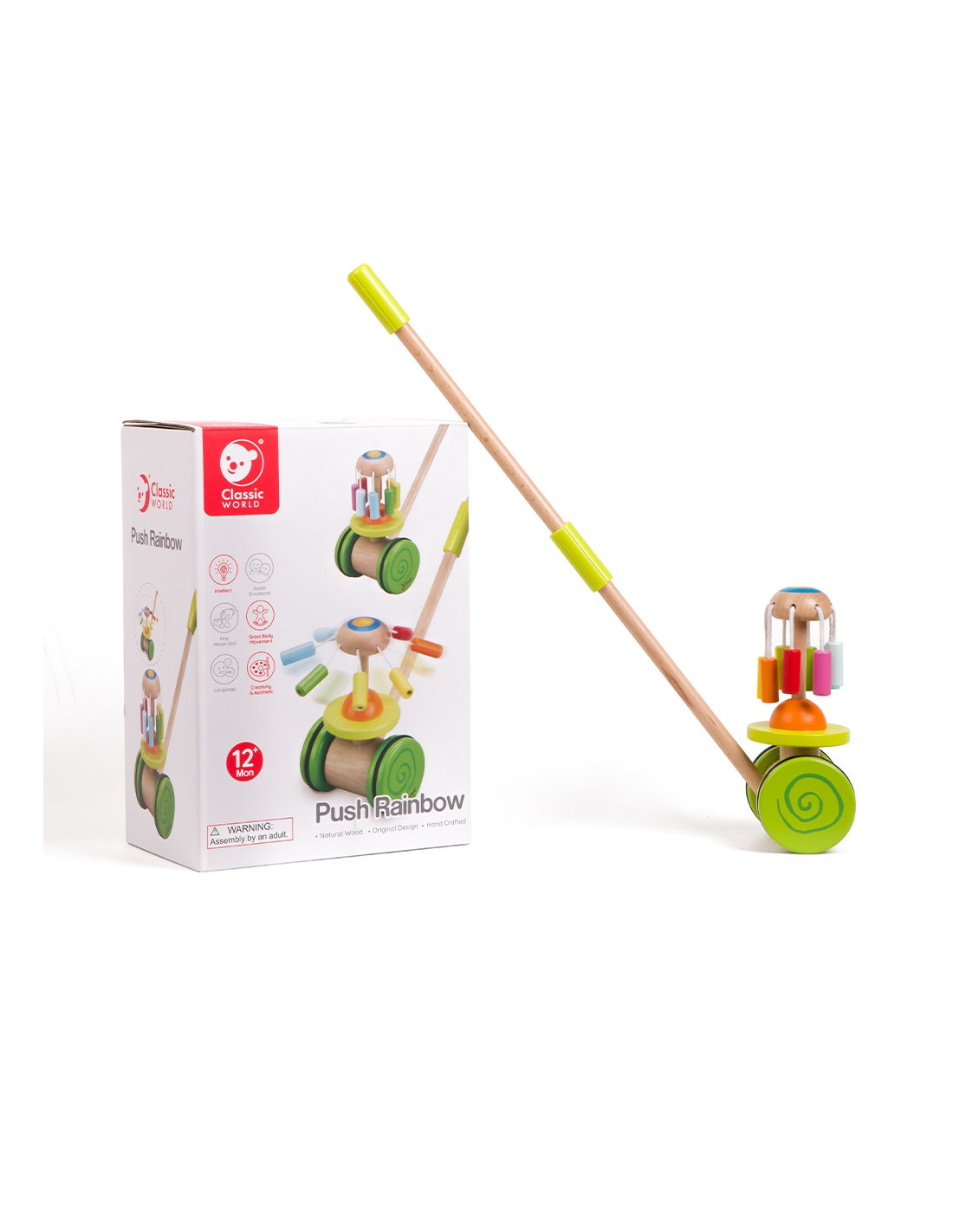 Produkt przeznaczony dla dzieci, które właśnie uczą się stawiać pierwsze kroki. Kolorowy pchacz na pewno zachęci maluszka do doskonalenia techniki chodzenia i umili każdy rodzinny spacer. Dodatkową atrakcją dla malucha jest kolorowa kręcąca karuzelka w kolorach tęczy równocześnie wydająca bardzo przyjemny dźwięk.