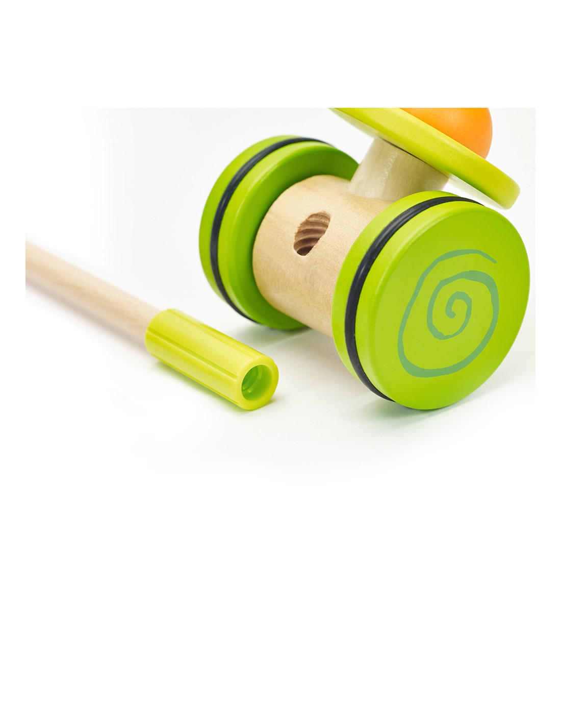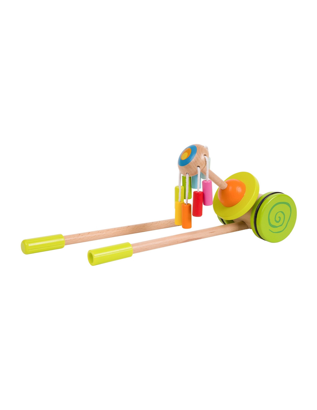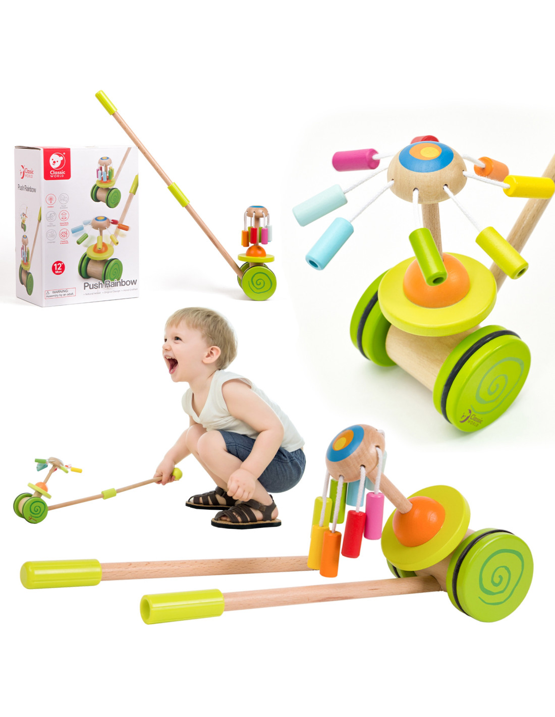 Produkt przeznaczony dla dzieci, które właśnie uczą się stawiać pierwsze kroki. Kolorowy pchacz na pewno zachęci maluszka do doskonalenia techniki chodzenia i umili każdy rodzinny spacer. Dodatkową atrakcją dla malucha jest kolorowa kręcąca karuzelka w kolorach tęczy równocześnie wydająca bardzo przyjemny dźwięk.