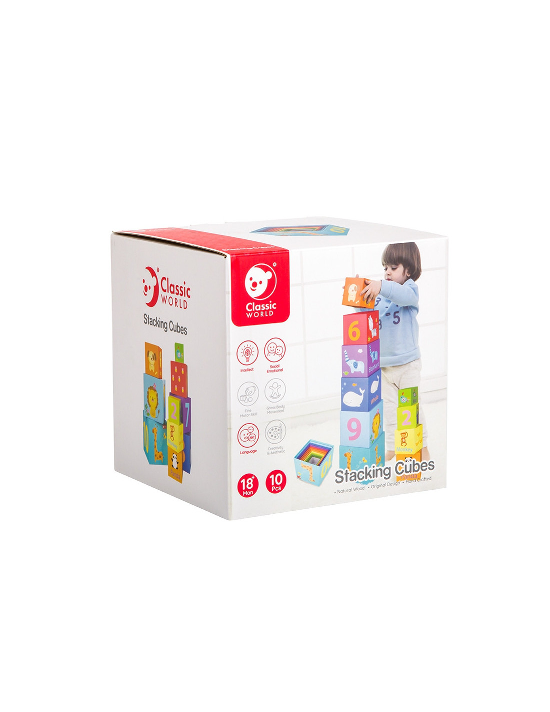 Magic Box drewniane klocki od renomowanej firmy Classic World to świetna zabawa dla najmłodszych pełniąca funkcję układanki, wieży, piramidki oraz pomocy w nauce liczb i podstawowych wyrazów w języku angielskim. Kolorowa, niebanalna zabawka edukacyjna, umożliwiająca fantastyczną, wielowariantową zabawę. Zabawka gwarantuje bezpieczny, wielopoziomowy rozwój maluszka. Bawi i jednocześnie wspiera wysoki poziom integracji czynności percepcyjnych i motorycznych. Wymusza poprawny tok rozumowania przy wykonywaniu ćwiczeń np. budowaniu wieży lub wkładaniu pudełka w coraz mniejsze pudełko. Estetyka wykonania sprawia, że Magic Box mogą się stać elementem dekoracyjnym dziecięcego pokoju, pełniąc funkcję pudełka lub sortera na kredki i inne drobiazgi.