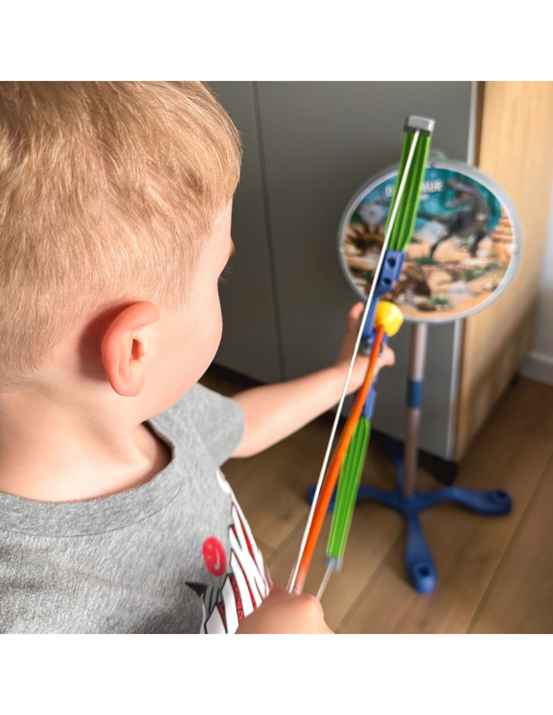 The dinosaur -themed archery set from WOOPIE is a great choice for your little one. The set includes a bow and target, along with three suction-tipped arrows that create the feel of a real arrow. The target features a dinosaur design with various targets and sits on a sturdy base. This toy helps develop hand-eye coordination by hitting the target. All in beautiful, muted colors that are eye-catching and encourage play.