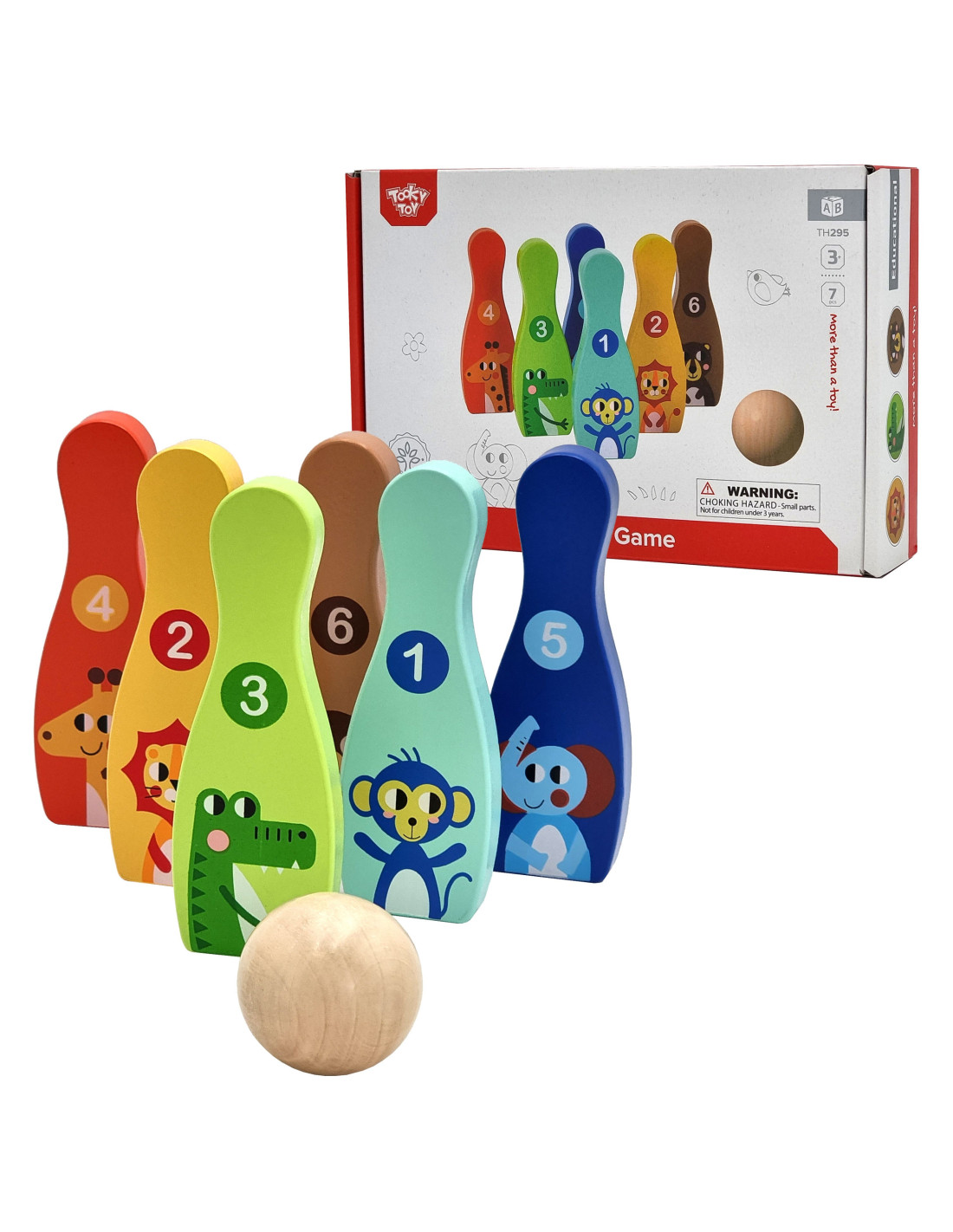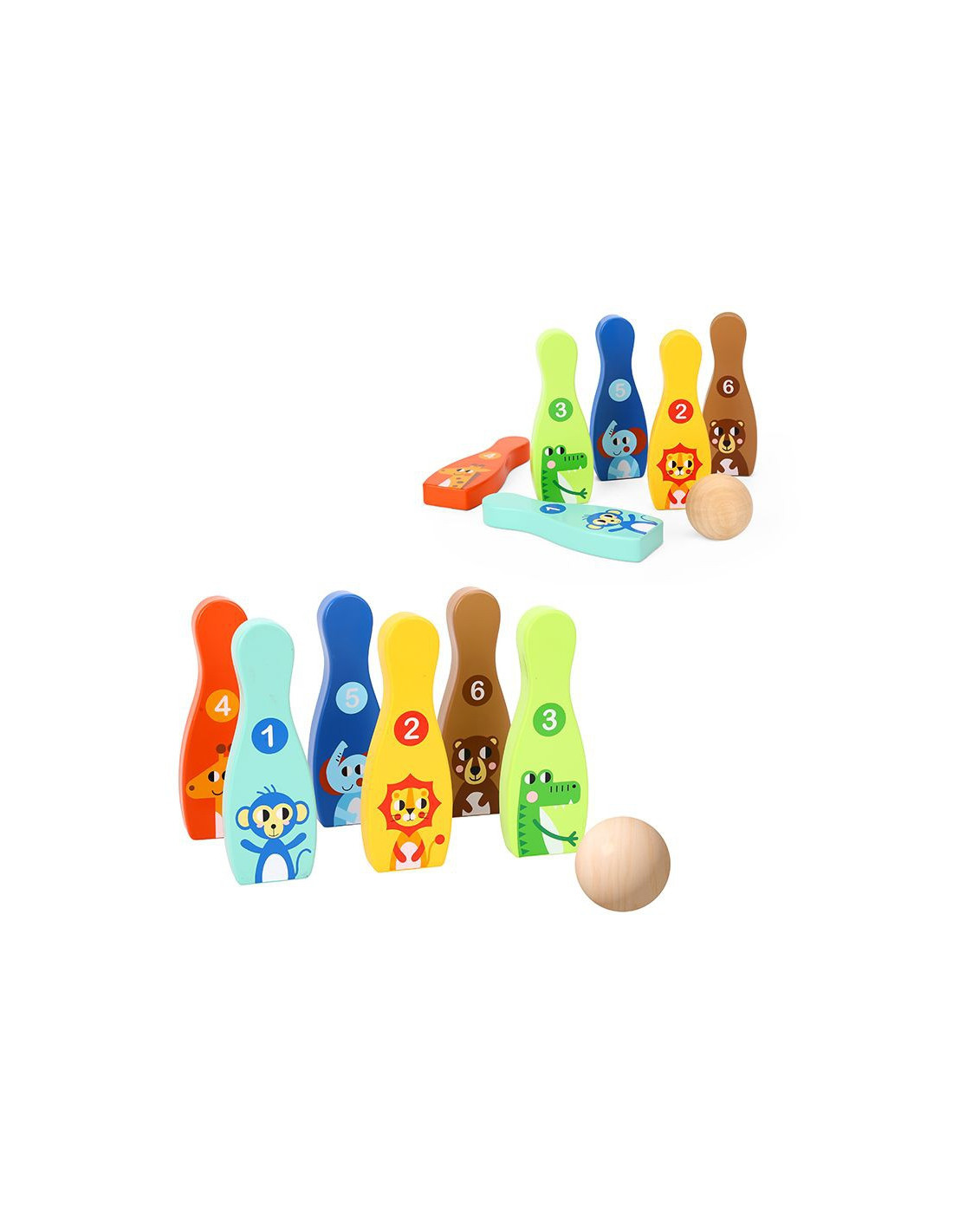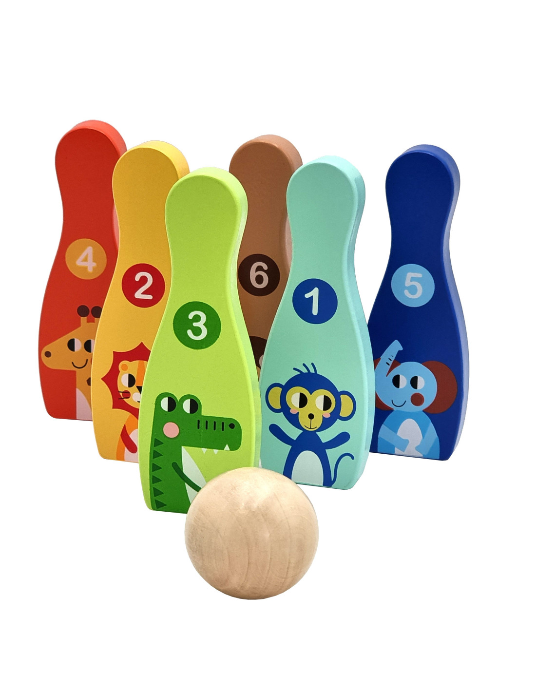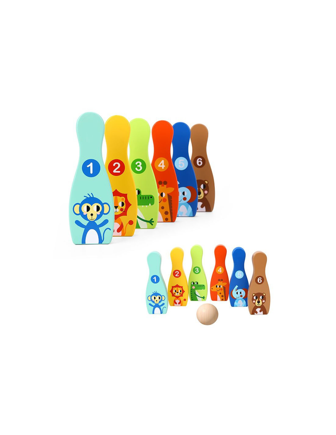 Animal Bowling Pins from TOOKY TOY are everything kids need to develop their motor skills while having fun . The set includes 6 wooden bowling pins and 1 ball. Bowling will be great fun for your little one, but it also provides many educational benefits. This toy develops your child's motor skills through activities such as running and throwing .