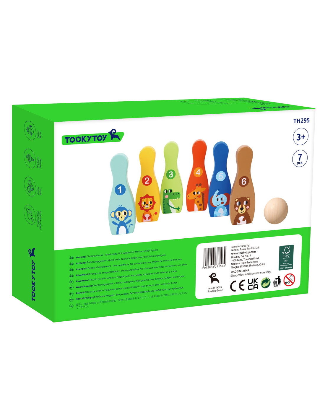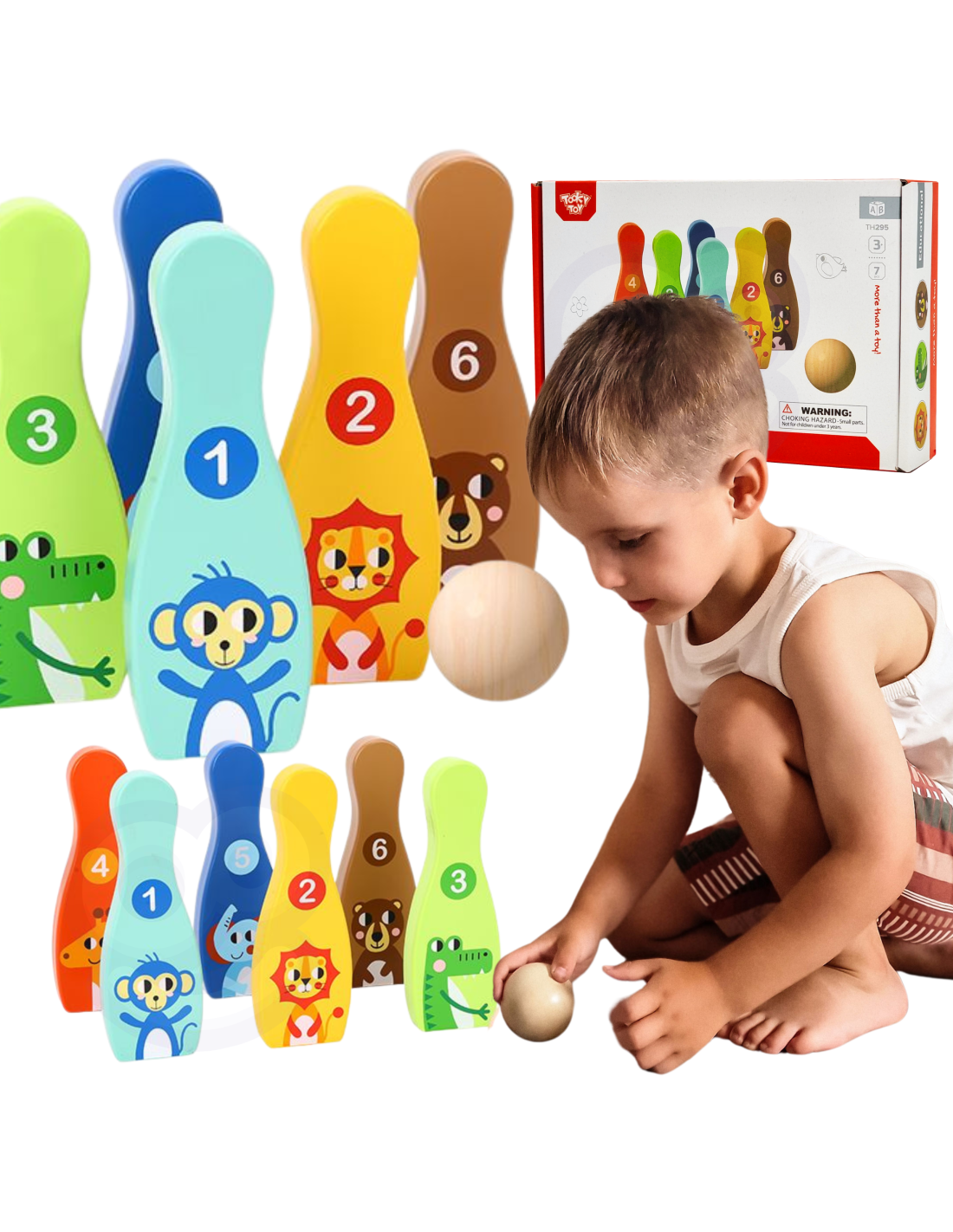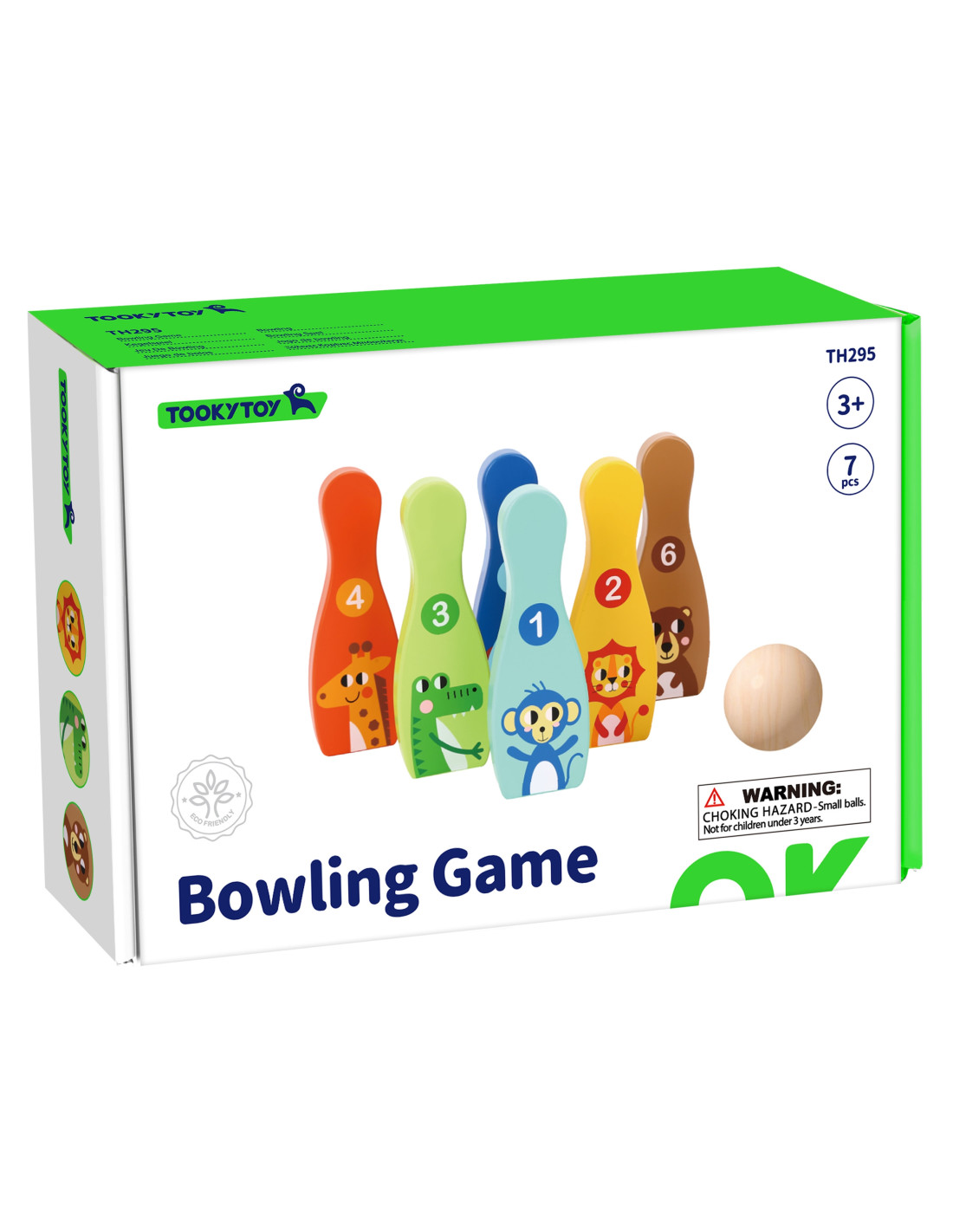 Animal Bowling Pins from TOOKY TOY are everything kids need to develop their motor skills while having fun . The set includes 6 wooden bowling pins and 1 ball. Bowling will be great fun for your little one, but it also provides many educational benefits. This toy develops your child's motor skills through activities such as running and throwing .