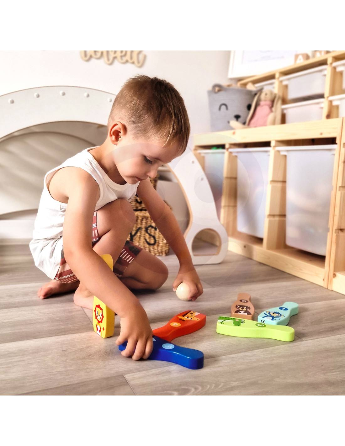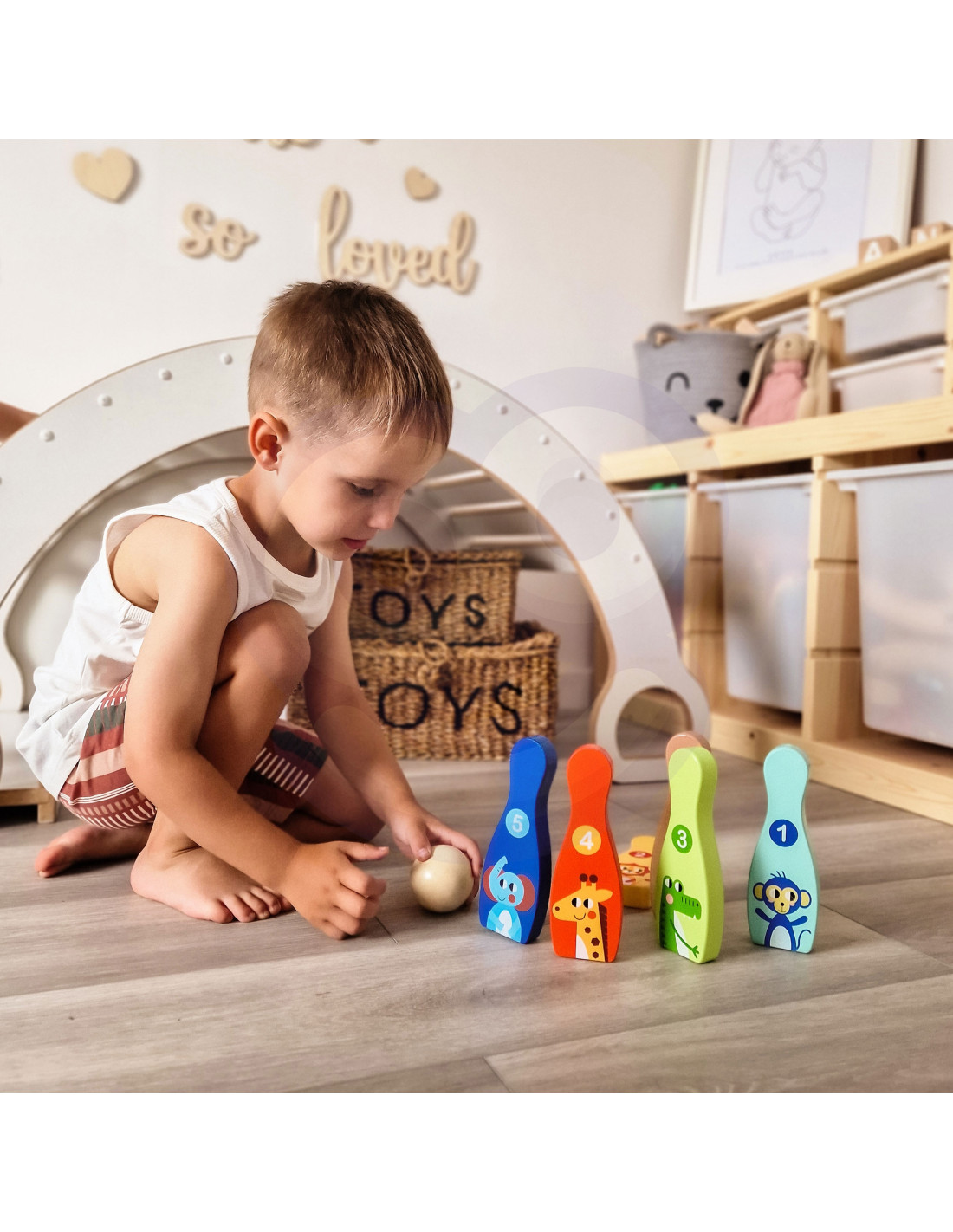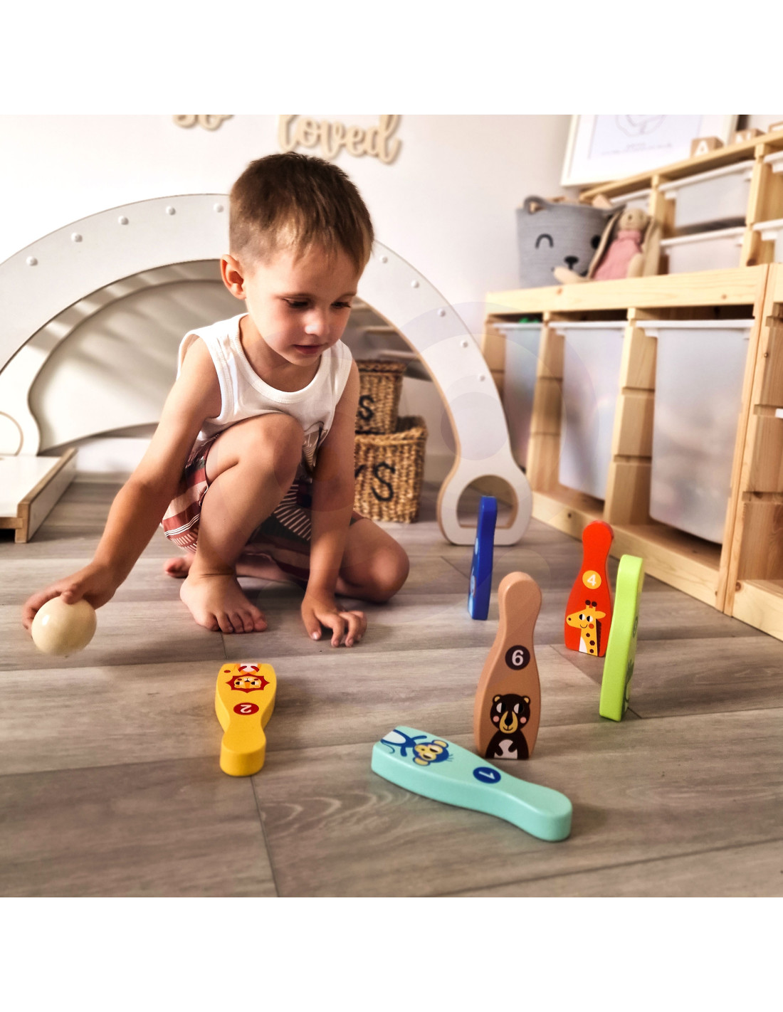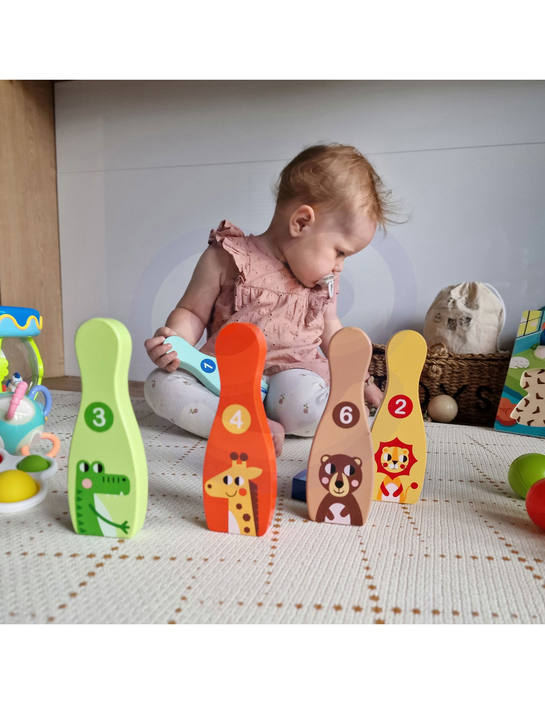 Animal Bowling Pins from TOOKY TOY are everything kids need to develop their motor skills while having fun . The set includes 6 wooden bowling pins and 1 ball. Bowling will be great fun for your little one, but it also provides many educational benefits. This toy develops your child's motor skills through activities such as running and throwing .
