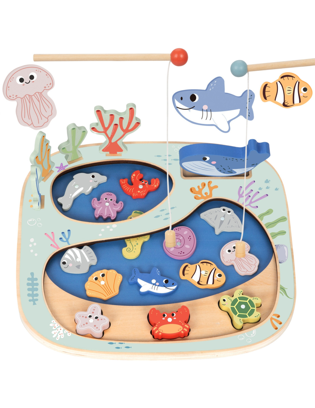 Explore the fascinating world of underwater fun with Ocean Underwater by Tooky Toy . An ocean-themed game that takes classic fishing to the next level. The two-player set includes two fishing rods with magnetic tips for catching colorful sea creatures . The game is made even more exciting by hidden creatures that can be hidden in one of the two rock pools on the board – discover them by shuffling the board or using the fishing rod to fish them out.
