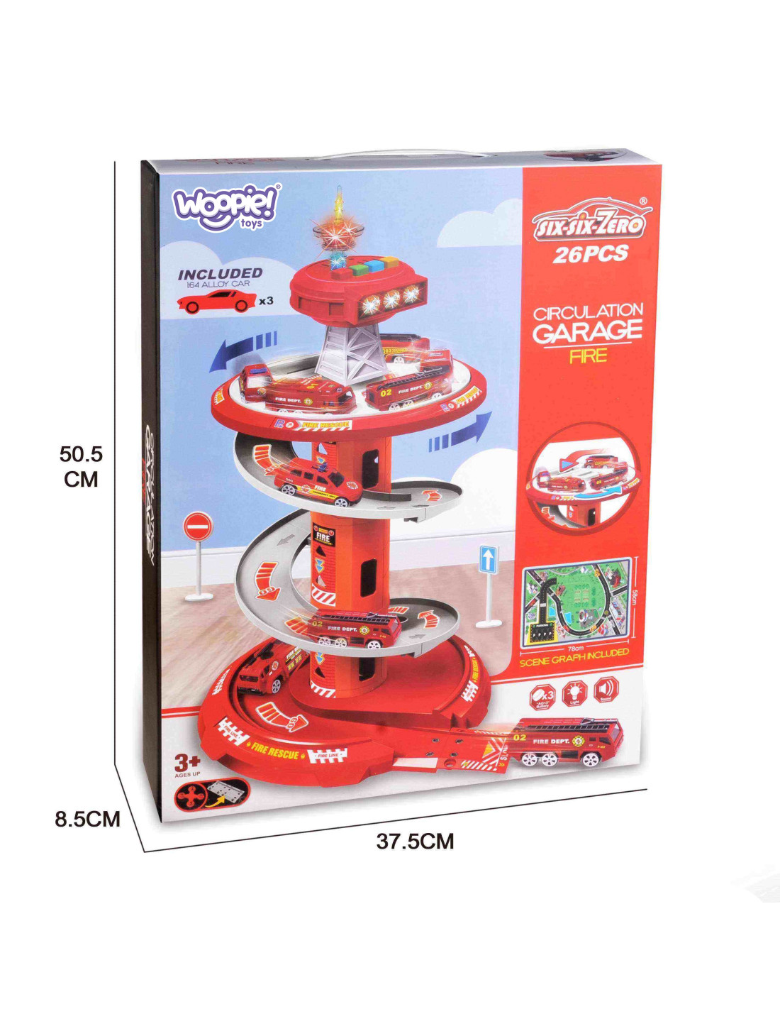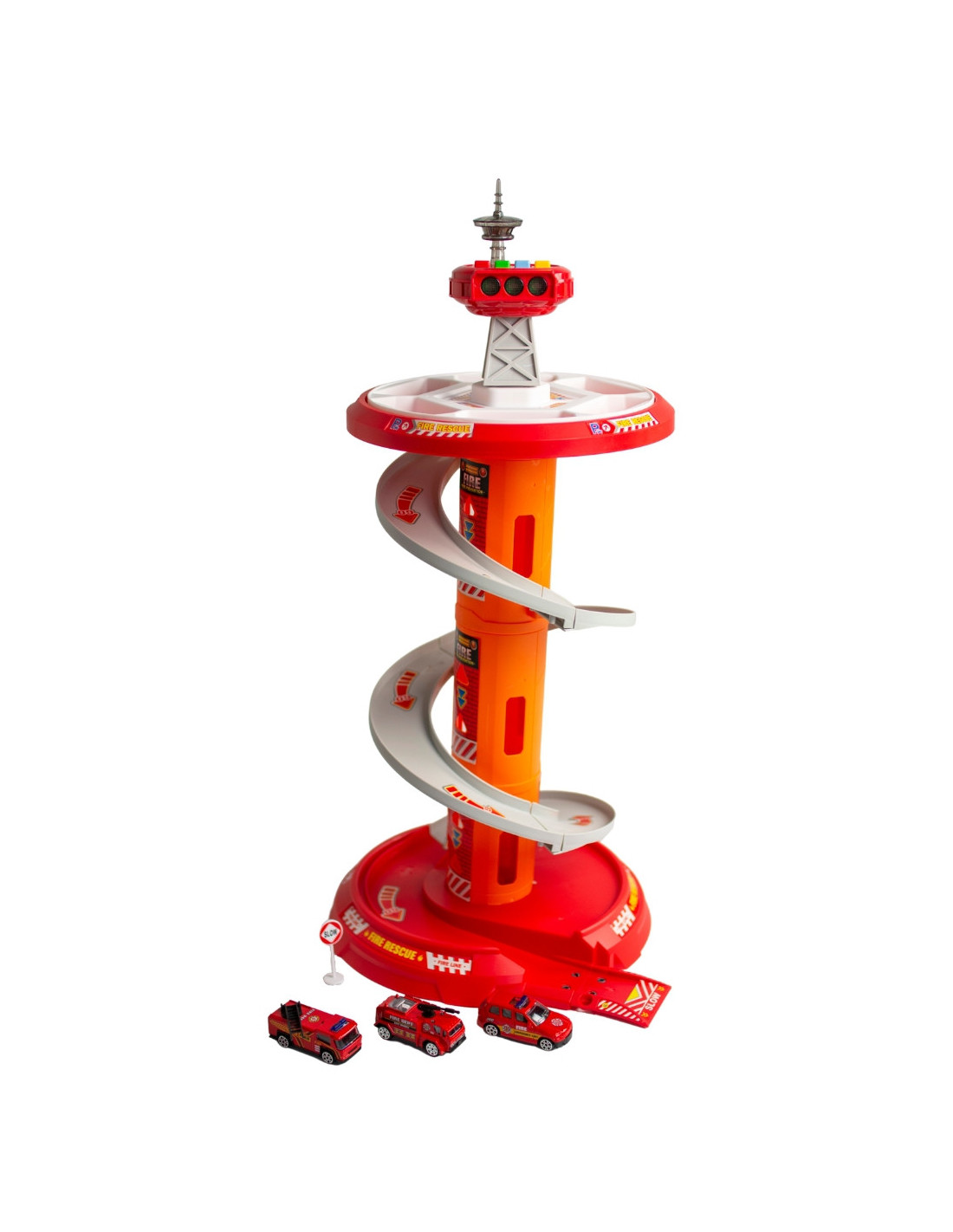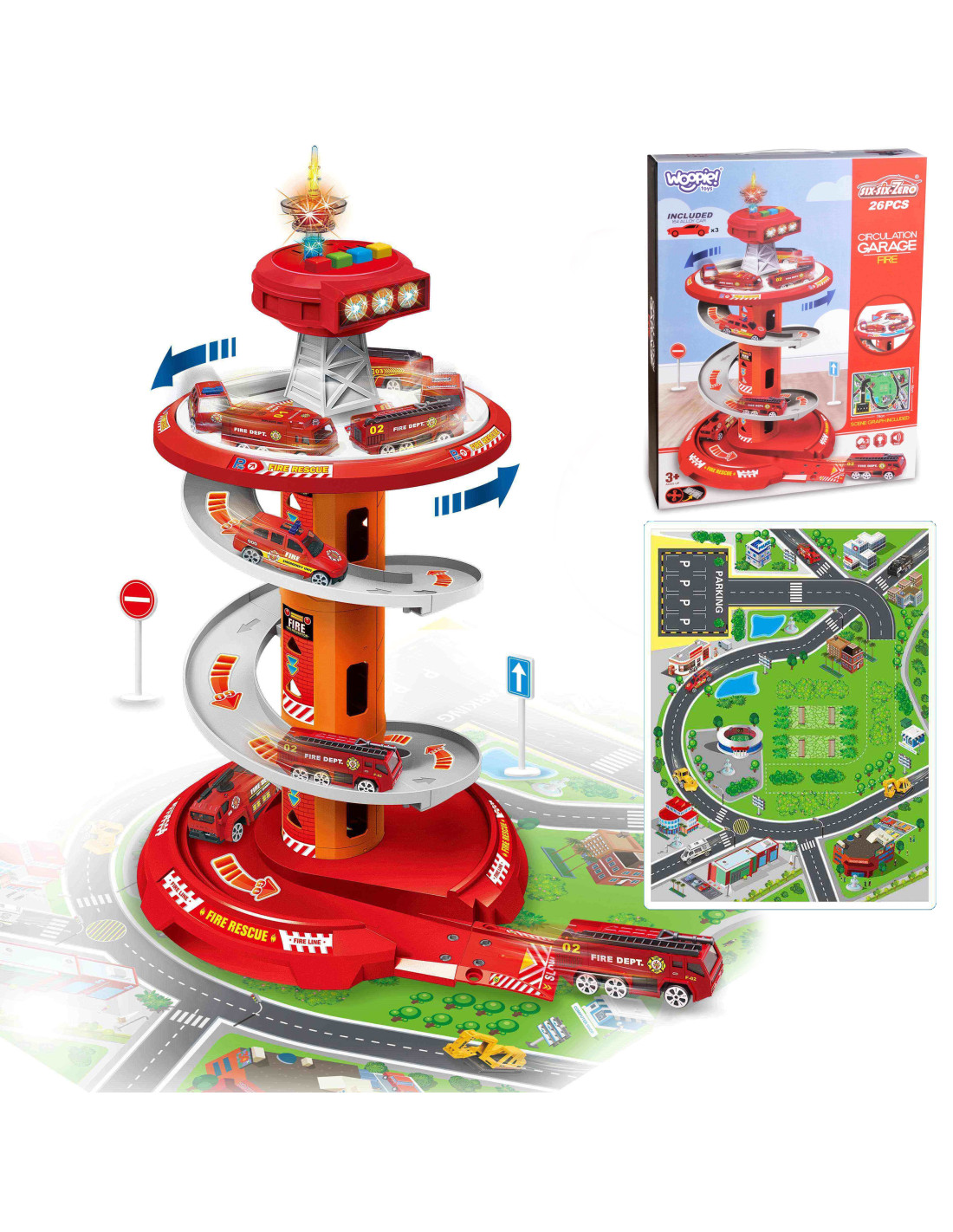 This fantastic multi-story rotating garage for the Fire Department from Woopie is sure to be a hit with any child. This toy will spark the imagination of any fire department fan, who, after leaving the parking lot, enters the included road . A special, winding descent allows for the cars to quickly descend from each level. The set also includes three different fire trucks .