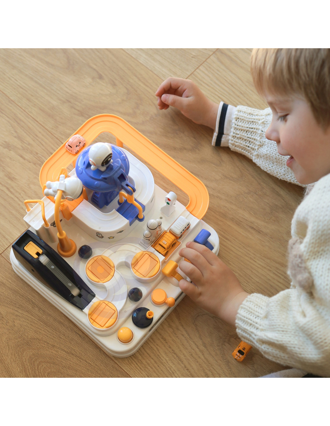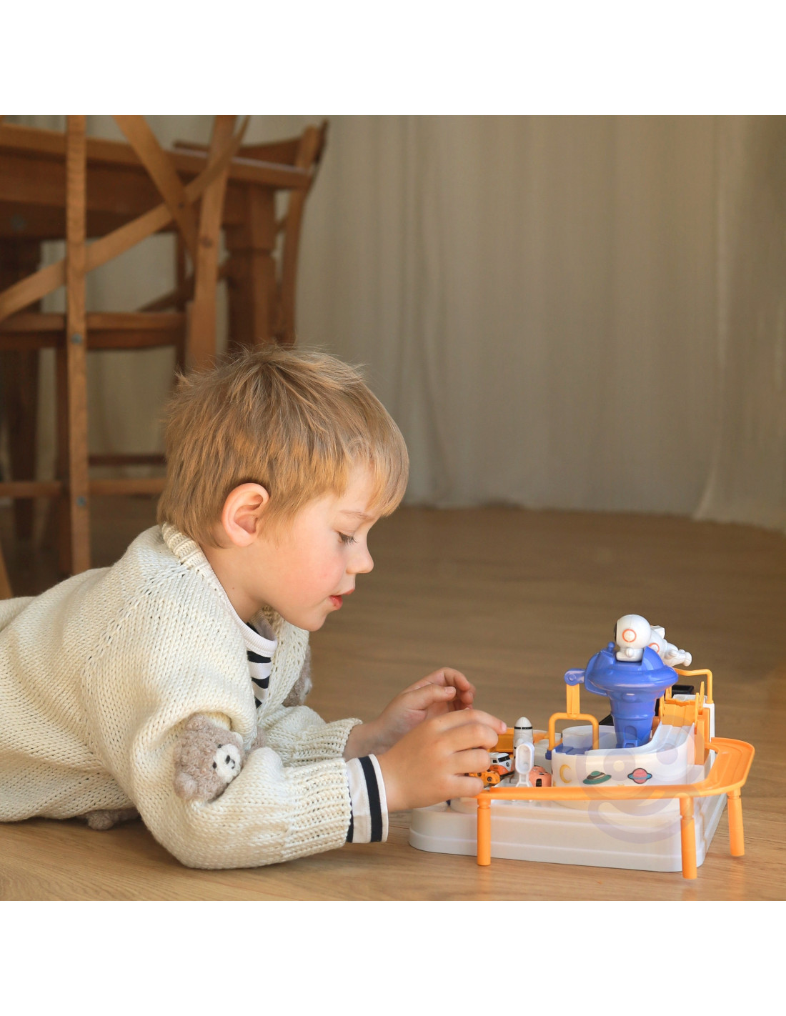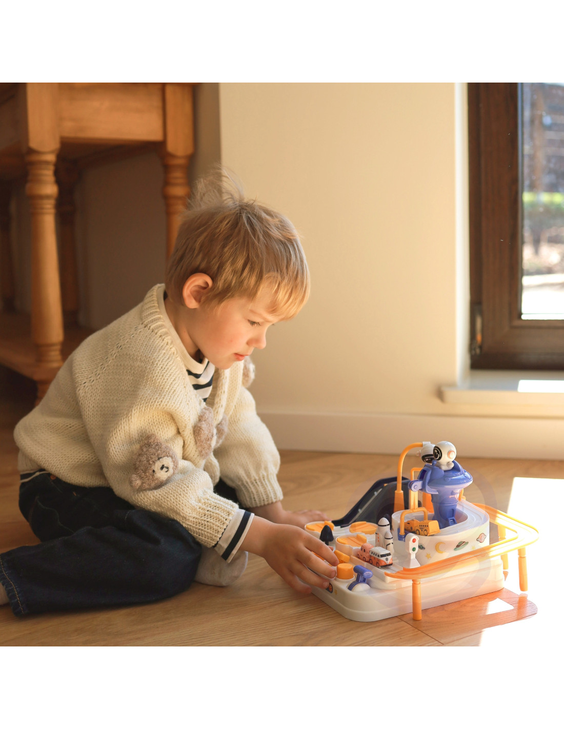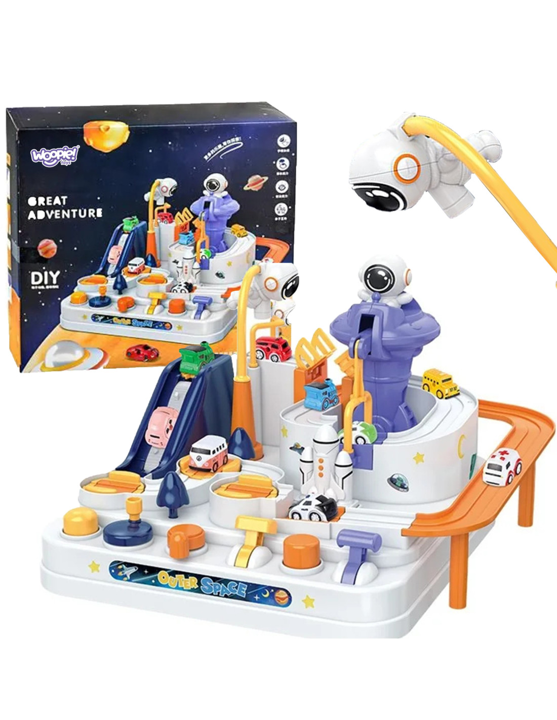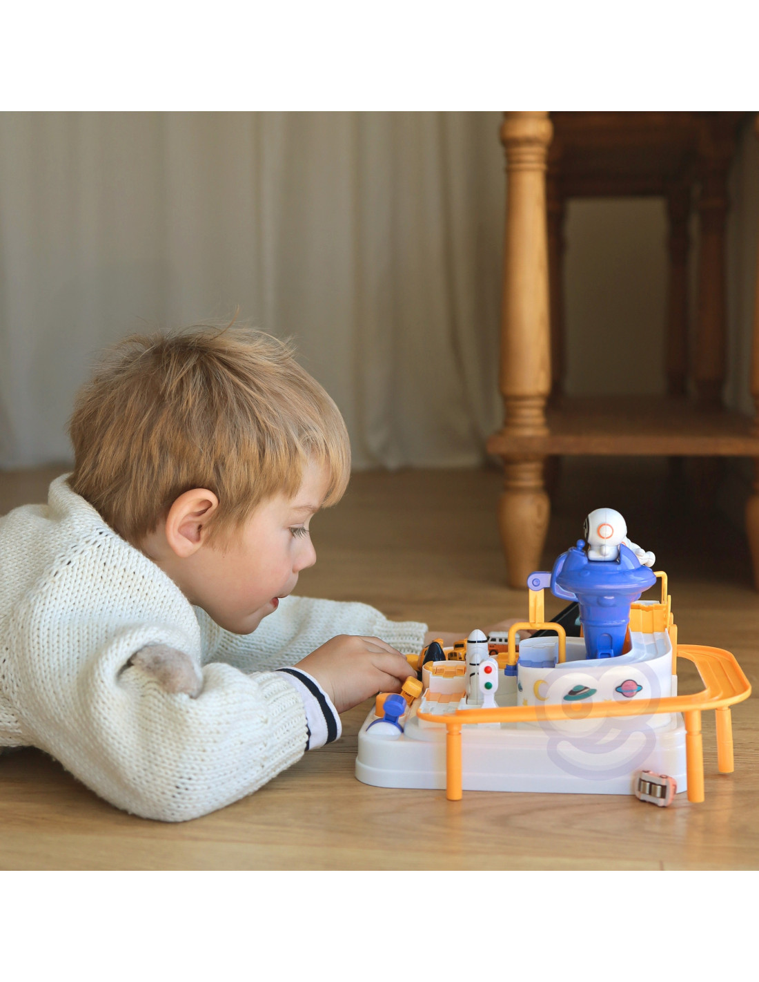 The " Astronaut Adventure " interactive obstacle course is a unique gift for little explorers who crave exciting adventures and unforgettable challenges. It's more than just a toy—it's a real arena where children can take on the role of drivers and overcome various obstacles. Thanks to its clever design and diverse elements, the toy offers unforgettable moments full of excitement and challenges. It's the perfect tool for developing imagination and manual skills , while also providing tons of fun. The car track offers not only rides but also dynamic , interactive elements operated with buttons and knobs. It's an exciting game that requires focus and dexterity. The set includes three cars that can freely explore the track, depending on the child's imagination. The vehicles will diversify the fun or allow children to compete along the route. Driving through the track seems easy, but numerous elements, such as gears and drawbridges , will make the journey adrenaline-filled .