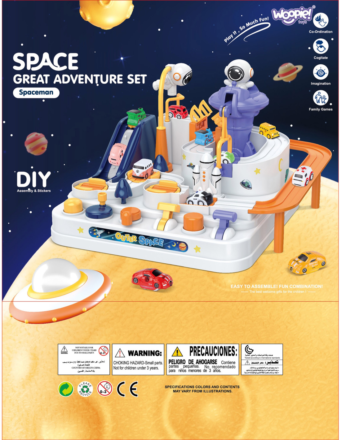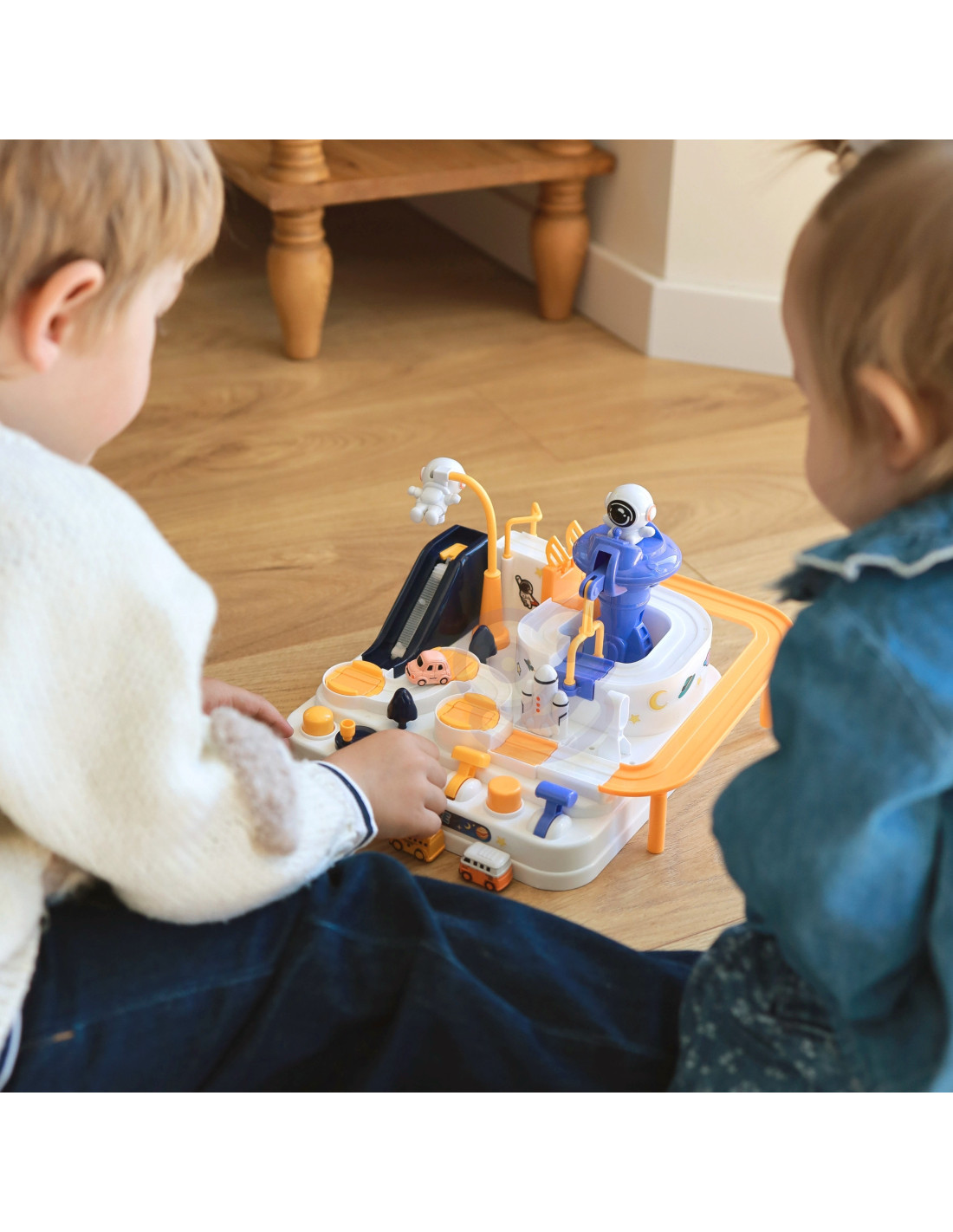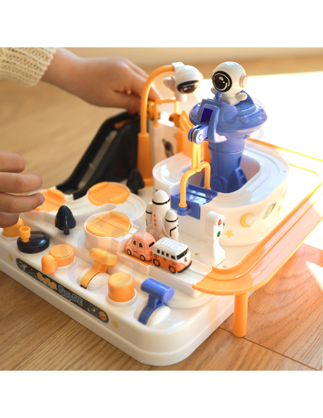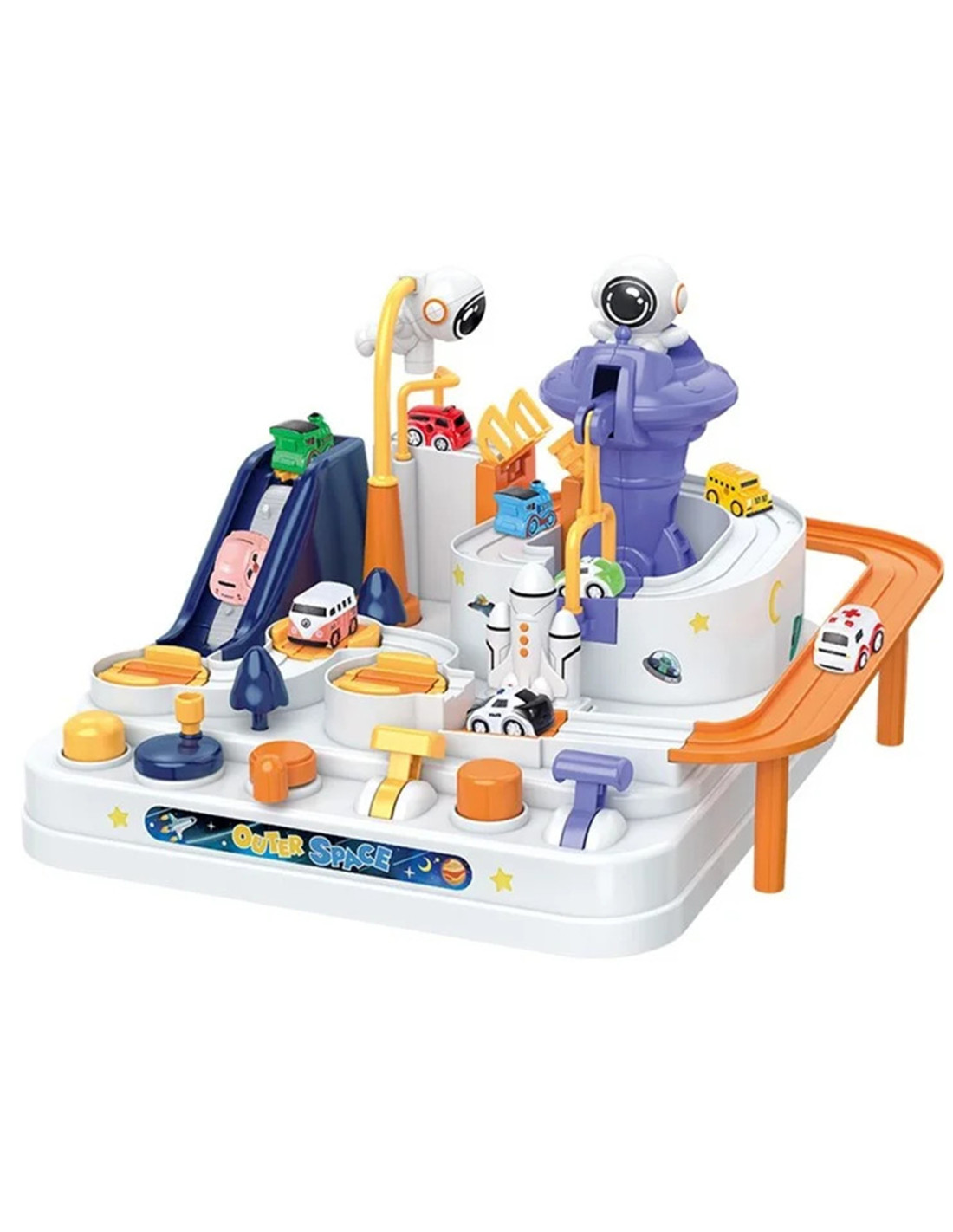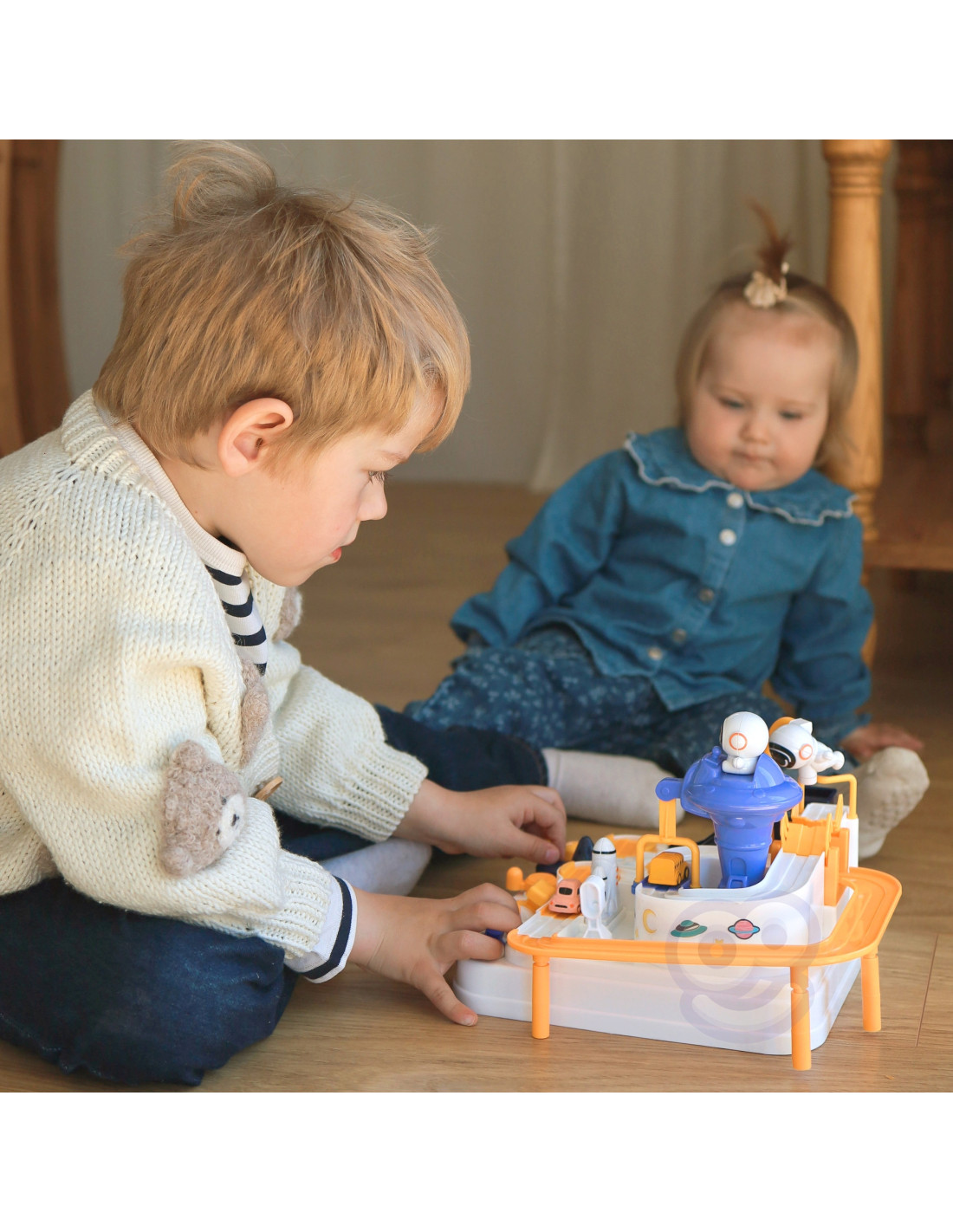 The " Astronaut Adventure " interactive obstacle course is a unique gift for little explorers who crave exciting adventures and unforgettable challenges. It's more than just a toy—it's a real arena where children can take on the role of drivers and overcome various obstacles. Thanks to its clever design and diverse elements, the toy offers unforgettable moments full of excitement and challenges. It's the perfect tool for developing imagination and manual skills , while also providing tons of fun. The car track offers not only rides but also dynamic , interactive elements operated with buttons and knobs. It's an exciting game that requires focus and dexterity. The set includes three cars that can freely explore the track, depending on the child's imagination. The vehicles will diversify the fun or allow children to compete along the route. Driving through the track seems easy, but numerous elements, such as gears and drawbridges , will make the journey adrenaline-filled .