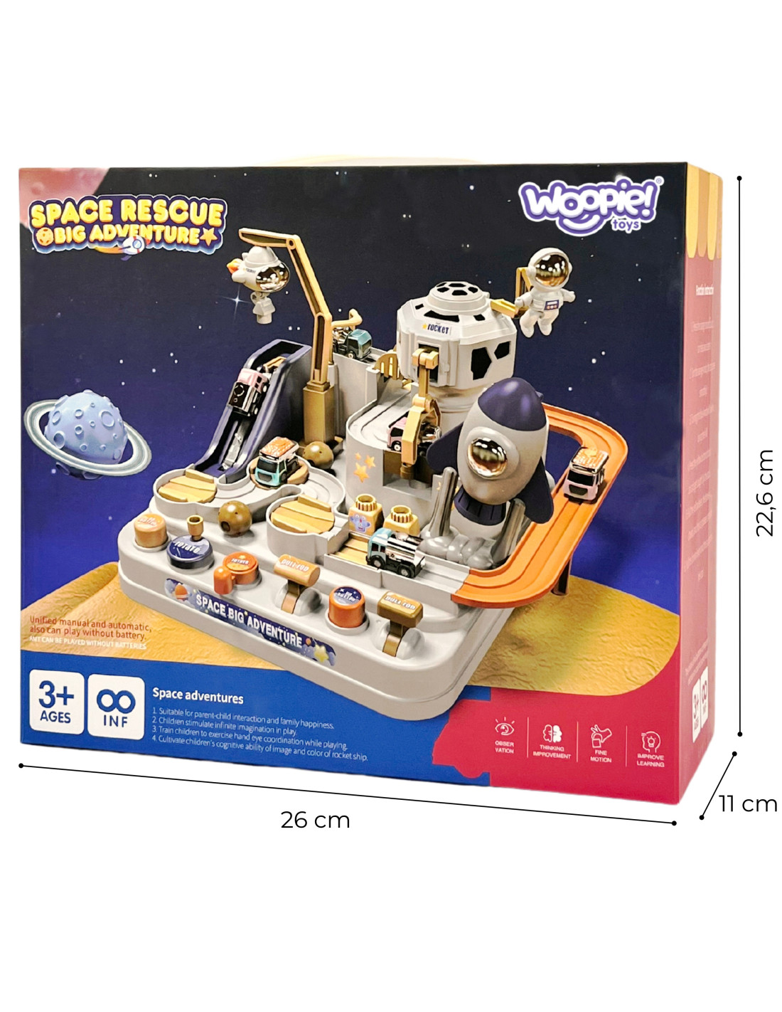 The "Astronaut's Space Adventure" interactive obstacle course is a unique gift for young explorers who crave exciting adventures and unforgettable challenges. It's more than just a toy—it's a real arena where children can take on the role of drivers and overcome various obstacles. Thanks to its clever design and diverse elements, the toy offers unforgettable moments full of excitement and challenges. It's the perfect tool for developing imagination and manual skills , while also providing tons of fun. The car track offers not only rides but also dynamic , interactive elements operated with buttons and knobs. It's an exciting game that requires focus and dexterity. The set includes three cars that can freely explore the track, depending on the child's imagination. The vehicles will diversify the fun or allow children to compete along the route. Driving through the track seems easy, but numerous elements, such as gears and drawbridges , will make the journey adrenaline-filled .
